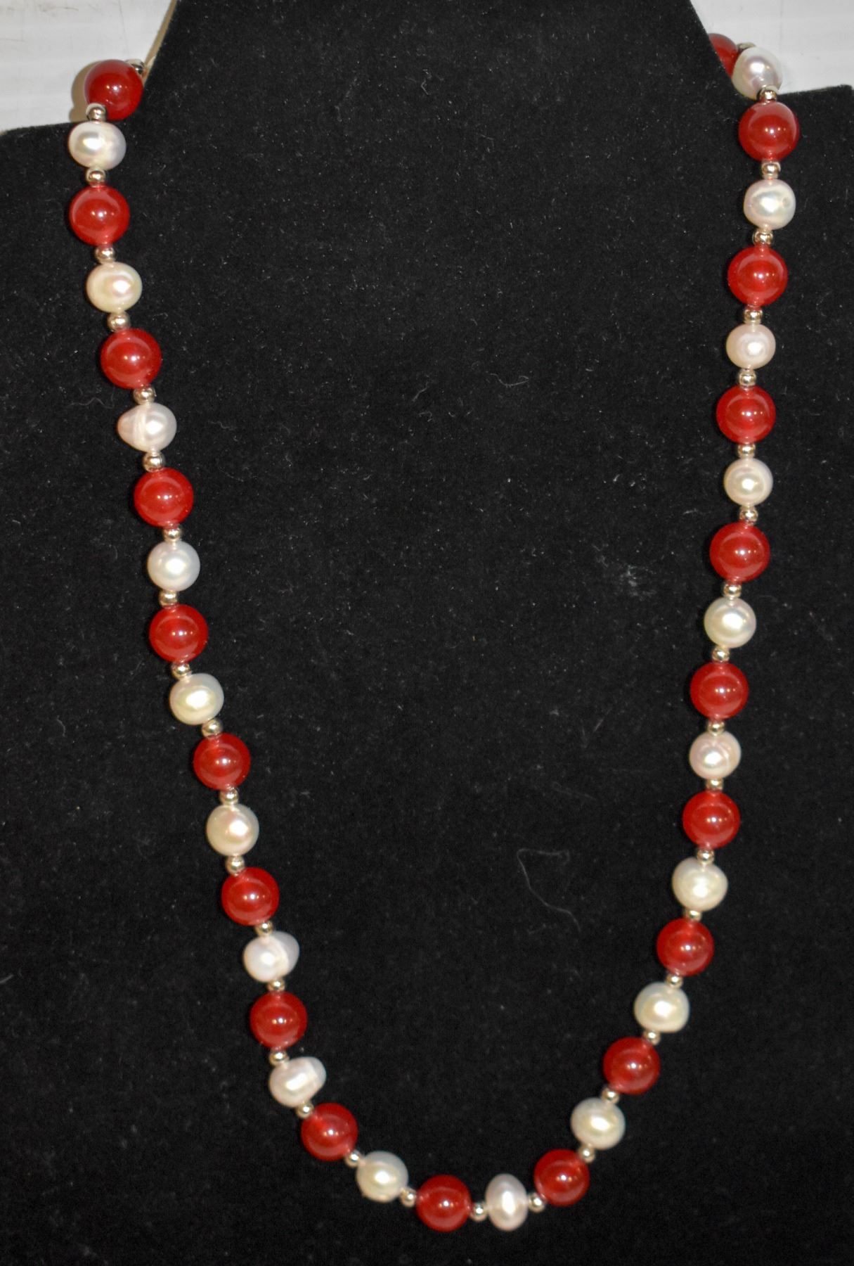 #260-FRESH WATER PEARL & RED JADE BEAD NECKLACE