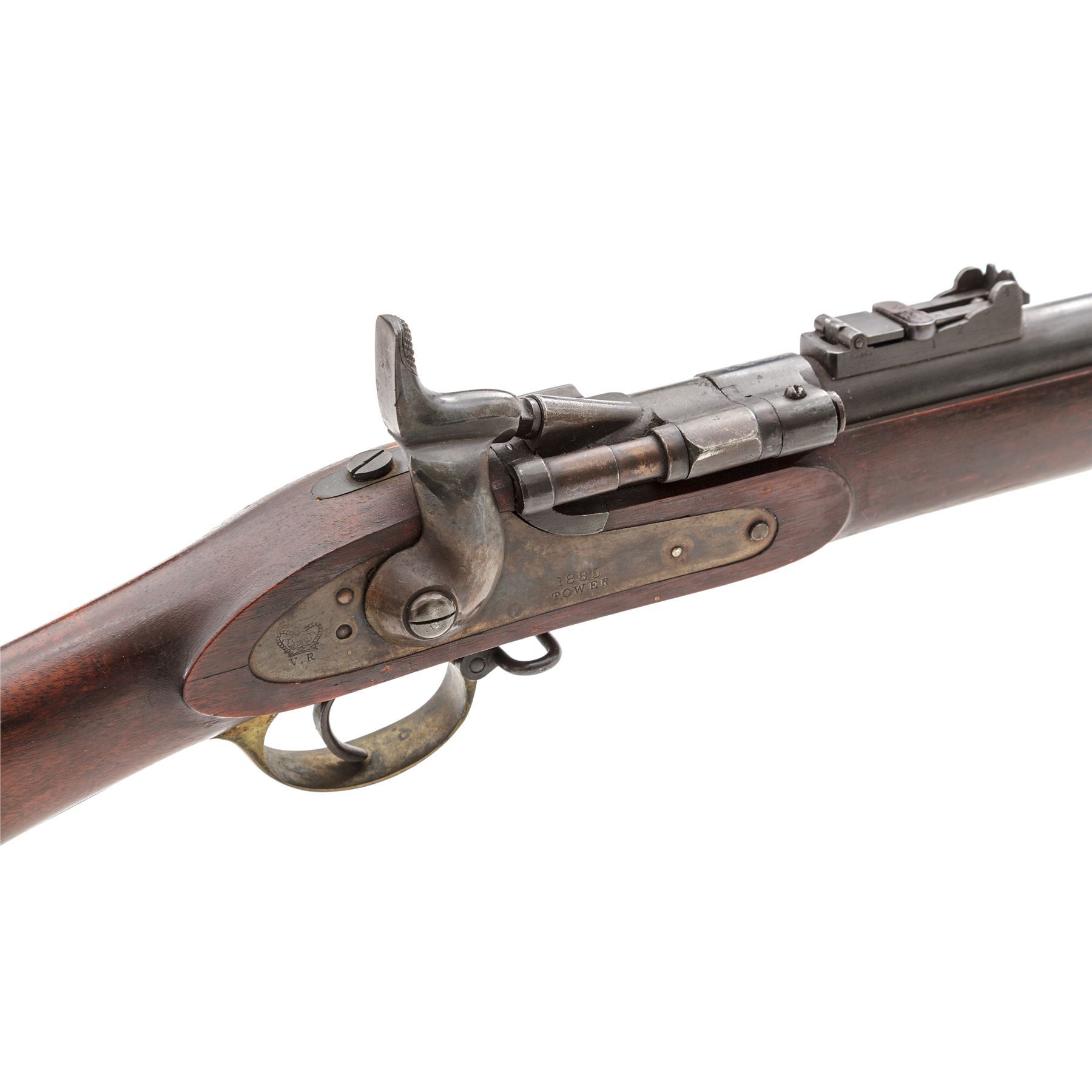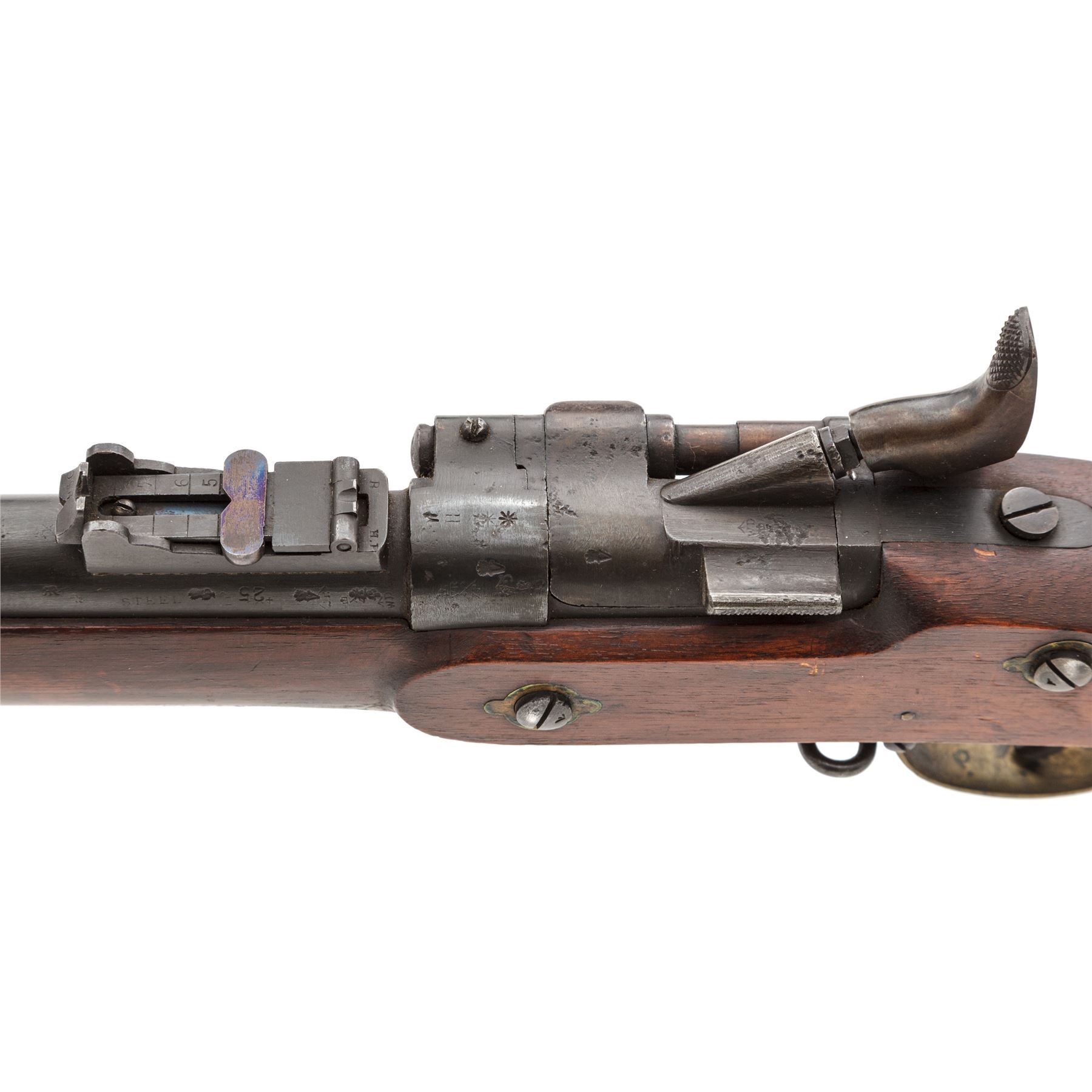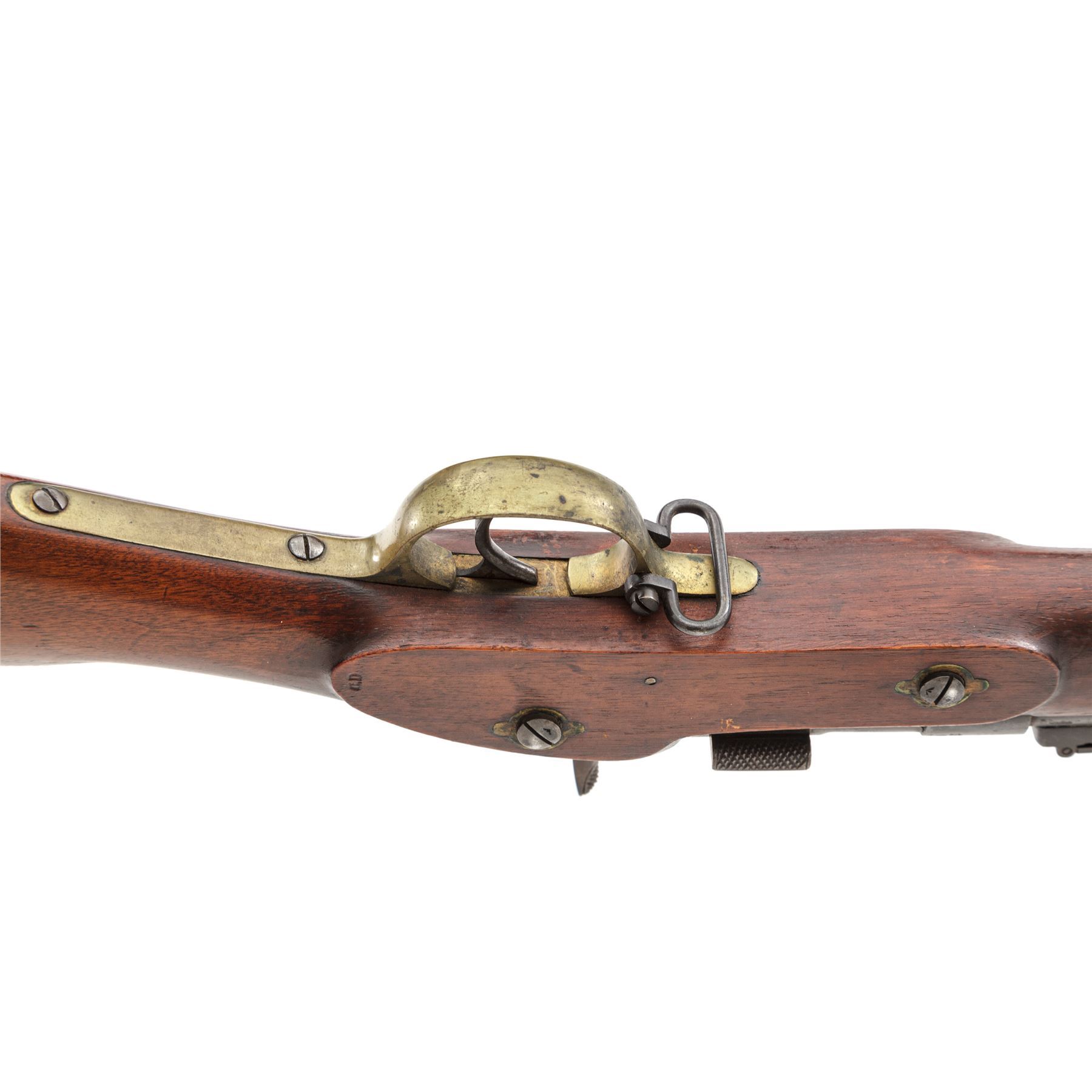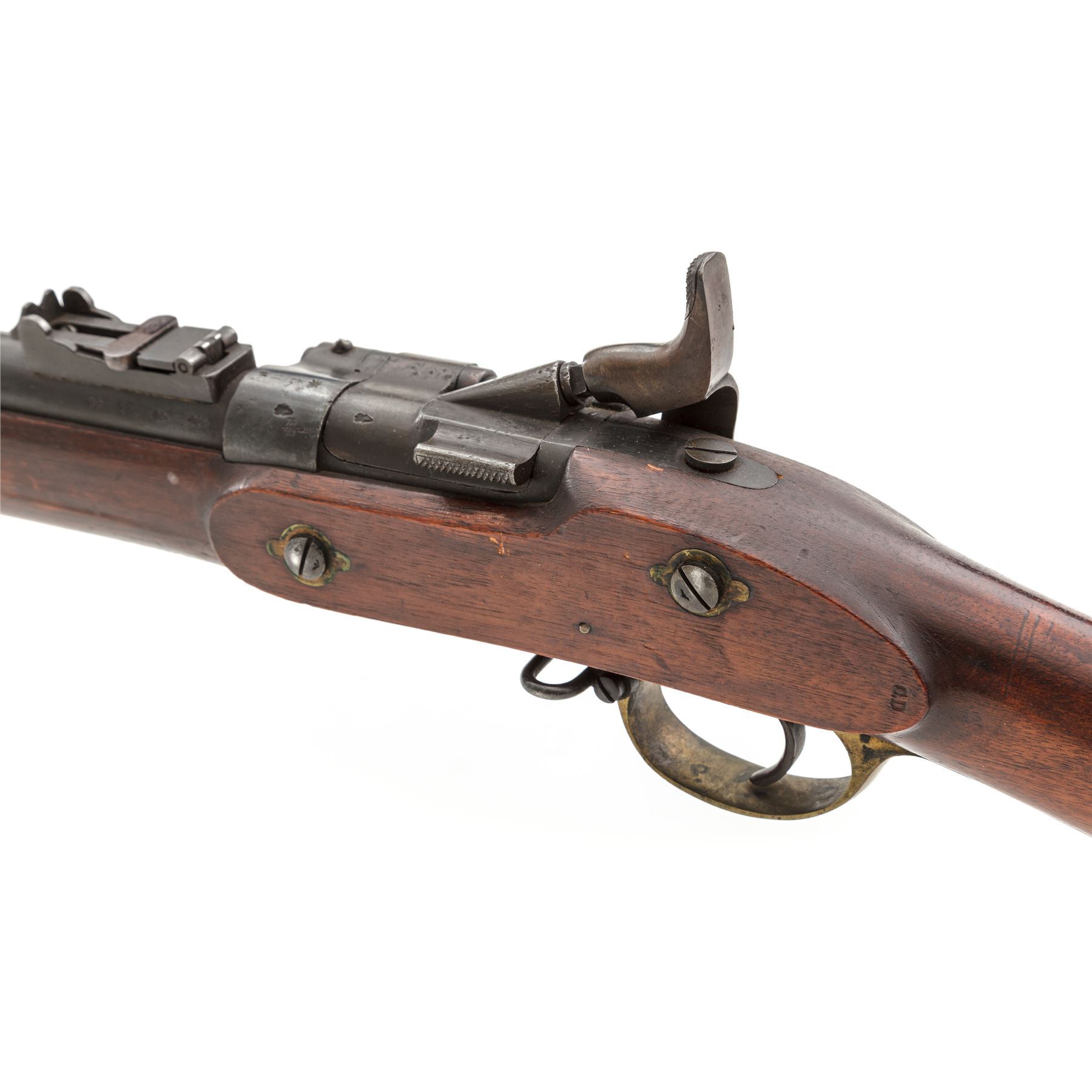 British Snider Conversion Infantry Rifle, marked Tower, NVSN, .577 Boxer CF cal., 37'' barrel is marked ''Steel'' and with numerous view and proofmarks at left breech, as is receiver; flush steel lockplate marked ''(crown)/V.R'' behind hammer and ''1885/Tower'' ahead; three steel barrel bands (top with sling swivel), sling swivel at front of brass triggerguard, brass buttplate and two lock screw escutcheons, brass nose cap, and slotted/grooved steel cleaning rod. Integral block-blade front and adjustable sliding-leaf rear sights. Nicely figured one-piece European walnut fullstock. Condition is fine showing approx. 85% original blue finish to barrel, pronounced case colors to lockplate, gunmetal gray receiver, and light patina to brass. Smooth and sound stock is marked ''G.D'' to rear of raised area opposite lock. Action is tight and crisp; bore is shiny with distinct rifling. As did most militaries in the late 1860s and early 1870s, Britain chose to adapt many of its obsolete P-1853 percussion arms to the new metallic cartridge system. The highly successful Snider conversion (invented by American Jacob Snider) utilizes a simple side-hinged breechblock with a floating firing pin. Est.: $1,000-$1,500. (Antique)