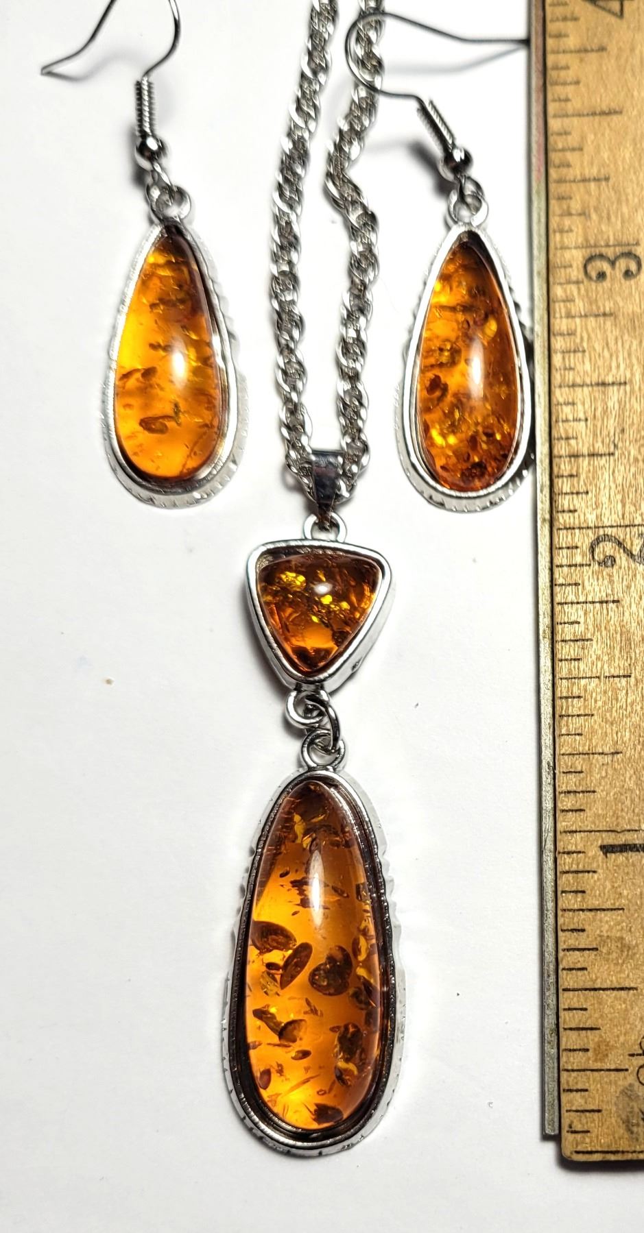 FAUX AMBER DROP EARRINGS AND MATCHING PENDANT ON 18" CHAIN. JEWELERY