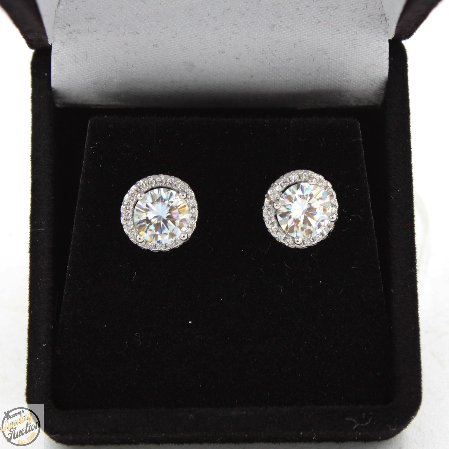 CUT MOISSANITE STONES VVS D COLOR WITH 40 ROUND BRILLIANT CUT CUBIC ZIRCONIA SET IN ROUND HALOS SET IN 925 SILVER EARRINGS WITH SCREW BACKS RETAIL VALUE $950.00 **ALL ITEMS MUST BE REMOVED BY 5PM SATURDAY, AUGUST 9 2025. ALL REMAINING ITEMS WILL BE SUBJECT TO A $6.00 PER DAY STORAGE CHARGE. ANY ITEMS REMAINING AFTER MONDAY, AUGUST 25TH 2025 WILL BE CONSIDERED FORFEITED. NO REFUNDS WILL BE ISSUED FOR FORFEITED ITEMS. TO SCHEDULE A PICK UP APPOINTMENT CLICK HERE