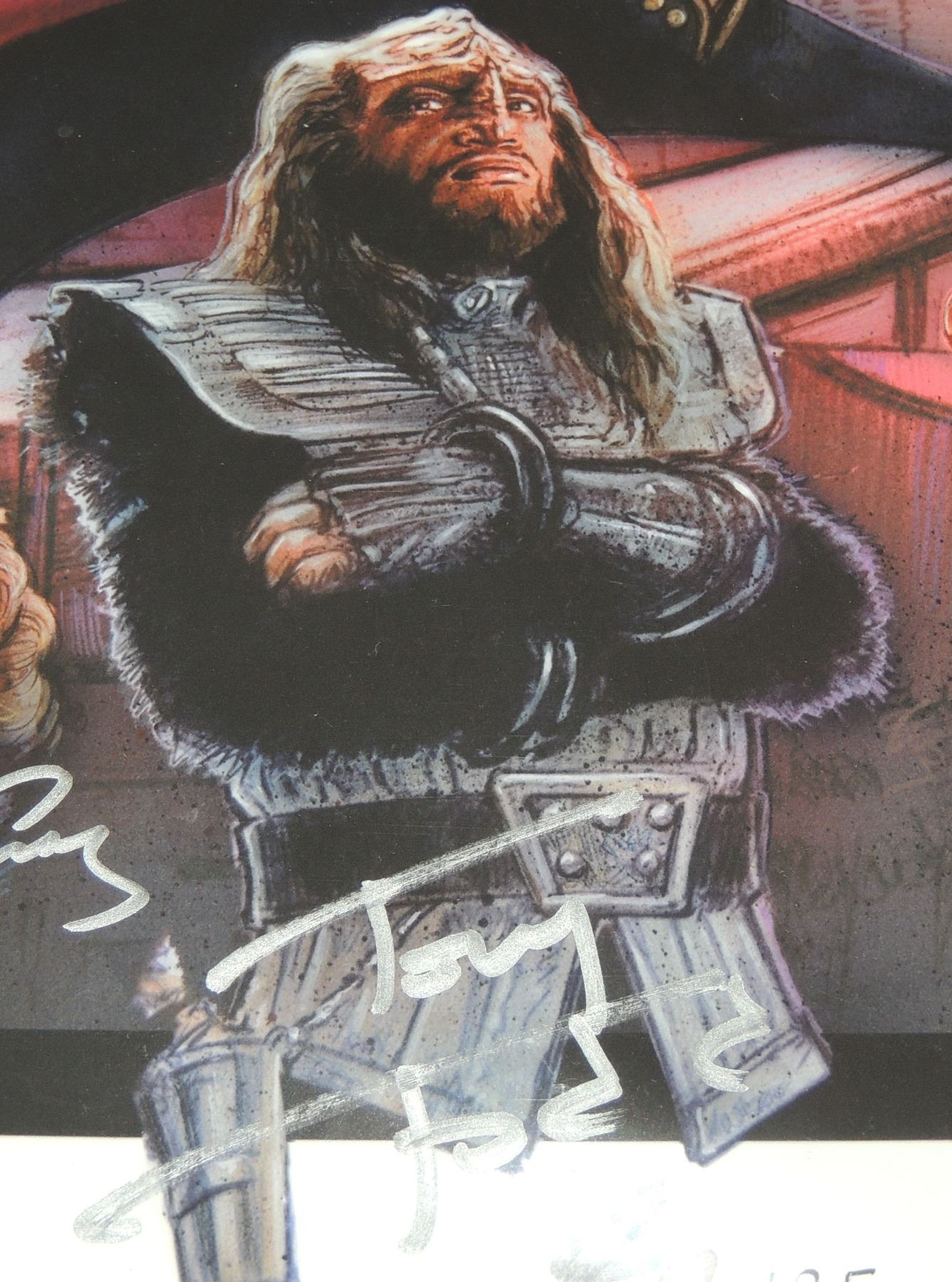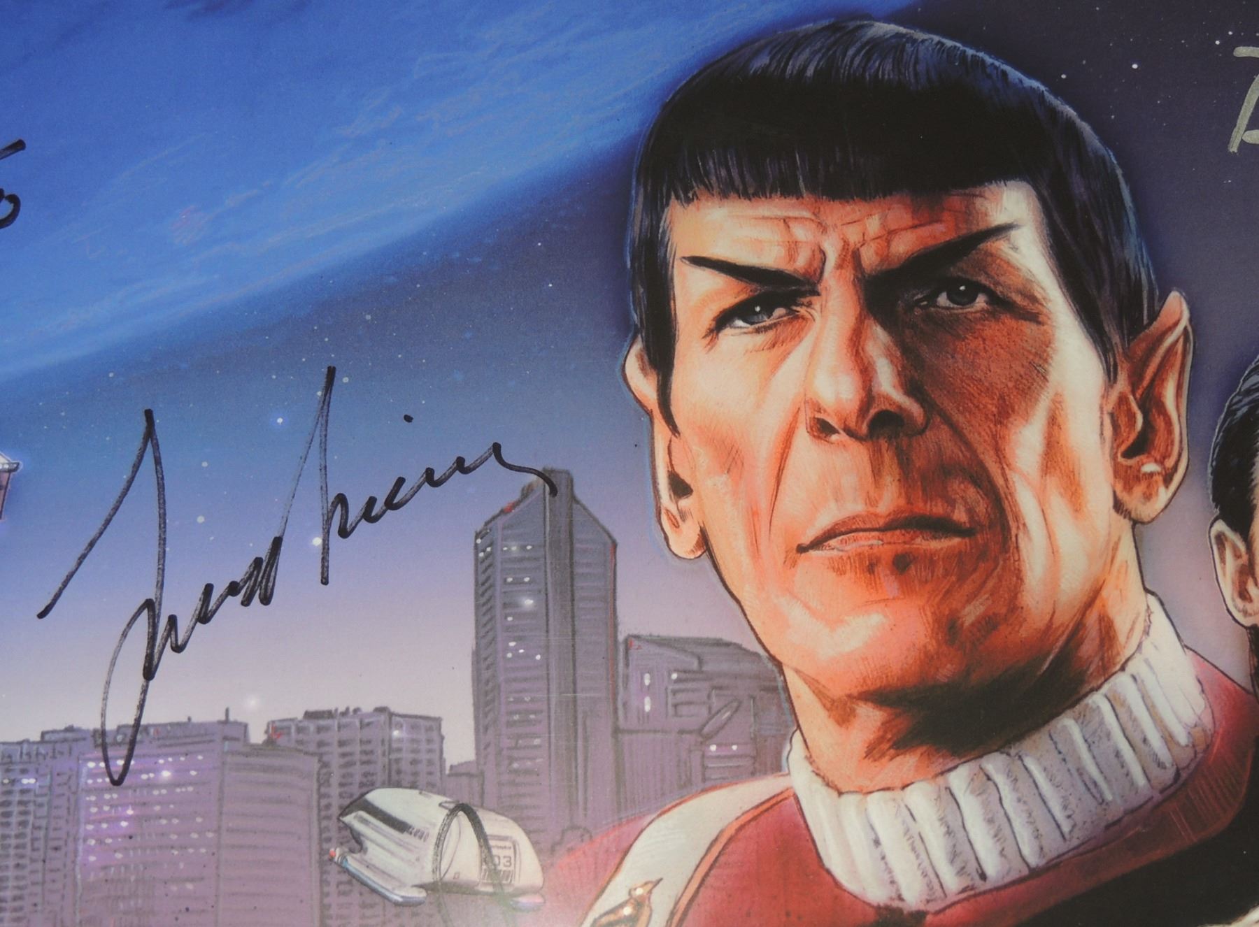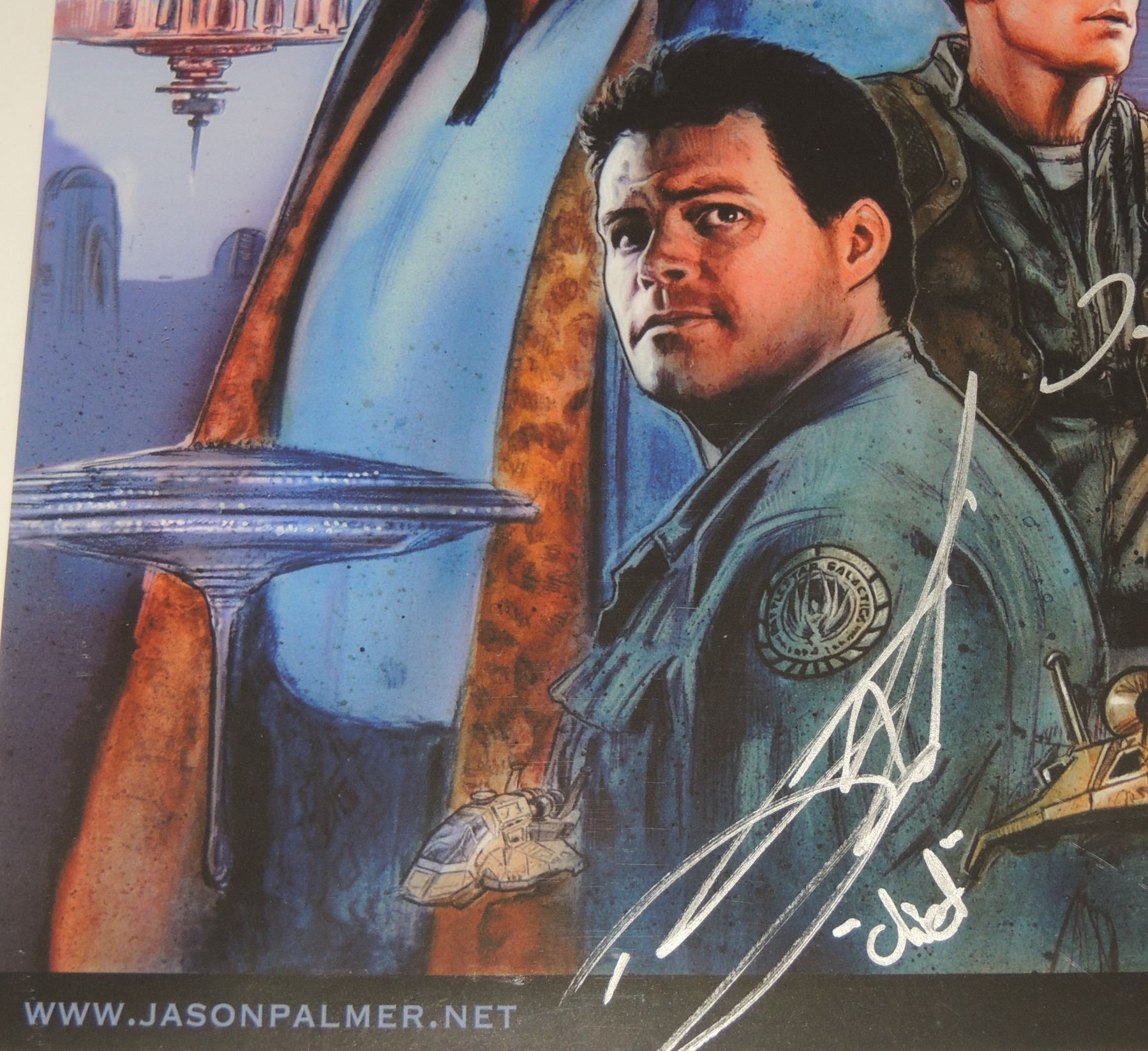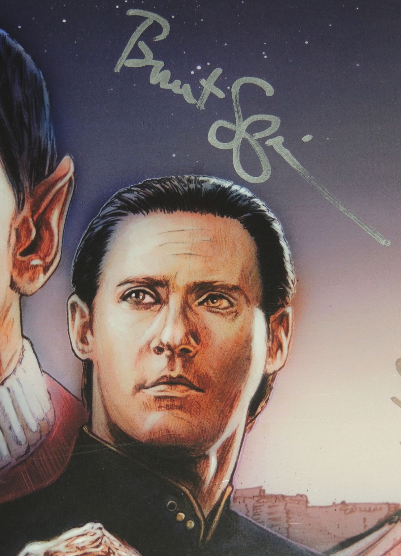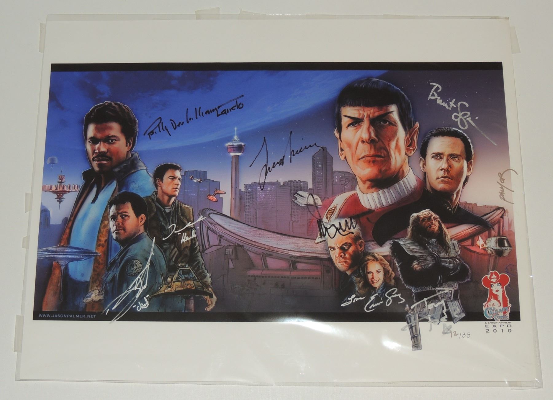 INCLUDES NINE SIGNATURES, SPOCK (LEONARD NIMOY) LANDO CALRISSIAN (BILLY DEE WILLIAMS), DR. TOLIAN SORAN/CLOCKWORK ORANGE ALEX (MALCOLM MCDOWELL), BRENT SPINER (DATA), TONY TODD (STAR TREK KURN/ HORROR CANDYMAN), TAHMOH PENIKETT (HELO FROM BATTLESTAR GALACTICA), AARON DOUGLAS (CHIEF FROM BATTLESTAR GALACTICA) AND ERIN GRAY (BUCK RODGERS, JASON GOES TO HELL) -INCLUDES ADDITIONAL SIDE SIGNATURE, POSTR HAS JASONPALMER.NET MARKING ON LOWER LEFT, AND MEASURES 22 X 17 INCHES IN SIZE. NUMBERED 12/85, FROM 2010 CALGARY COMIC & ENTERTAINMENT EXPO. RARE.