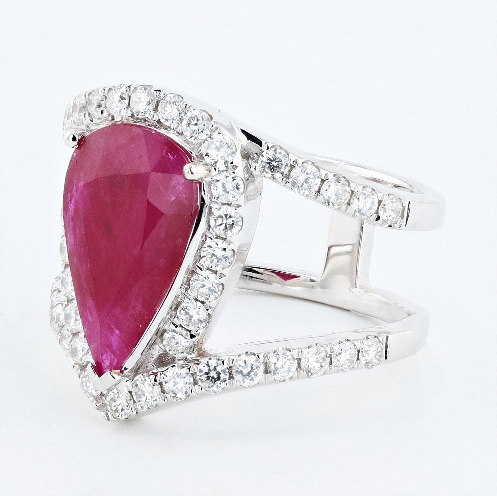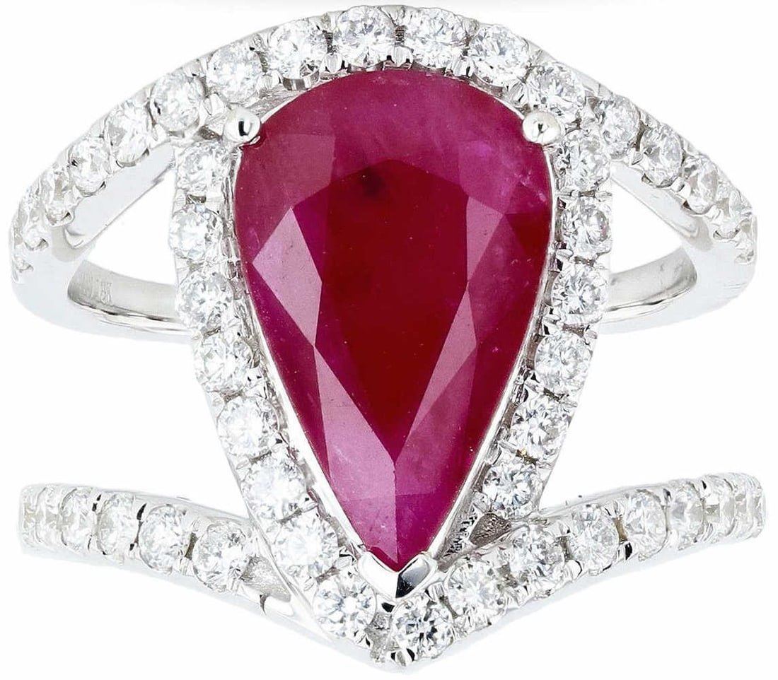 Eighteen karat (18K) white gold natural ruby corundum and diamond ring. A pear brilliant cut natural ruby corundum gemstone is mounted in the center of the ring. Round brilliant cut diamonds accent the ring around ana on uotn swes ot tne center gemstone. The ring has a gross weight of 8.1 Grams. #NATURAL GEMSTONE# GEMSTONE: Ruby Corundum NATURE: Natural SHAPE: Pear Brilliant, Faceted Cut WEIGHT: 3.36 carat totalDIMENSIONS: 14.13 x 4.80mm CLARITY: Type 3 COLOR: Red (5/5) SYMMETRY: Excellent COLOR INTENSITY: Intense TRANSPARENCY: Translucent TONE: Dark #NATURAL DIAMOND# SHAPE: Round Brilliant Cut WEIGHT: 0.85 carat total(46pcs.) DIMENSIONS: 2.0 x 1.7mm AVERAGE CLARITY: SI1-SI2 AVERAGE COLOR: G-H SYMMETRY: Excellent POLISH: Excellent #METAL# METAL: Gold PURITY: 18K (750) COLOR: White CONDITION: Excellent FINISH: HighPolish