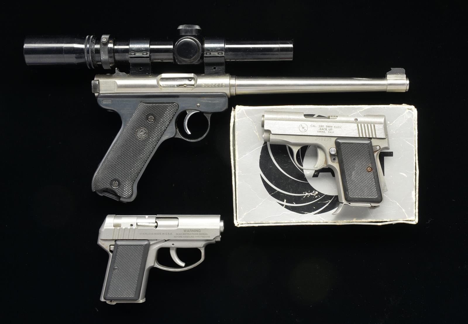 ALL: CONDITION: very good to excellent including bores, grips & optics. 1) BACKUP II. Cal. 380 ACP. S# J59235. Bbl. 2 1/2". Mfg. 1993-1998 w/ grip & manual safeties. Fixed sights integral to slide. Checkered Lexan black plastic grips. Matte cast appearance w/ brushed sides of slide. MAGS: 1 finger extension 5 rd. UNATTACHED ACCESSORIES: fair silver hinged box w/ oil stained manual. (20-3656/NW). 2) BARREL EXTENSTION. Cal. 22 LR. S# G002235. Bbl. 8 1/2" heavy tapered w/ undercut blued blade front sight on integral raised base; drift adj. square notched blued rear. Basically barreled receiver of Lightening Model having Ruger blued bolt & blued A-100 marked Standard / Mark I grip frame w/ checkered plastic grips having Ruger silver eagle medallion. Grooved receiver having blued Weaver rings & Burris 1 1/2-4 gloss finished crosshair dot reticle pistol scope. Lightenings Mfg. 1984-1987 (23,903 units) until Ruger lawsuit stopped production; very likely Barrel Extension offered at same time period. MAGS: 1 Ruger Mark III & IV blued 10 rd. UNATTACHED ACCESSORIES: instruction sheet. (20-3910/NW). 3) BACKUP. Cal. 380 ACP. S# DA7039. Bbl. 2 1/2". Mfg. 1995 to disc. Functions DAO, no safety or external levers, matte finish, hammer fired & checkered black Lexan grips. Noticeably rounded slide for deep compact carry. MAGS: stainless 5 rd. w/ flat push button base. (20-3924/NW). ALL MODERN. $750-1,000.