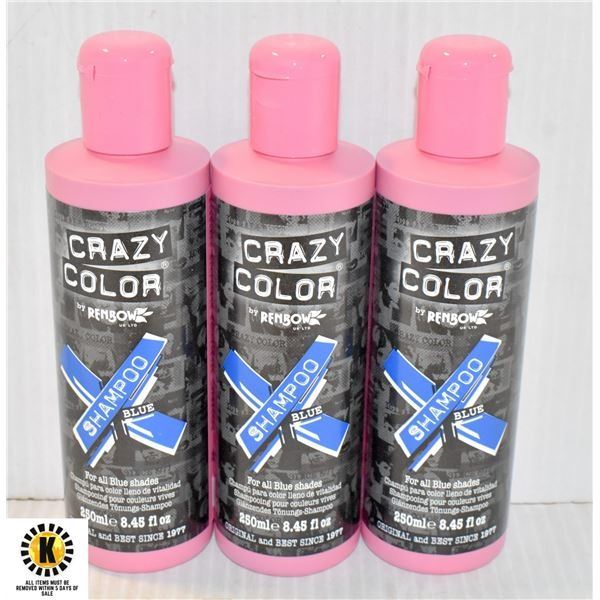 3 BOTTLES OF 250 mL BLUE CRAZY COLOR VIBRANT COLOR SHAMPOO SEMI PERMANENT HAIR COLOR. SALT AND SULFATE FREE EXP 10/17