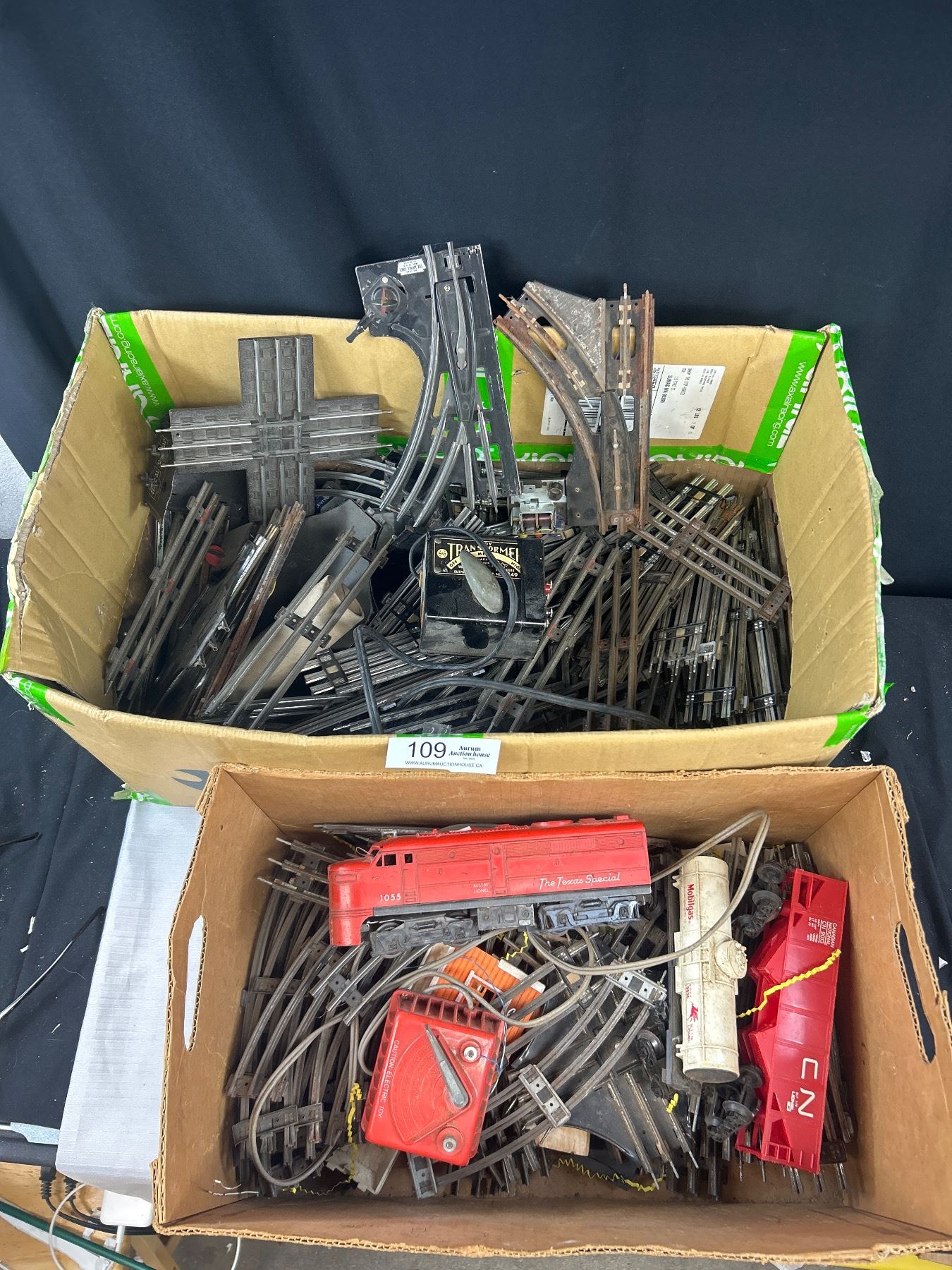 3 Boxes of O Scale Train Tracks + Locomotive and Other Cars