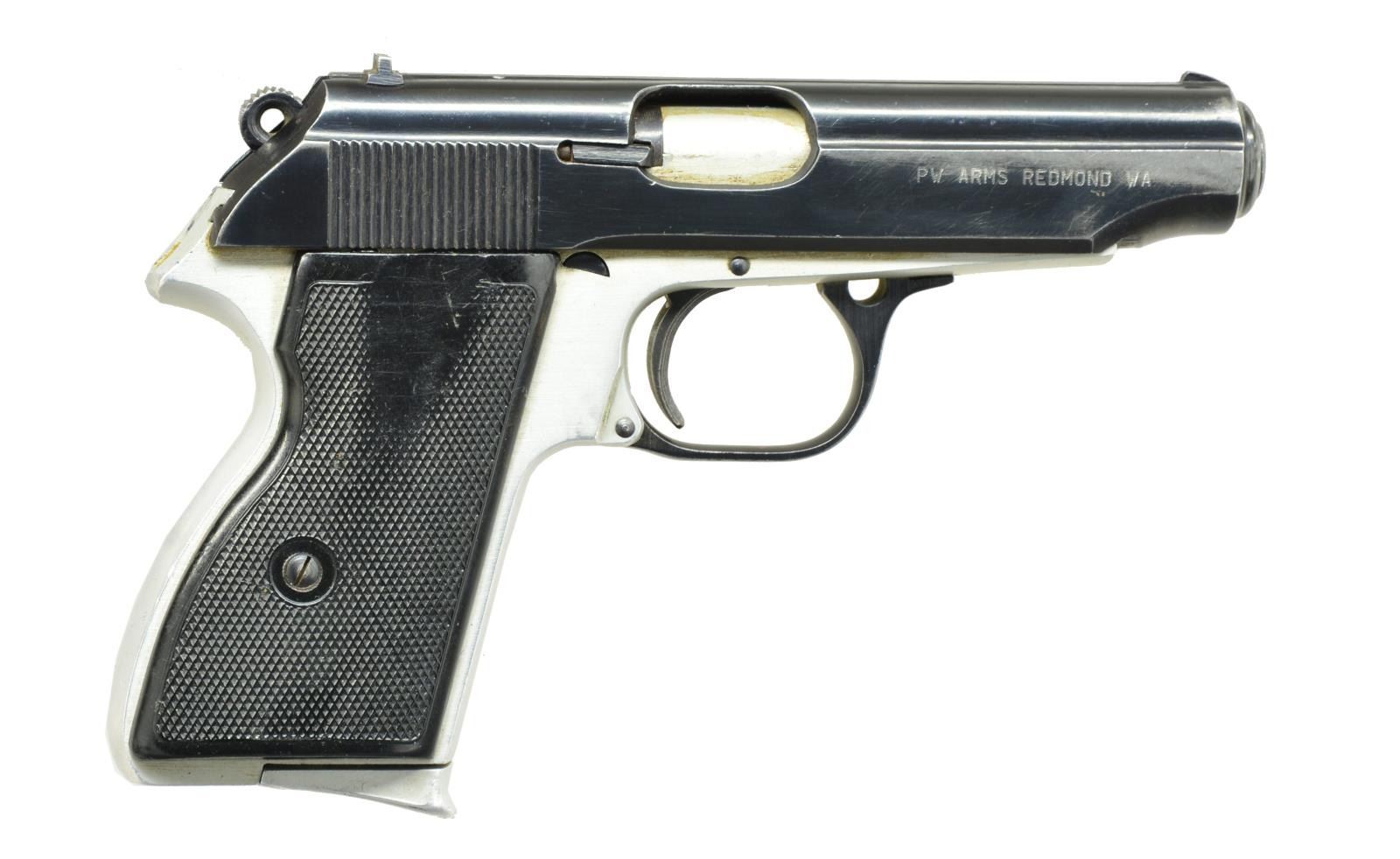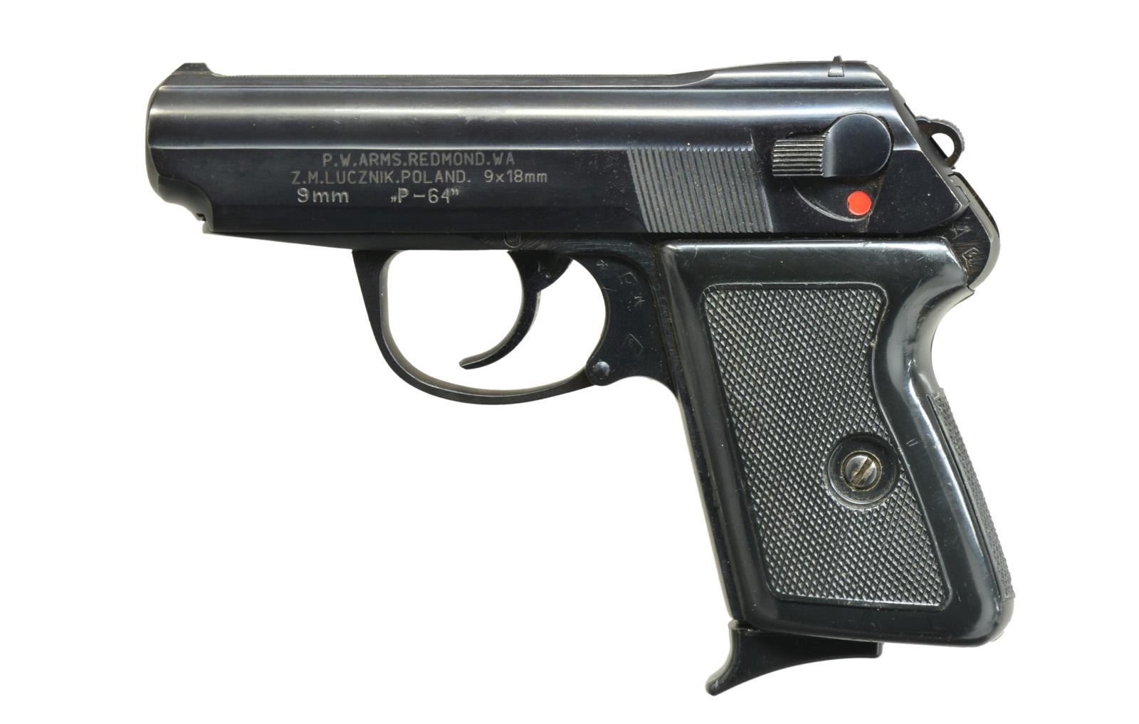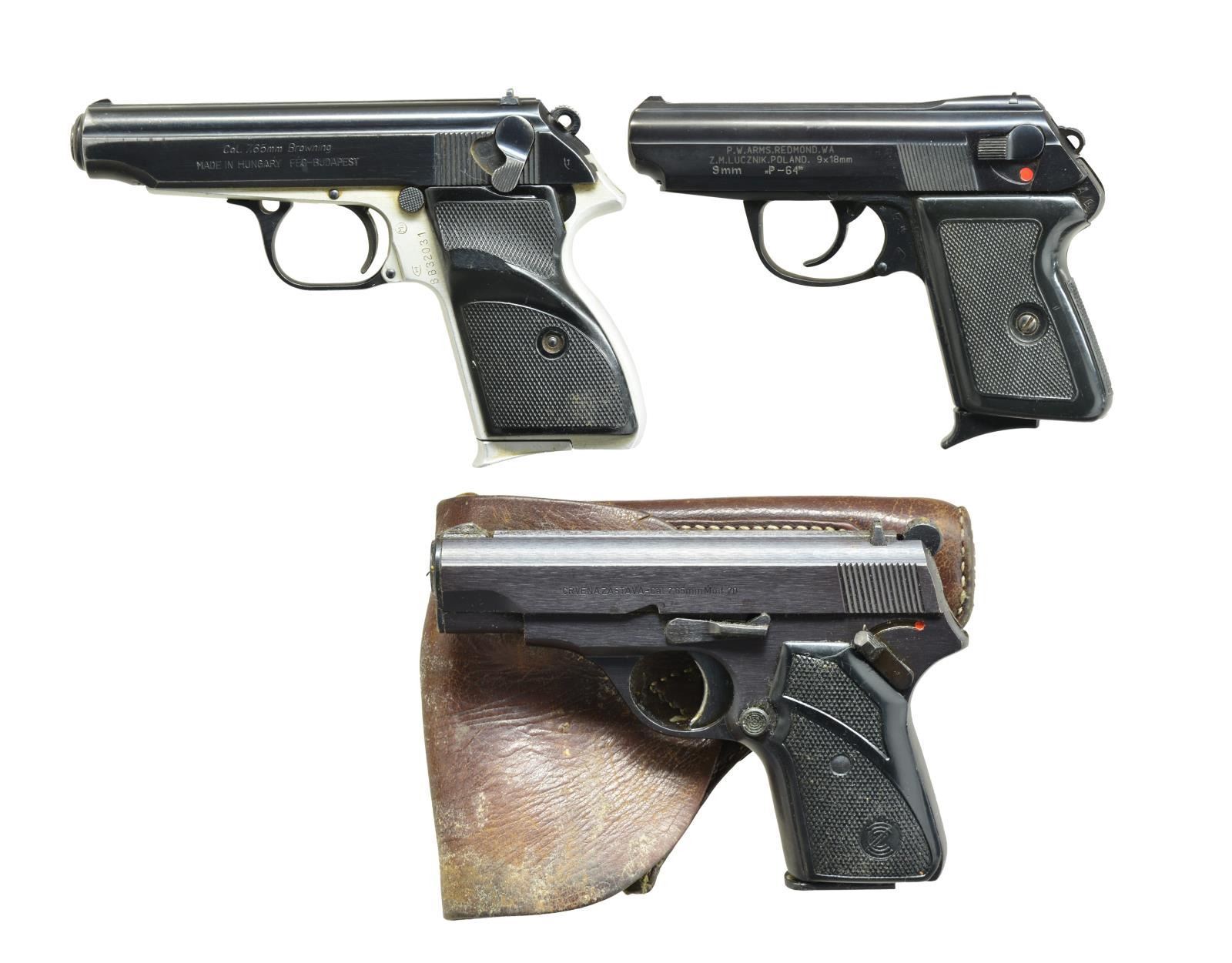 1) FEG MODEL 74. Cal. 7.65mm (32 ACP). S# BB32031. Bbl. 4". Mfg. in Hungary & imported by PW Arms. Natural finished alloy grip frame w/ blued trigger guard & matching numbered slide. Very similar to Walther PP having similar trigger guard, takedown & slide mounted safety. Checkered black plastic grips w/ slight thumb rest for RH use. MAGS: 1 blued 8 rd. w/ push button finger extension alloy base numbered 585. CONDITION: good plus overall appearance w/ holster type slide wear along w/ peppery oxidation at high points of slide. Dull appearing frame w/ numerous light handling marks. Outward portion of thumb rest & top half of RT grip purposefully flattened w/ good appearance & feel. Near excellent bore. (21-802/NW). MODERN. 2) LUCZNIK MODEL P-64. Cal 9x18mm Mak. S# SH07069. Bbl. 3 1/2". Mfg.1969 at Factory 11 in Lucznik at Radom Arsenal; 1965-early 1980's being first imported to US in 2005. Similar in design to Walther PP w/ trigger guard takedown & slide safety. European style mag. release at butt. Border checkered black plastic grips. Matching numbered slide. Imported by PW Arms. MAGS: 1 near excellent 6 rd. blued w/ plastic finger extension base. CONDITION: very good to near excellent appearance w/ occasional small marks on grips. Near excellent bore. Noticeably stiff DA trigger functioning. (21-805/NW). MODERN. 3) CZ MODEL 70. Cal 7.65mm (32 ACP). S# 320309. Bbl. 3 5/8". Mfg. 1968-1969 in Yugoslavia & imported by R Guns. Checkered black plastic grips w/ CZ logo. Frame mounted thumb safety & 1911 style takedown. Matching numbered bbl. & slide (K date code). MAGS: 2 blued factory 8 rd. UNATTACHED ACCESSORIES: fair well worn flap holster w/ single wide belt loop, mag. pouch, plus stud & strap retention. CONDITION: extremely faint thinning on high edges of slide; all other aspects near excellent including bore & grips. Action sluggish due to cosmoline like material throughout action; most wiped from exterior. (21-812/NW). CURIO. $700-1,000.