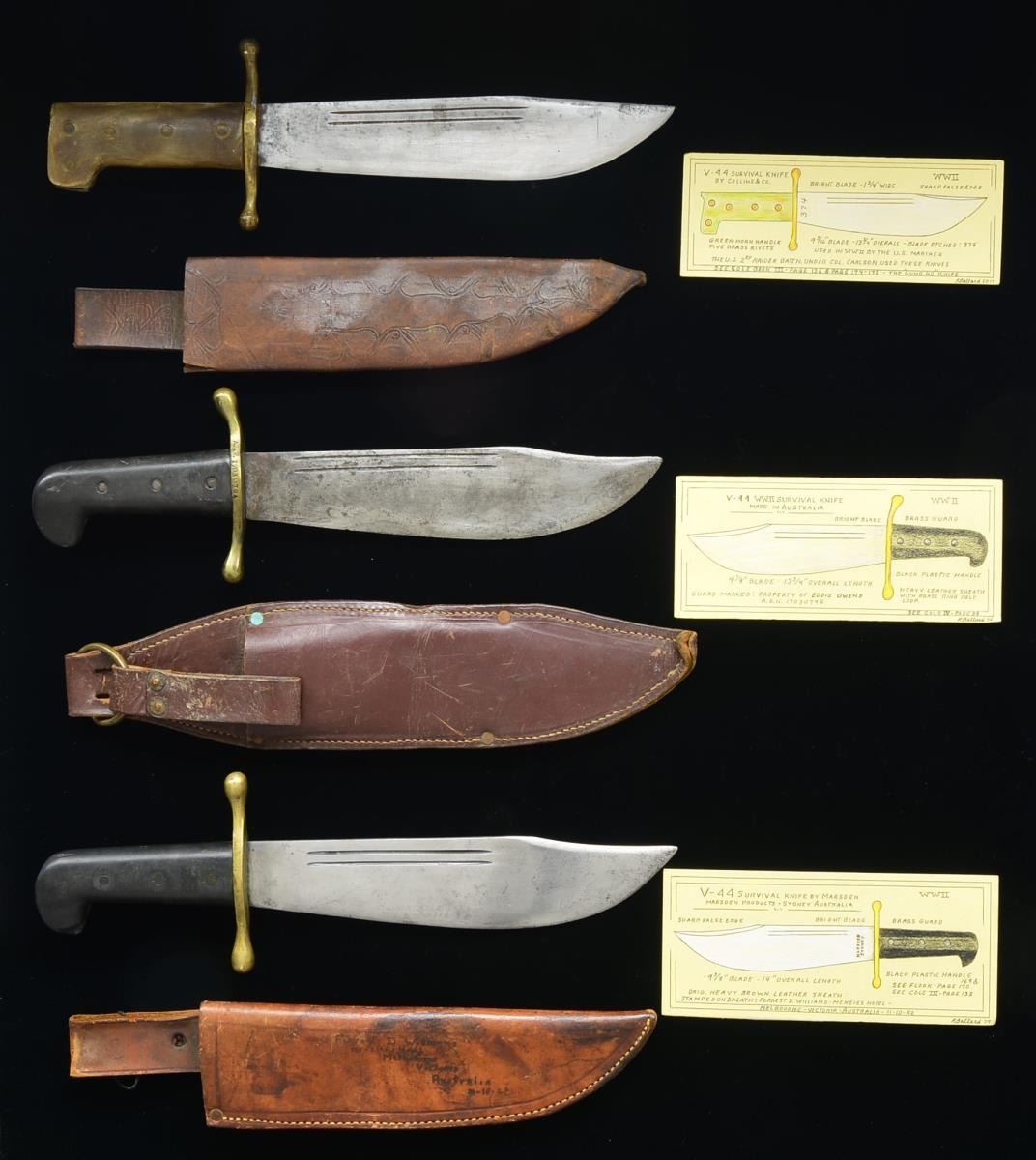 1) Rare early first batch “numbered” ricasso “374” Collins V-44. 13.75" overall, 9.2" blade, green horn handle. Blade & sheath both w/ Collins’s markings. WW2 favorite of Carlson’s Raiders. CONDITION: good overall, blade gray w/ sharpening, markings still sharp, sheath is solid but worn w/ Collin’s markings weak. 2) Identified Australian made V-44 w/ black hard rubber handle. 14" overall, 9 3/8" blade marked “MARSDEN / SYDNEY”. Leather sheath has “FORREST D. WILLIAMS … 11-10-42” nicely inked. CONDITION: good to very good overall. 3) Identified V-44 w/ no maker Mark, black hard rubber grip, brass crossguard stamped: “PROPERTY OF EDDIE OWENS, A.S.N. 17030794”. Riveted brown leather sheath w/ belt loop attached by brass ring. UNATTACHED ACCESSORIES: 3 hand drawn collection cards by Roger Ballard. CONDITION: good overall. PROVENANCE: Collection of Roger Ballard. (02-15160/JS). $900-1,400.