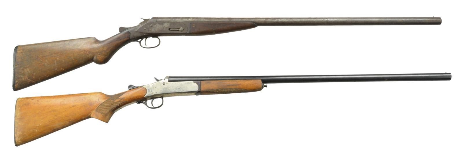 2) SPRINGFIELD / STEVENS 94B. Cal. 16 Ga. NSN. Bbl. 28" w/ bright bead & Mod choke. Blue bbl. Case colored receiver. Plastic trigger guard. Walnut stock set. CONDITION: Very good blue. Good case colors. Good wood. Shiny bore. (22-837/MD). CURIO.
