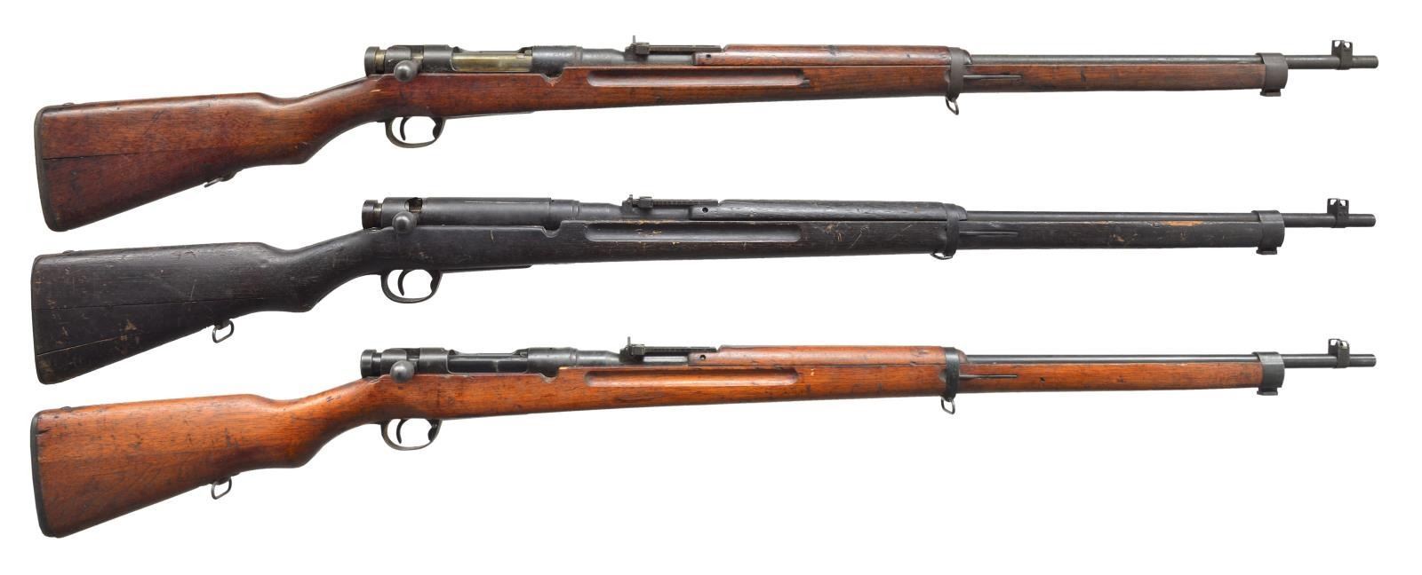 1) Cal. 6.5 Jap. S# 606 71. Bbl. 31". Numbers match on receiver & bayonet lug. Receiver marked on left side w/ Nagoya Arsenal mark. Has nearly intact Mum w/ 2 chisel marks. Mum & Type 38 characters have been enhanced in white. Ladder aperture rear sight graduated to 2400m. Inverted V front sight w/ protective ears. Oval bolt knob & notched checkered safety knob. Cleaning rod is not present. Hardwood stock set w/ cup type buttplate. CONDITION: original finish stock set has moderate wear, dents, staining & scratches throughout. Buttstock dovetail is notably open. Metal has 60% blue turning patina w/ wear & scattered spots of oxidation. Very good shiny bore. (20-2916/RW). 2) Cal. 6.5 Jap. S# 65288. Bbl. 31". Numbers match on receiver, bolt & dust cover. Receiver marked on left side w/ Koishikawa Arsenal marking. Mum & characters are intact. V-notch ladder rear sight graduating to 2400m. Inverted V front sight w/ protective ears. Bolt has oval knob & notched checkered safety knob. Cleaning rod is not present. Hardwood stock set. Flat steel buttplate. CONDITION: rear tang screw & front guard screw are not present. Stock set has wear, dents & scratches w/ dark stained appearance throughout. Notable crack in toe area on both sides & chipping & gouges at toe area. Crack in top of handguard. Missing chip & sm. gouges behind upper band. Fair bore turning dark. (20-2944/RW). 3) Cal. 6.5 Jap. S# 79322. Bbl. 31". Numbers match on receiver, bolt & bayonet lug. Receiver is marked on left side w/ Nagoya Arsenal marking. Mum has been ground leaving Type 39 characters. Aperture ladder rear sight graduated to 2400m. Inverted V front sight w/ protective ears. Oval bolt knob w/ checkered notched safety knob. Cleaning rod is not present. Hardwood stock set w/ cup type buttplate. CONDITION: original finish stock set has generally better appearance w/ moderate wear, dents, staining & scratches. Metal retains 80% original blue finish w/ light wear & scattered spots of oxidation. Front sight protective ear on right side is notably bent. Very good shiny bore. (20-2965/RW). ALL CURIO. $700-1,100.