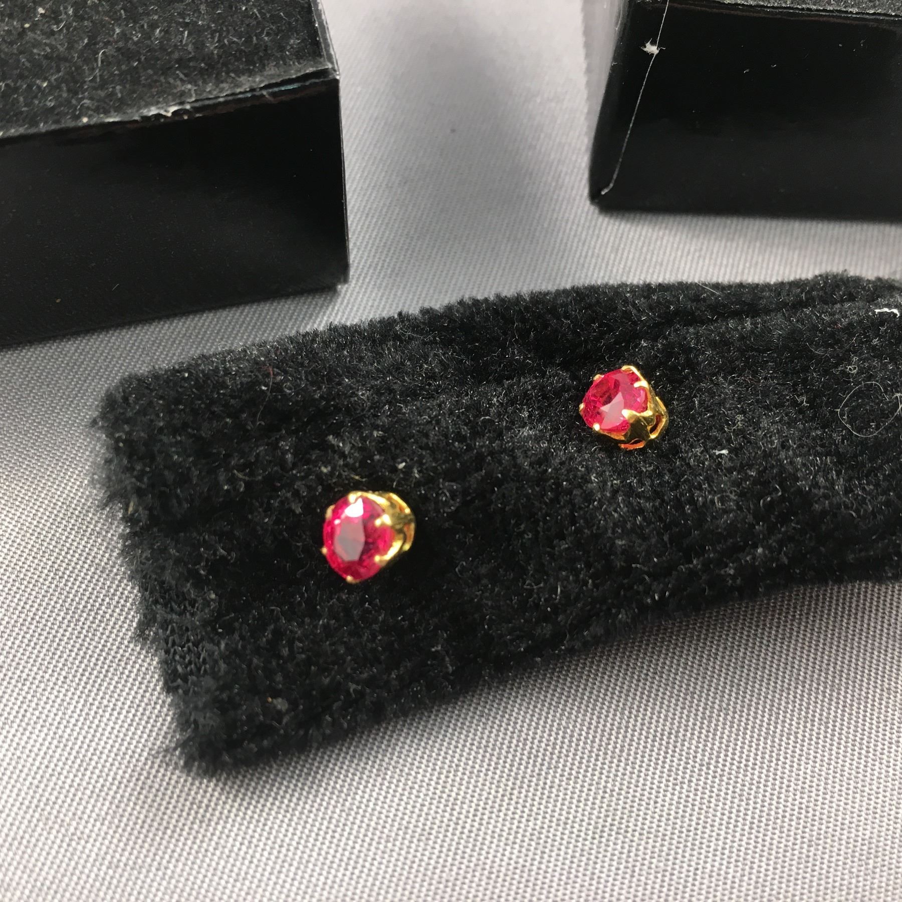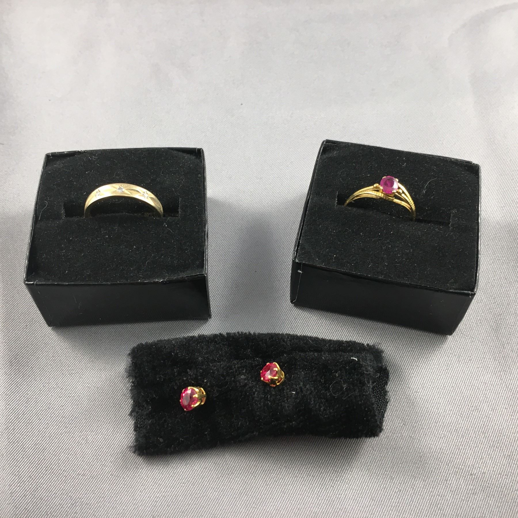 3 PIECES TTL. 1 - LADIES 14KT YELLOW GOLD NATURAL RUBY DRESS RING, 1 OVAL MIXED CUT NATURAL RUBY, APPROX WEIGHT 0.40CARAT, COLOUR DEEP PURPLE RED, CLARITY LIGHTLY INCLUDED, CUT GOOD, REPL VALUE $400.00 1 - PAIR OF 14KT YELLOW GOLD NATURAL ORANGE SPINEL EARRINGS, 2 OVAL MIXED CUT NATURAL ORANGE SPINELS, APPROX 5.10X4.50MM, TTL WEIGHT APPROX 1.00 CARAT, CLARITY LIGHTLY INCLUDED, CUT GOOD, PAIR WEIGHS 1.20GRAMS, REPL VALUE $750.00. 1 - LADIES 14KT YELLOW GOLD DIAMOND