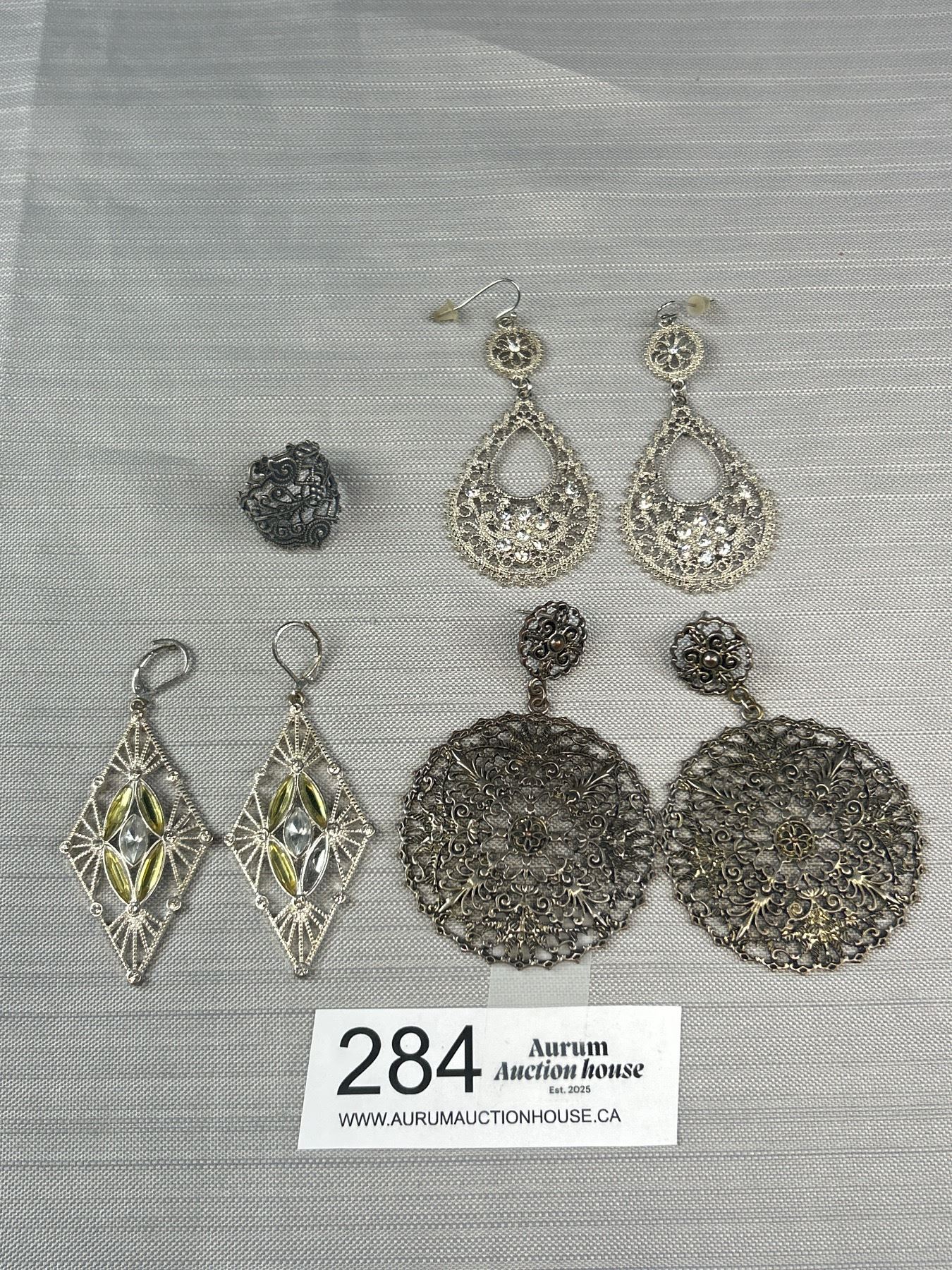 3 Pairs of Vintage Silver Filigree Dangle Earrings + 1 Ring