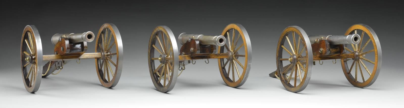 Overall length: 16" w/ 8" in the white smoothbore 45 cal. cannons. Wooden carriages w/ brass accents & in the white metal straps for wheels. CONDITION: very good overall w/ acquiring patina & oxidation. Bore are dark w/ oxidation. (01-20910/MD). $450-750.