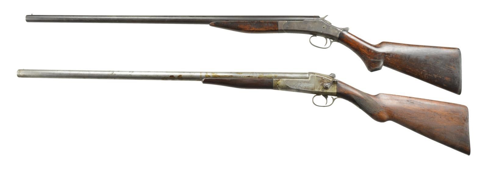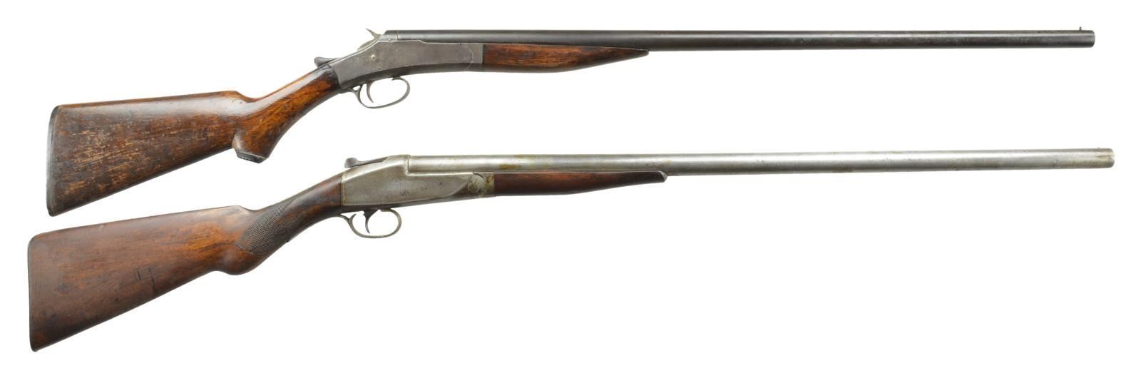 2) AMERICAN ARMS "SEMI HAMMERLESS" SINGLE. S#12503. Bbl. 30" w/ broken bead & IC choke. Break open action w/ opening lever on top tang & set lever left left side. Walnut stock set w/ metal buttplate. LOP: 14 1/4". CONDITION: Fair overall. Cleaned metal turned gray w/ prior pitting, patina & marks. Worn wood w/ hand cut checkering having moderate marks & several cracks. Fair buttplate. Fair pitted bore. (22-1231/MD).