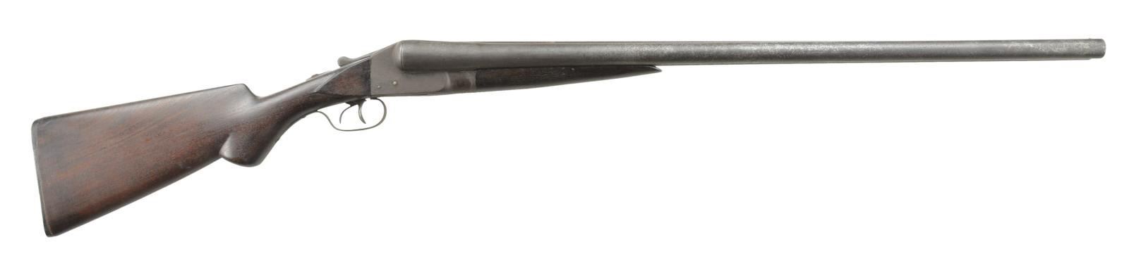 3) ITHACA FLUES MODEL 10 GA. SXS SHOTGUN. Cal. 10 Ga. S# 228913 (1912). Bbls 30" w/ brass bead. Chambers appears to have been reamed. Boxlock action w/ dbl. triggers & extractors. Splinter forearm w/ matching number & J hook latch. Pistol grip walnut stock w/ black hard rubber buttplate. CONDITION: poor pitted patina metal finish. Good worn wood finish w/ handling marks. bbl. extractors can become unhook from frame when breaking open action. Fair overall shiny bores w/ left bore having significant pitting near muzzle. (22-1239/MD). ALL CURIO. $150-250.