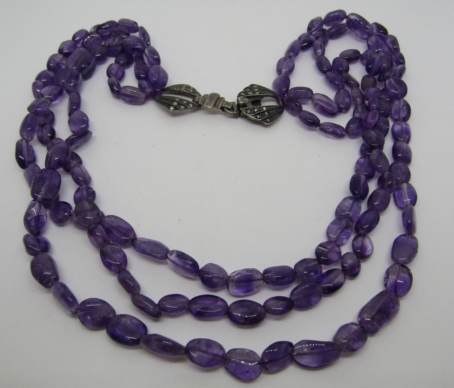 VINTAGE ESTATE THREE STRAND 18 INCH AMETHYST NECKLACE. 10MM TO 13MM AMETHYST STONES. WEIGHT: 59.4 GRAMS. HALLMARKED WITH "Y" 925. USA SHIPPING $5.