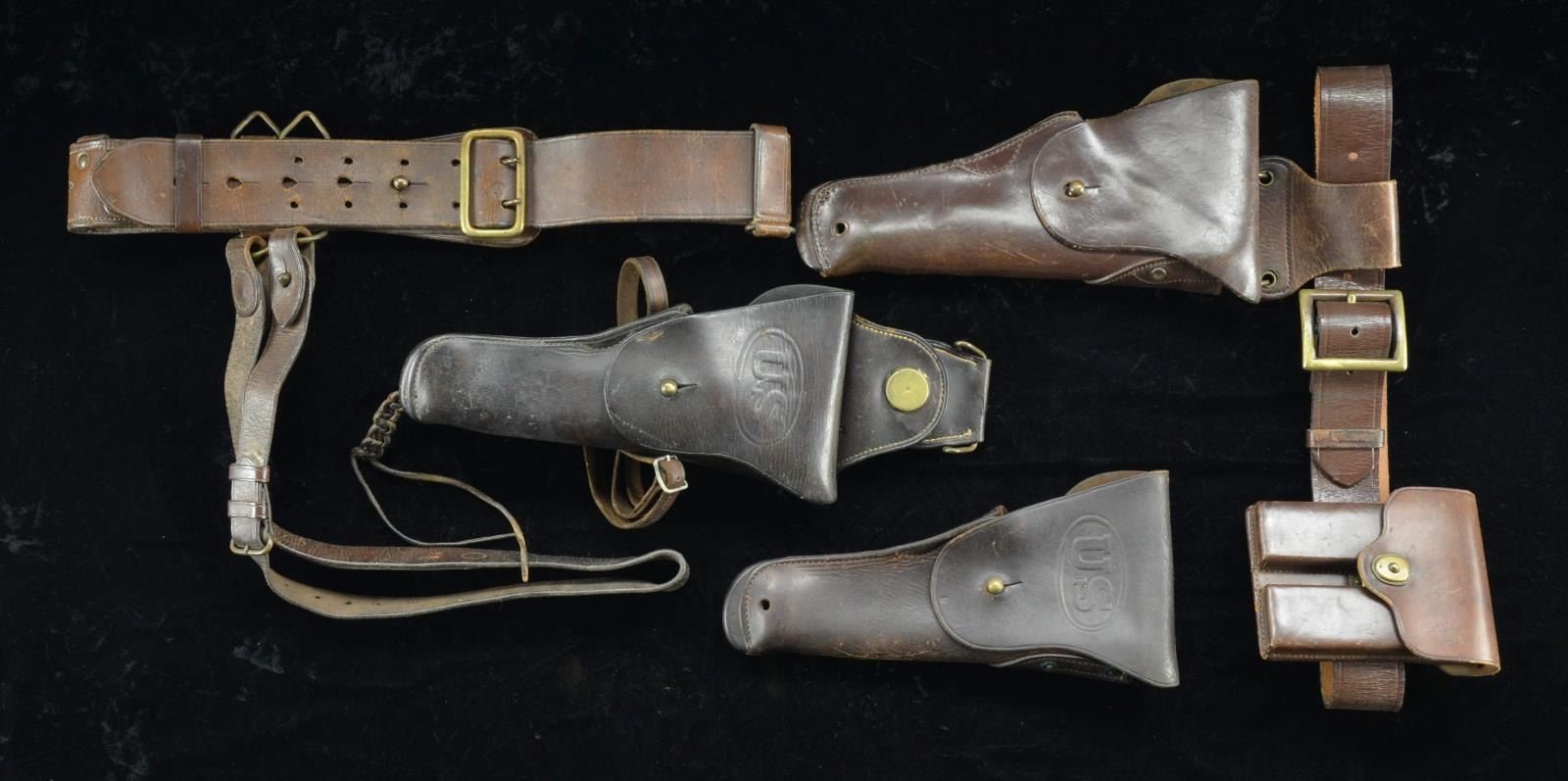 1) US ARMY OFFICER'S PISTOL RIG. Included in this Brown leather set is a Model 1904 belt marked " SMALL", "STEERHIDE / TOP GRAIN BRIDLE" & "CINTAS", Model 1912 dbl. mag. pouch stamped "Q.M.I.D. / JEFF.-1925 / H.E.K." & unmarked Model 1916 holster for 1911 Govt. pistol.