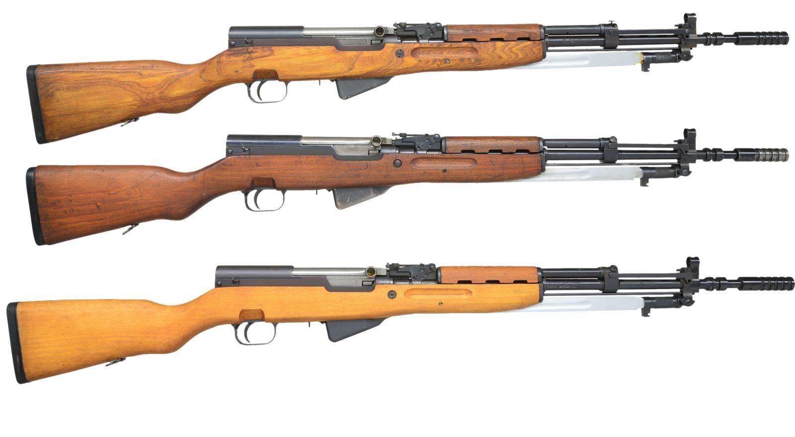 1) YUGOSLAV SKS. Cal. 7.62 x 39. S# M-479702. All visible numbers match except bolt. Bbl. 24 1/4" including grenade launcher. Import marked on right side of bbl. Tangent rear sight graduated to 1000m. Hooded post front sight. Flip up night sights. Grenade launcher sight graduated to 270m. Folding 11 1/4" fullered blade bayonet. Hardwood stock w/ rubber recoil pad. CONDITION: stock set has light wear & scattered handling marks. Metal has 75% original finish w/ light wear & scattered scratches. Near excellent shiny bore. (21-413/RW). 2) YUGOSLAV SKS. Cal. 7.62 x 39. S# G-209612. Bbl. 24 1/4" including grenade launcher. Import marked on right side of bbl. Tangent rear sight graduated to 1000m. Hooded post front sight. Flip up night sights. Grenade launcher sight graduated to 270m. Folding 11 1/2" fullered blade bayonet. Hardwood stock set. Buttstock has rubber recoil pad. CONDITION: stock set has light staining & moderate wear, dents & scratches. Has 3" crack at top of grip & several sm. cracks underneath grip. Metal has 70% original finish w/ thinning, light wear & scratches. Notable wear on grenade launcher. Fair, worn bore turning dark. (21-475/RW). 3) YUGOSLAV SKS. Cal. 7.62x39. S# V-693957. All visible numbers match. Bbl. 24 1/2" including grenade launcher. Tangent rear sight graduated to 1000m. Hooded post front sight. Flip up night sights. Grenade launcher sight graduated to 270m. 11 1/4" Fullered blade bayonet. Hardwood stock set w/ black rubber recoil pad. CONDITION: all aspects including bore near excellent. (21-476/RW). ALL MODERN. $1,200-$1,800.
