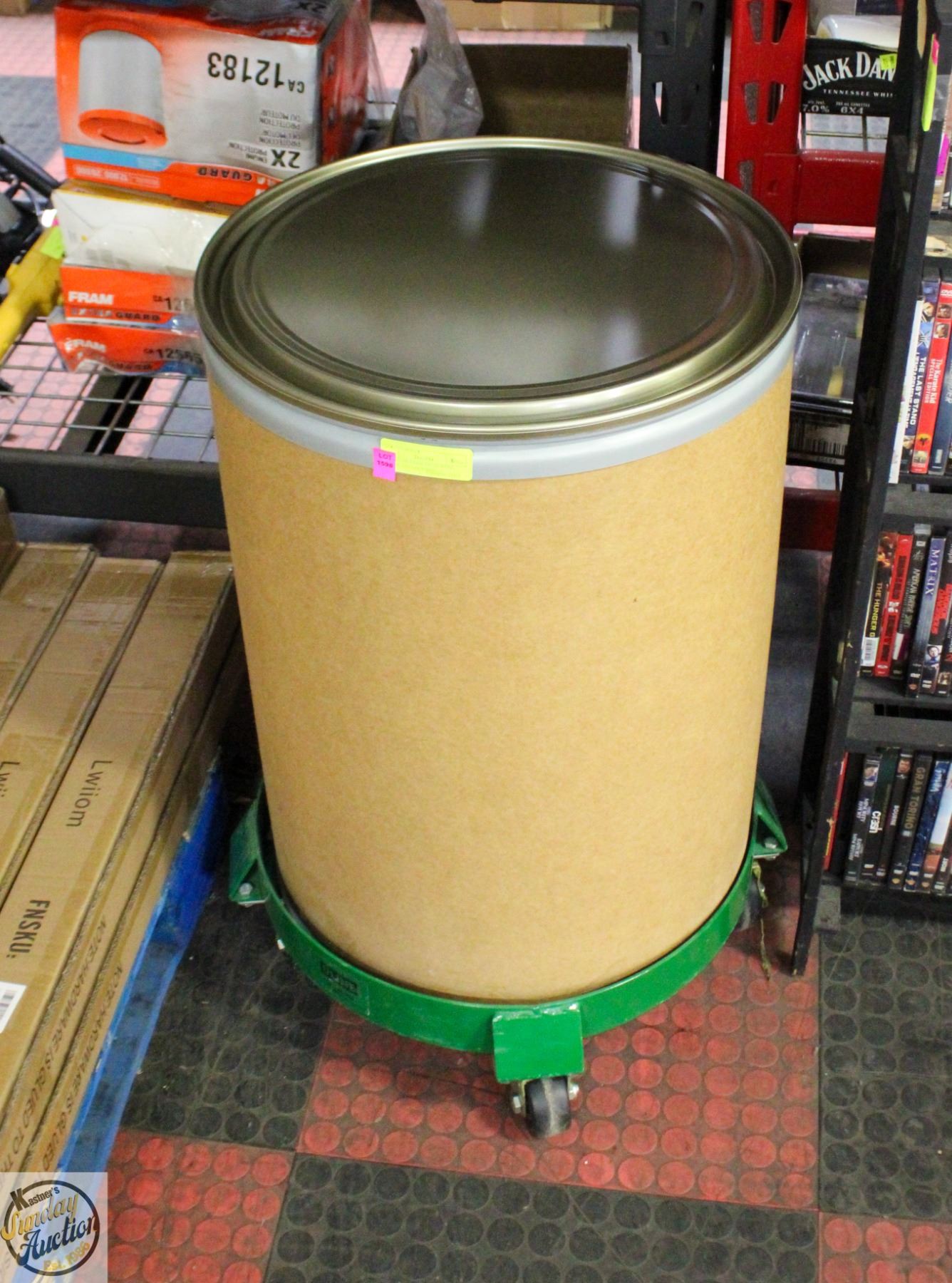 30 GALLON FIBER DRUM WITH DOLLY, LID, LOCK RING