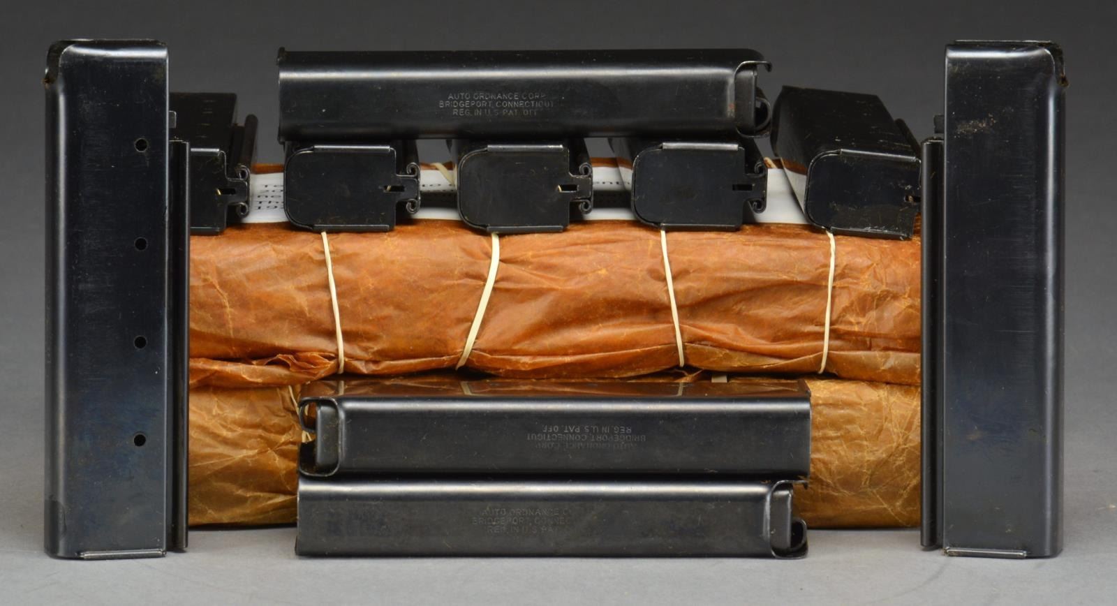 WRAPPERS. 3 Oil wrapped packages containing 10 mags. each. 20 Rds. early Auto Ordnance mfg. patent marked. Mags. are marked “AUTO ORDNANCE CORP. / BRIDGEPORT, CONNECTICUT / REG. IN U.S. PAT. OFF”. All mags are blued finish. (02-14056/JZ). $900-1,500.