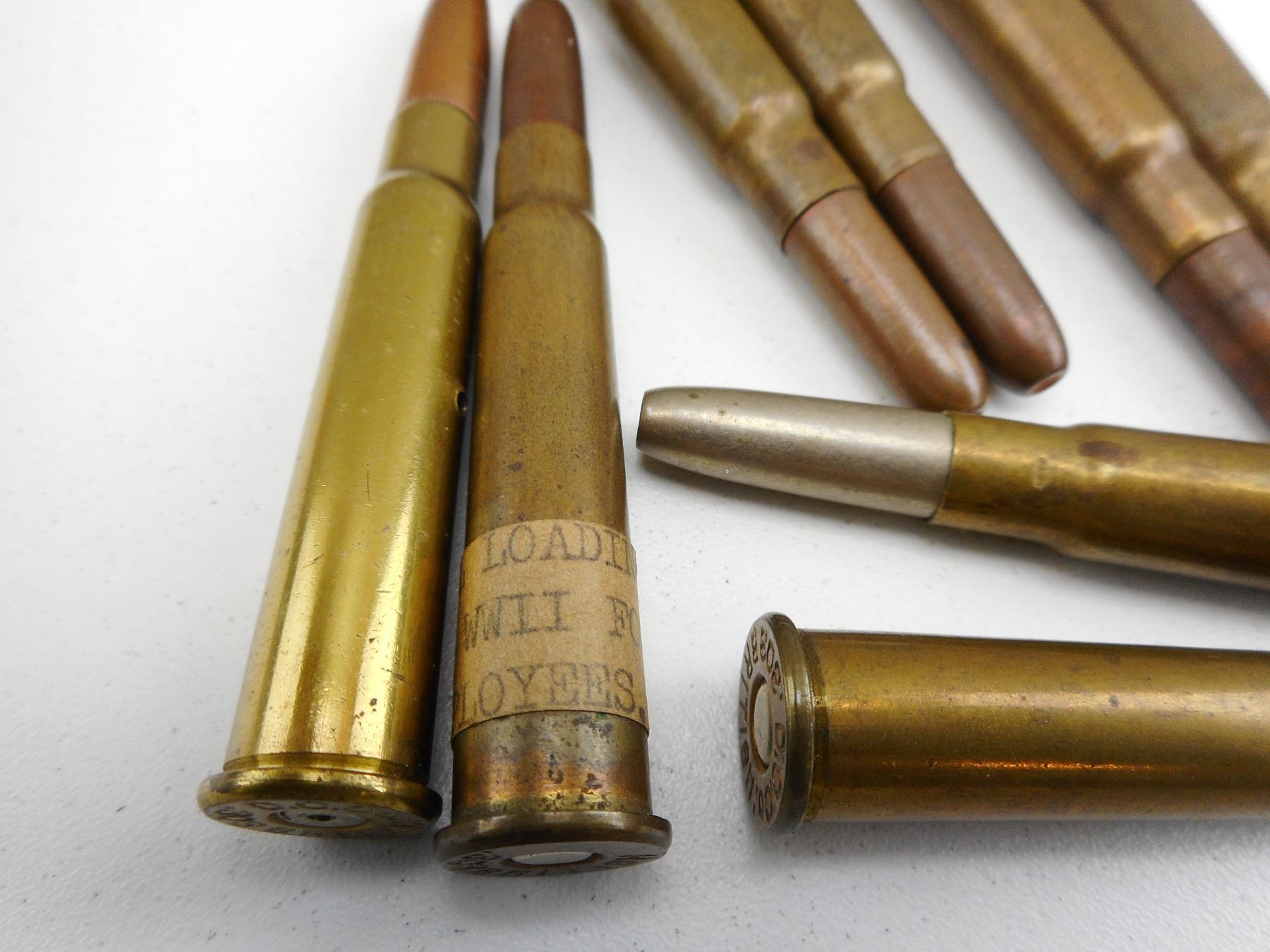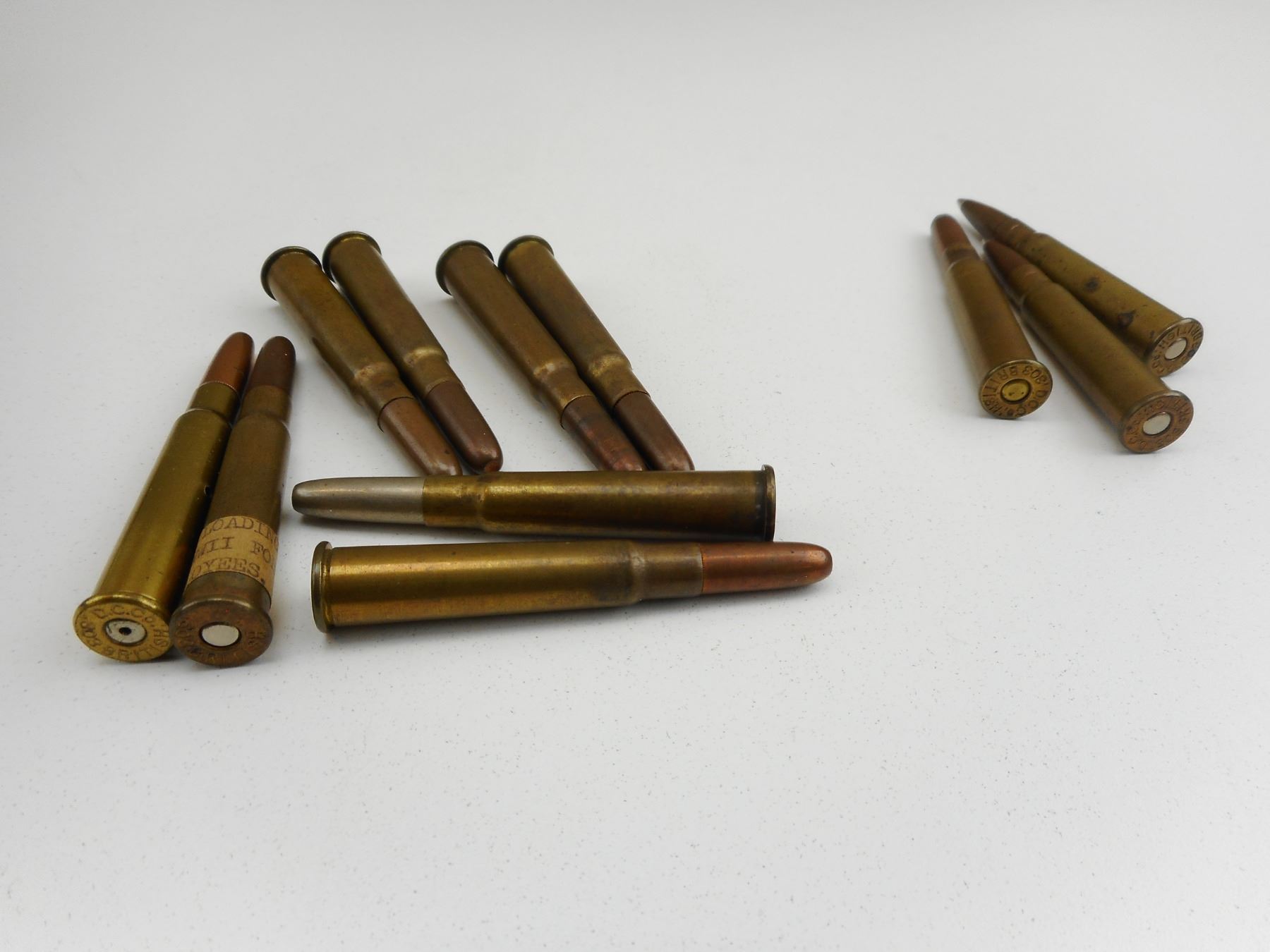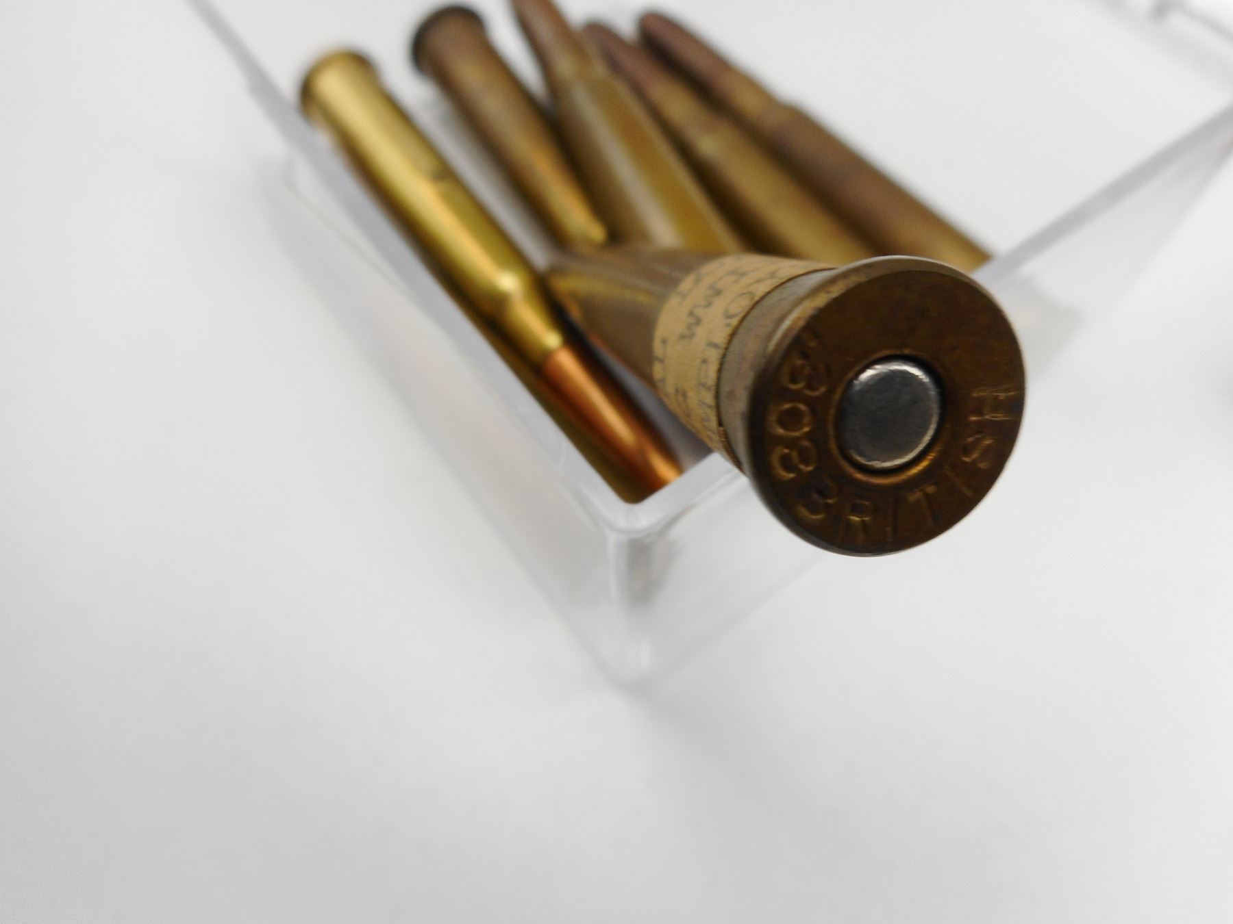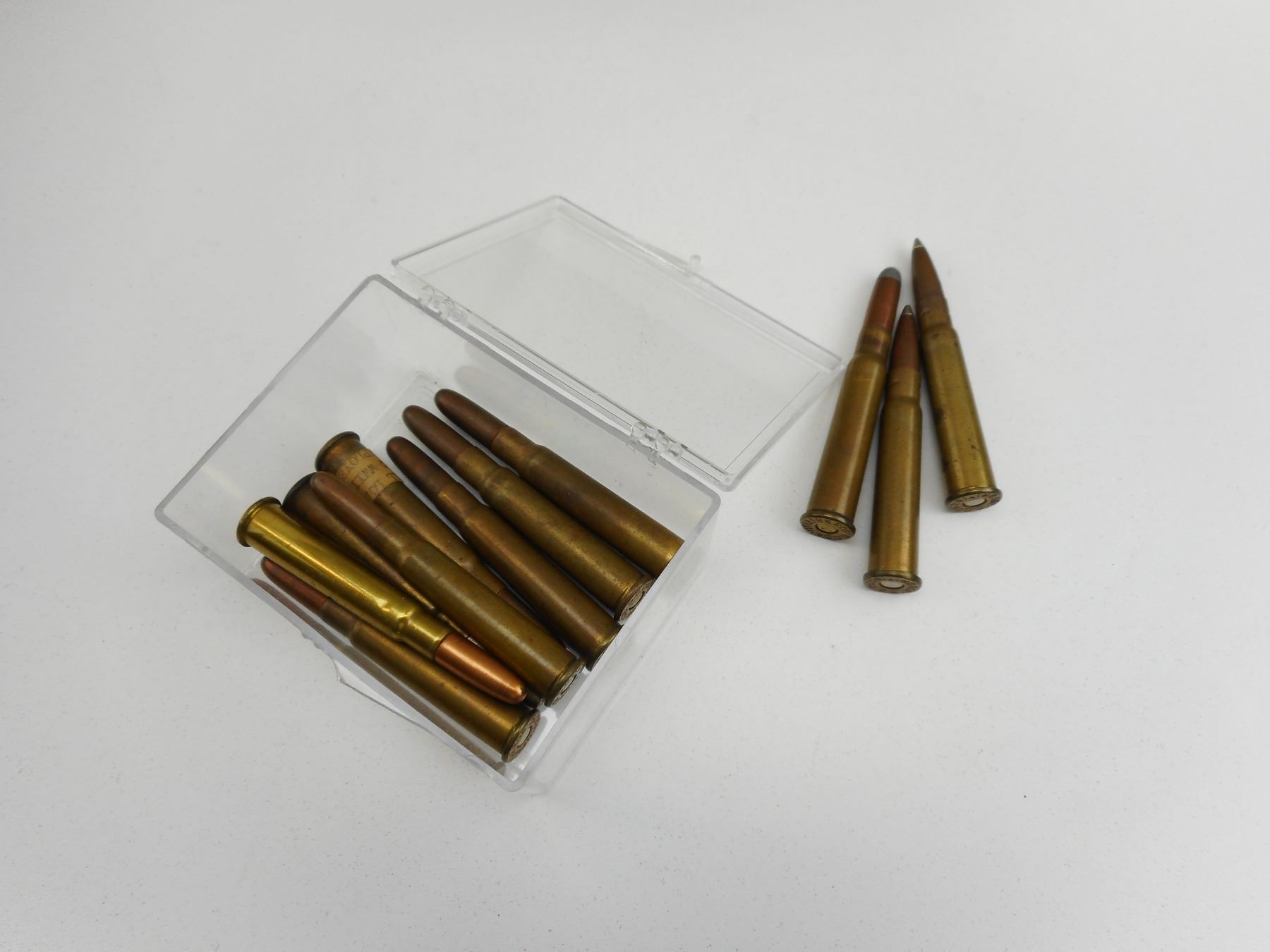 .303 BRITISH AMMO , 10 RNDS .303 BRITISH AMMO, 1 DUMMY RND., HEAD STAMPED D.C.CO., IN PLASTIC COLLECTOR CASE