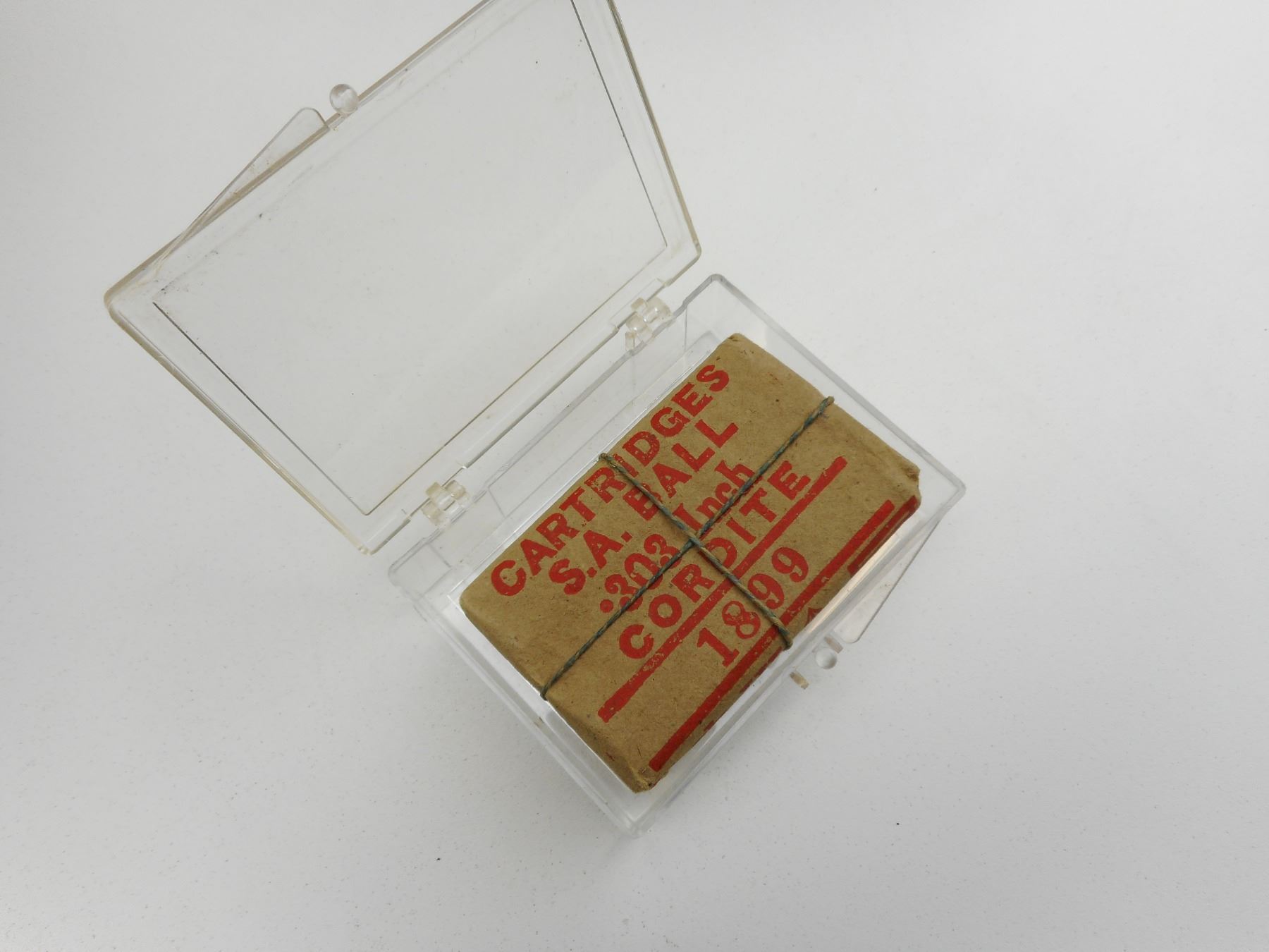 .303 INCH CORDITE MARK IV AMMO , 10 RNDS .303 INCH CORDITE MKIV AMMO, DATED 1899, SEALED PKG, IN HARD PLASTIC COLLECTORS CASE