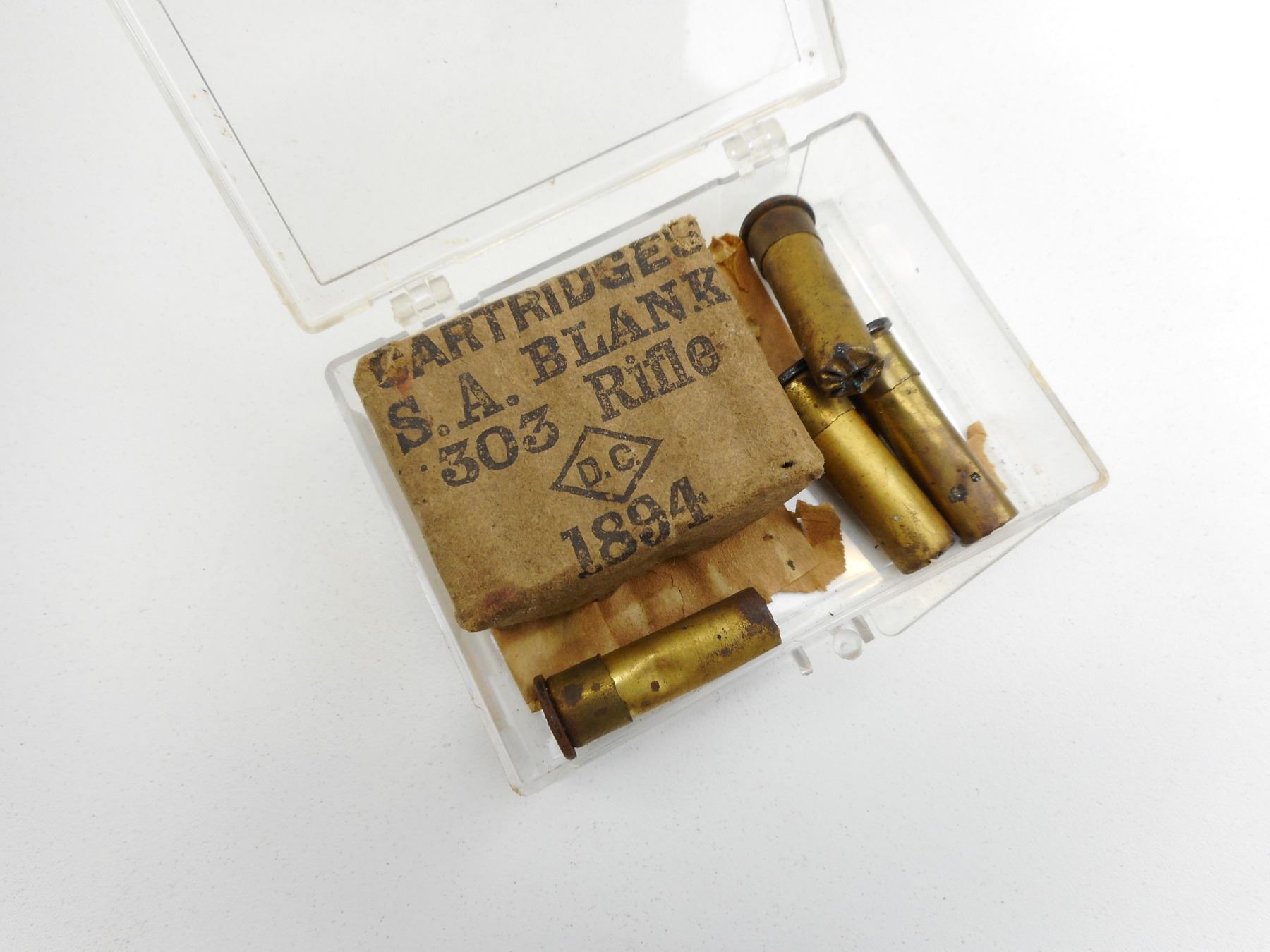 .303 RIFLE BLANKS , 4 RNDS .303 RIFLE BLANKS, DATED 1894, IN HARD PLASTIC AMMO CASE