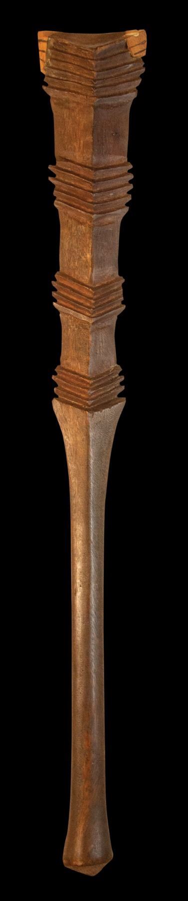 (1960s) Straight out of the early OA catalog is this imposing Fijian War Club. This is the master with two older repaired breaks which were common in the patterns with their high level of repeated use. 34.5"x5". VG+ with older repairs and overall typical wear.