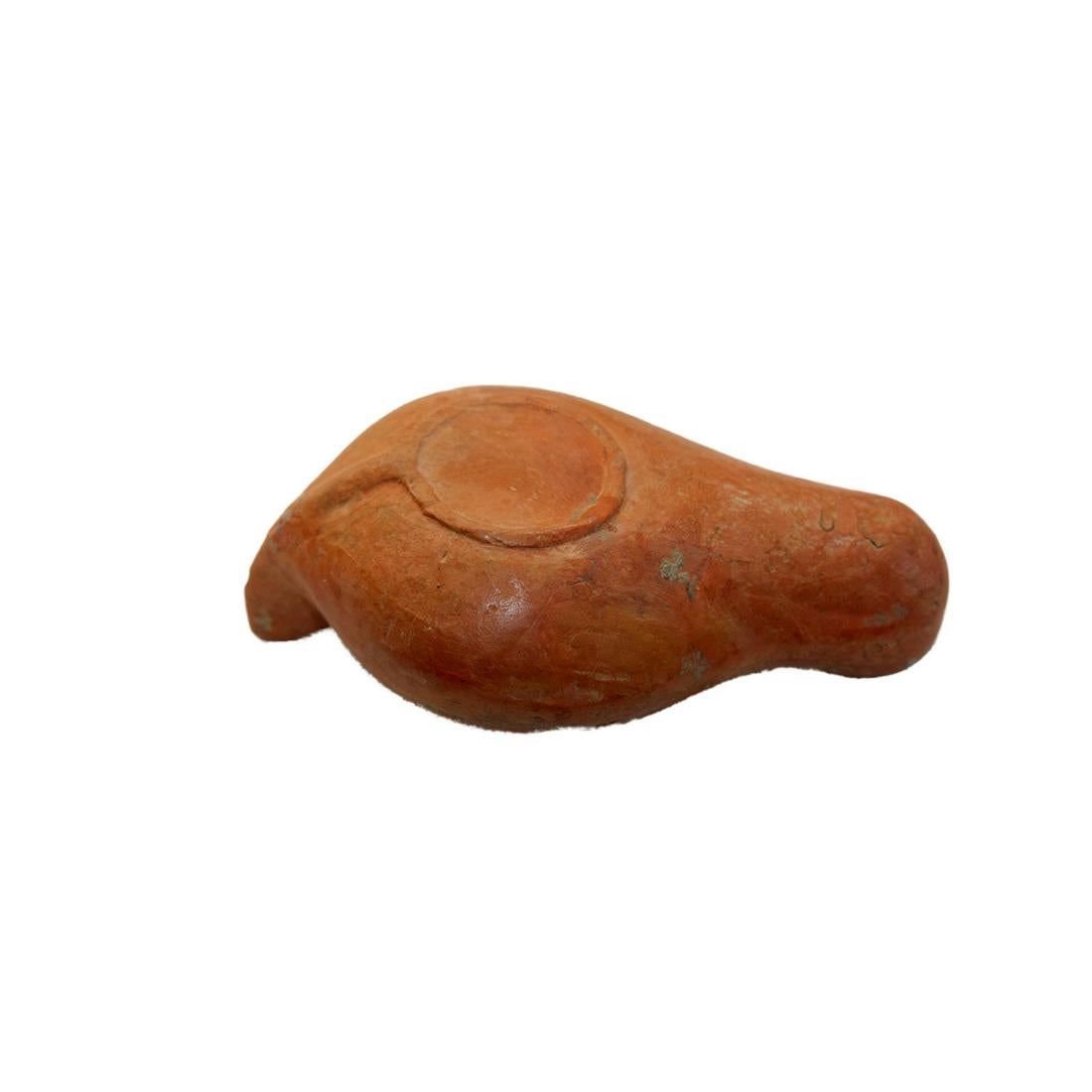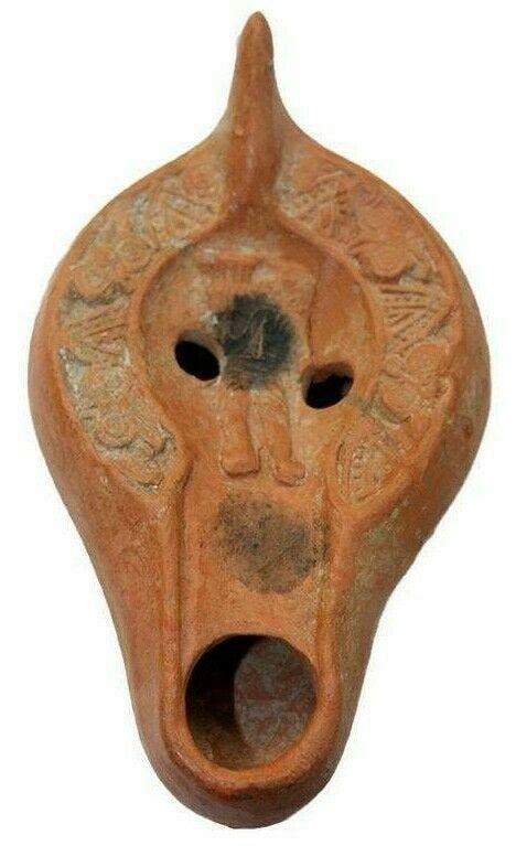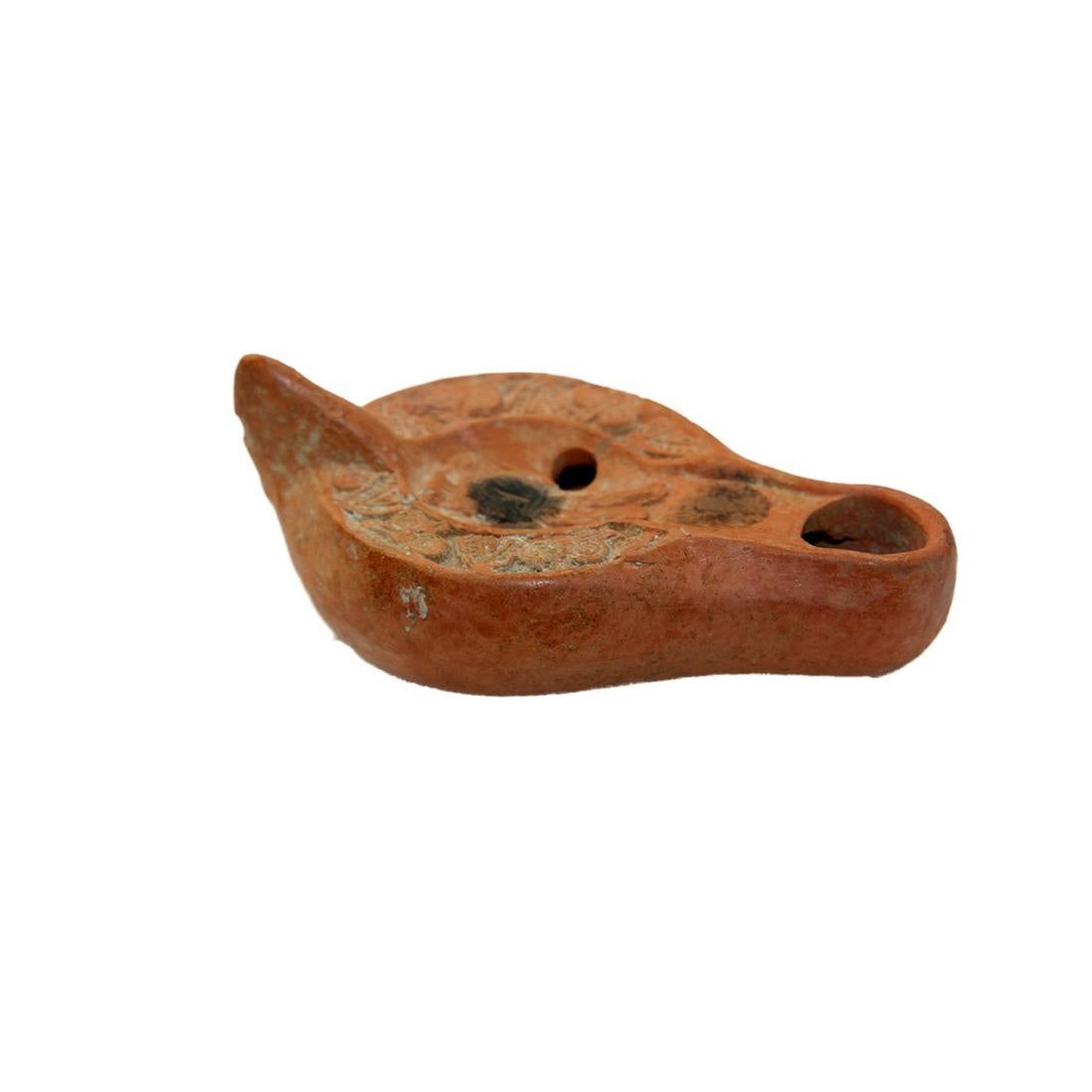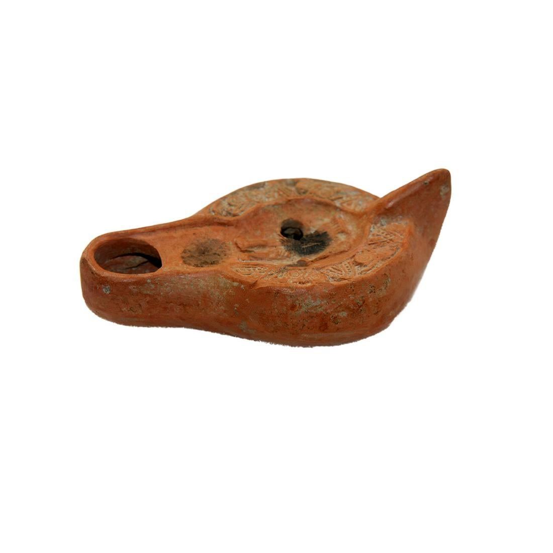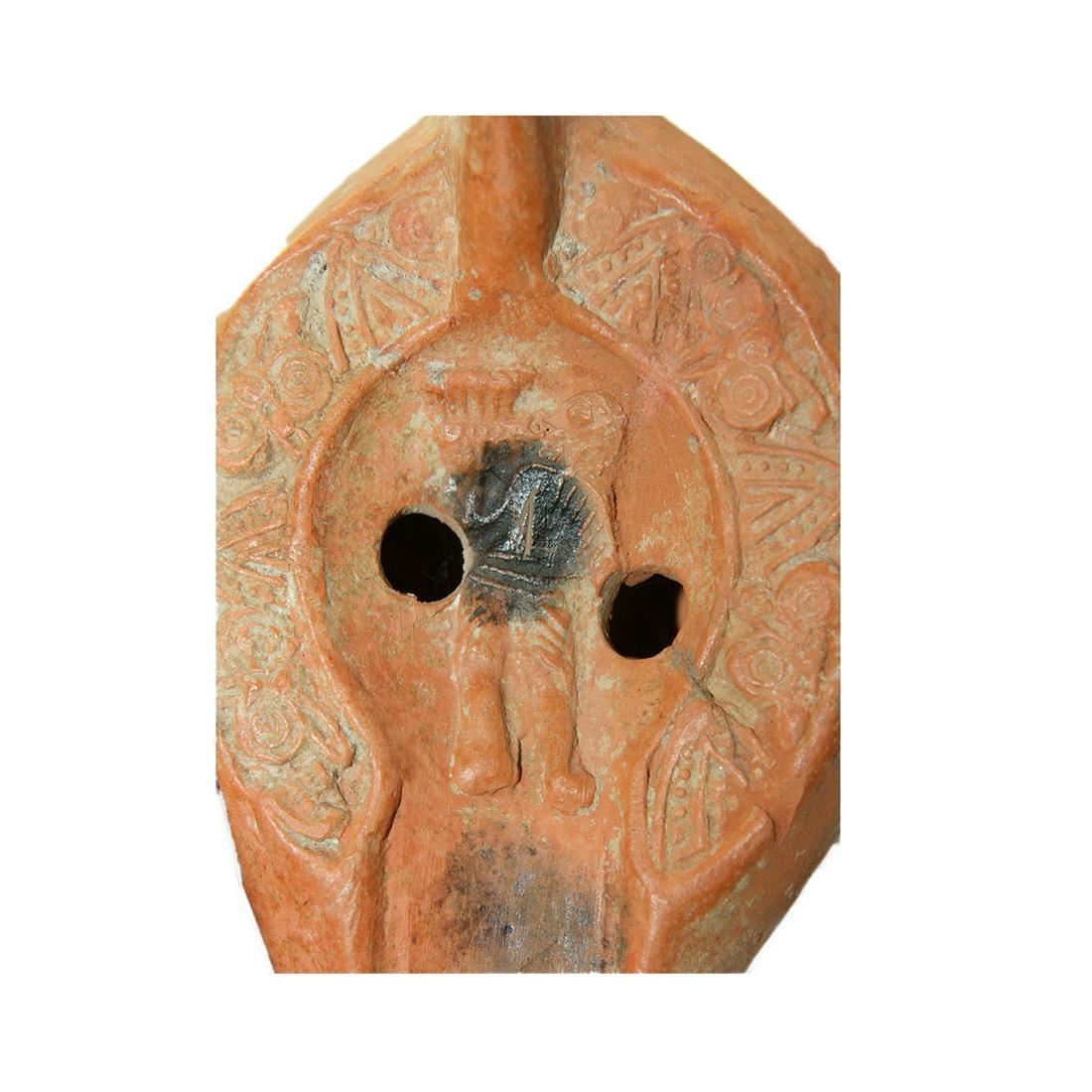 Ancient Roman Carthaginian with Figure Oil Lamp c.2nd century AD. Size 4 1/8 inches length. Fine red terracotta oil lamp with standing figure holding vase in the center with decorated border. Ex Harlen Berk USA.