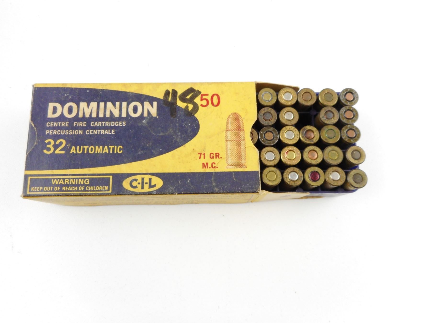 32 AUTOMATIC AMMO ASSORTED , 49 RNDS 32 AMMO, ASSORTED IN VINTAGE DOMINION BOX