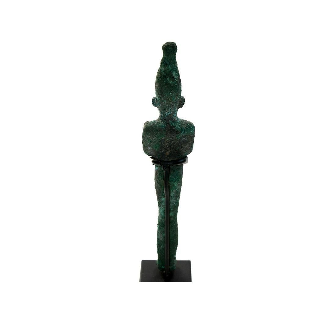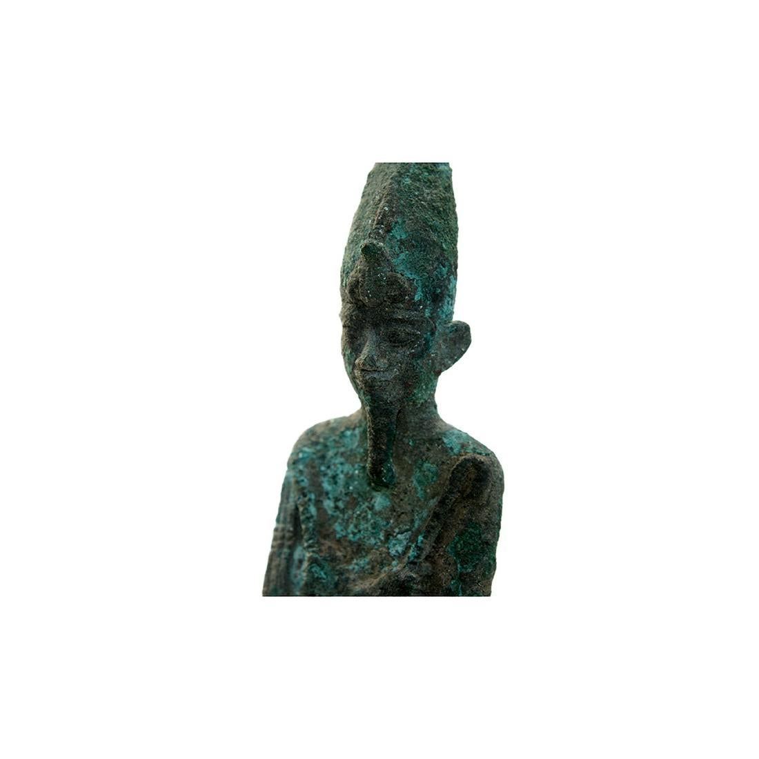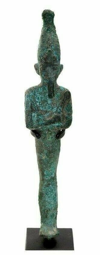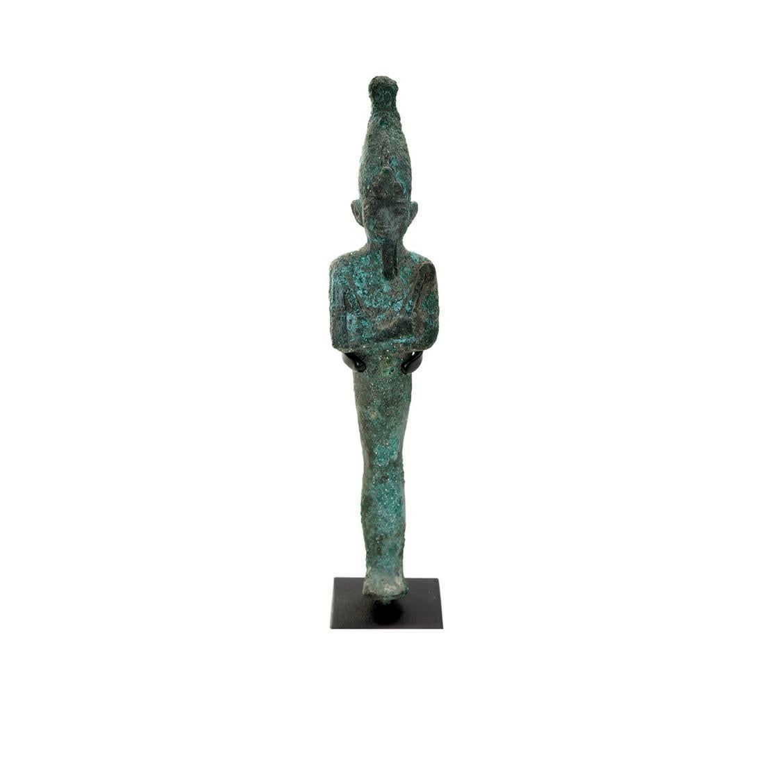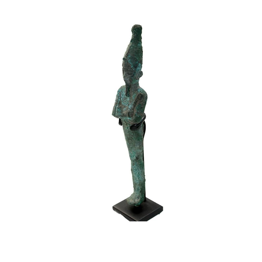 Ancient Egyptian Bronze Figure of Osiris c.700 BC. Size 7 1/8 inches high + mount. Fine Hollow cast bronze figure of Osiris, the god and judge of the dead, is depicted in his traditional, mummiform with his arms crossed at the wrists over his chest, with his hands holding a crook and flail respectively. These attributes suggest that the origins of Osiris lay in the agricultural and pastoral pursuits of the early ancient Egyptians who used the flail to thresh grain and the crook to shepherd their flocks. Wearing Crown of Upper Egypt with uraeus, or sacred cobra. Ex Harlen Berk USA. Custom mounted.