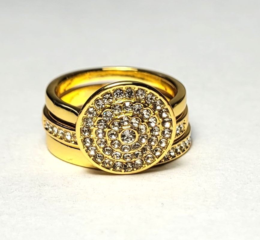 ROUND CENTRE SETTING WITH CLEAR CRYSTALS AND 2 , 1/2 ETERNITY GUARD RINGS, SIZE 7. JEWELERY