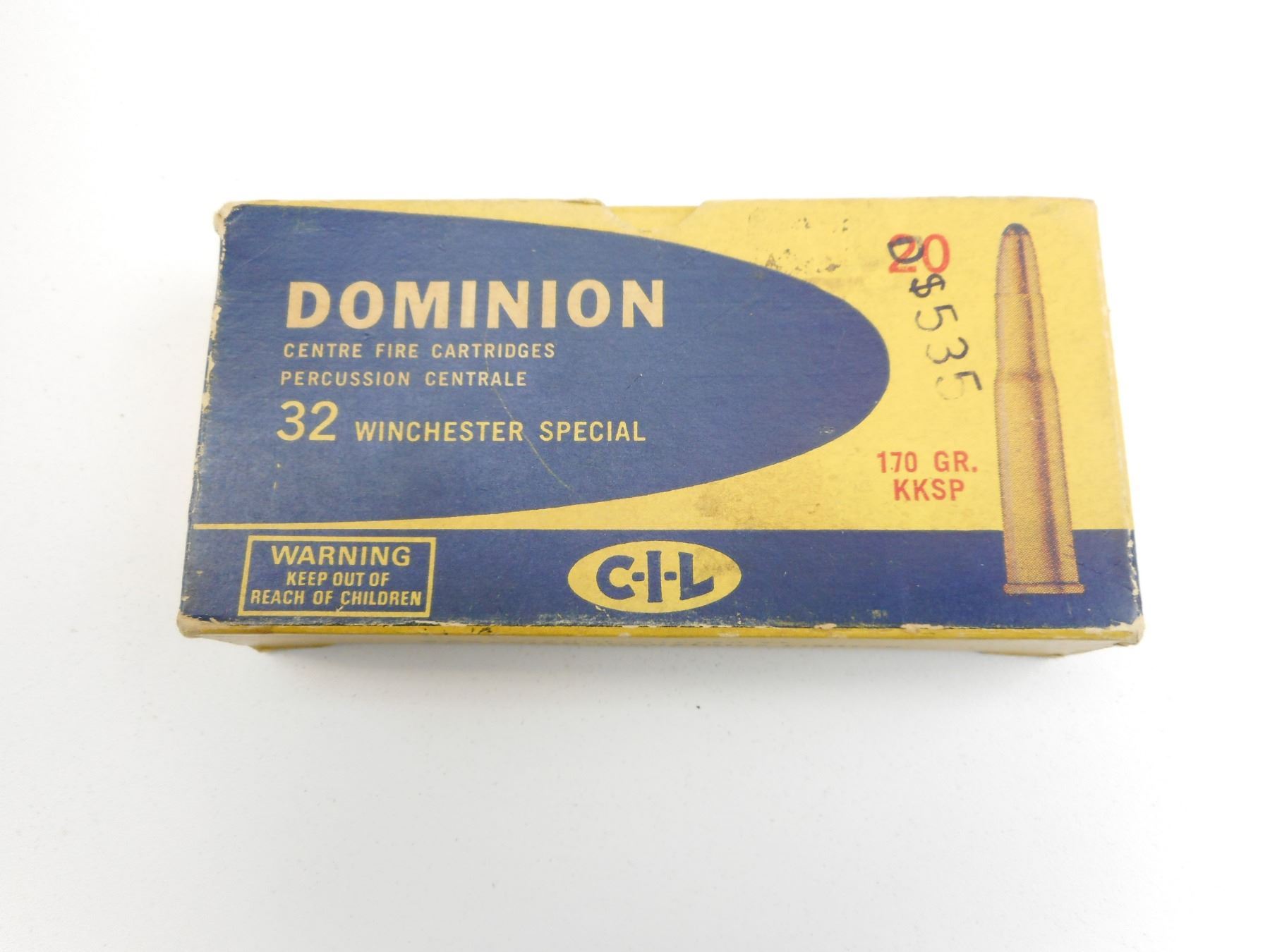 32 WINCHESTER SPECIAL SP AMMO , 20 RNDS 32 WINCHESTER SPECIAL AMMO, IN VINTAGE DOMININION BOX