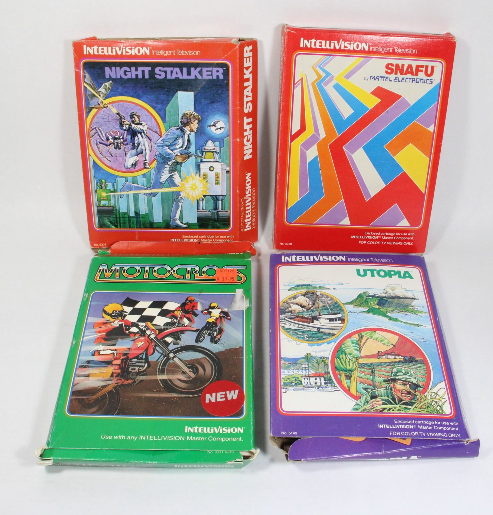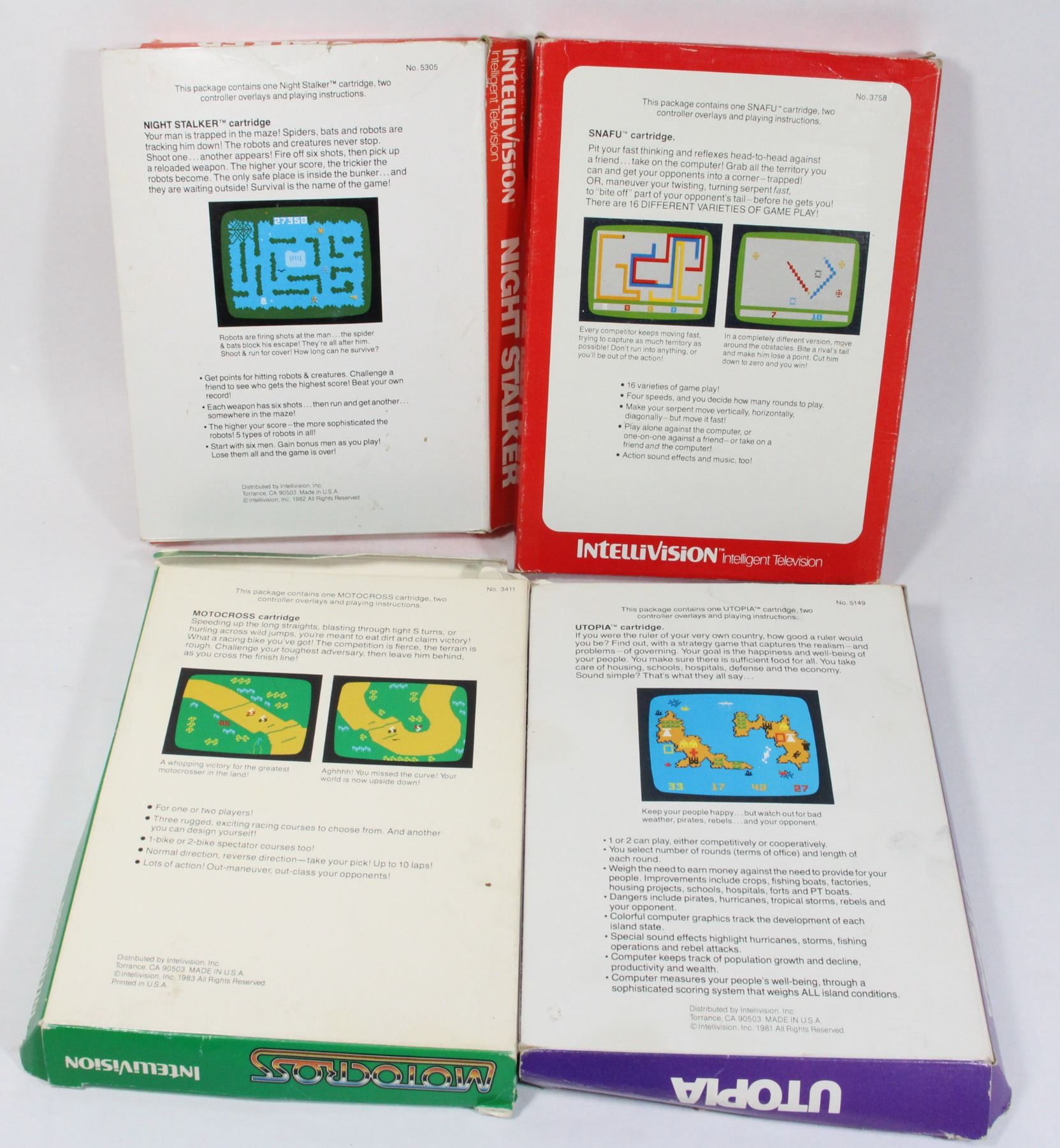 Lot of 4 CIB Games includes Utopia, Night Stalker Motocross and Snafu Intellivision Game CIB Complete in Box with game, manual and 2 controller overlays. Intellivision Mattel Electronics 1980's Video Game