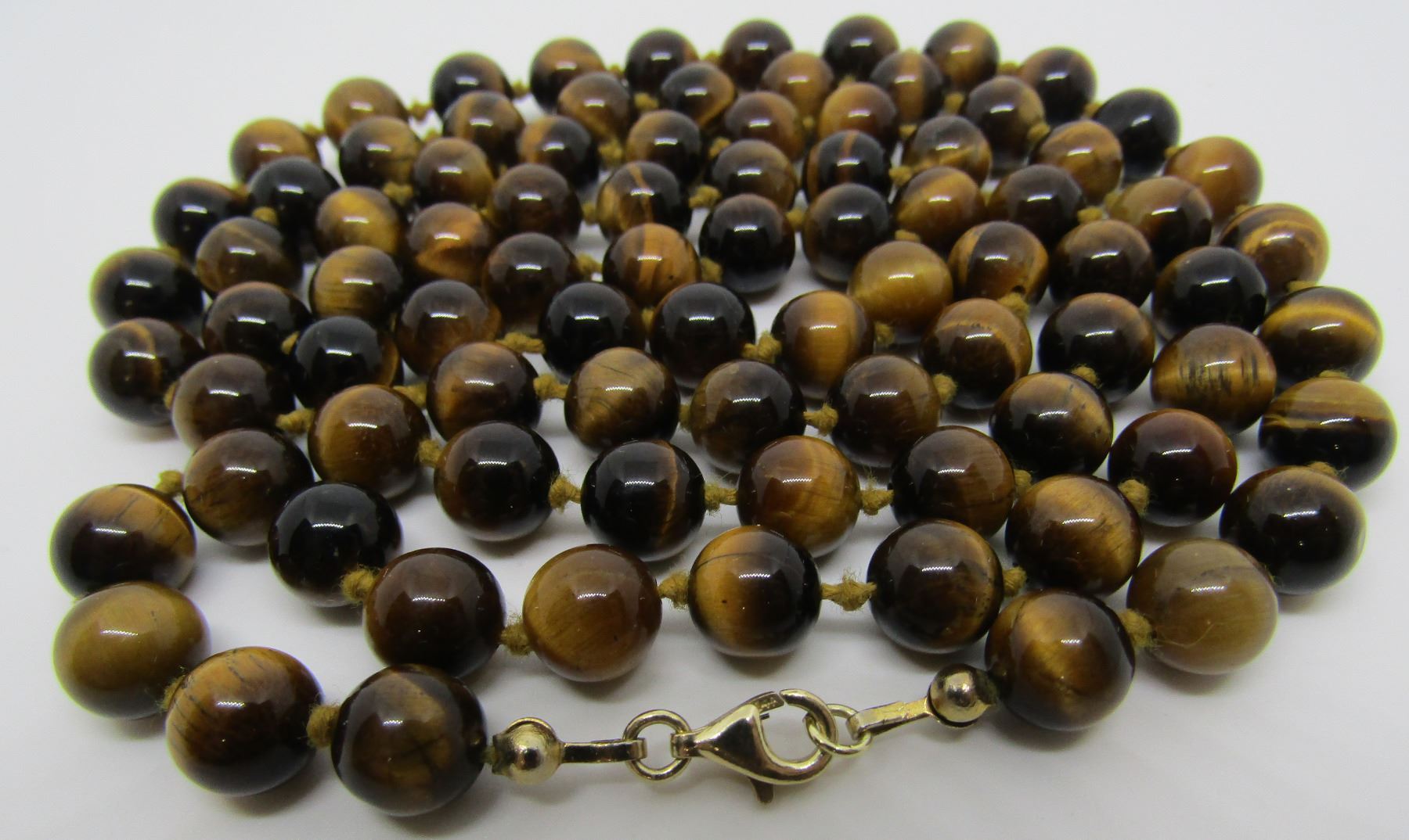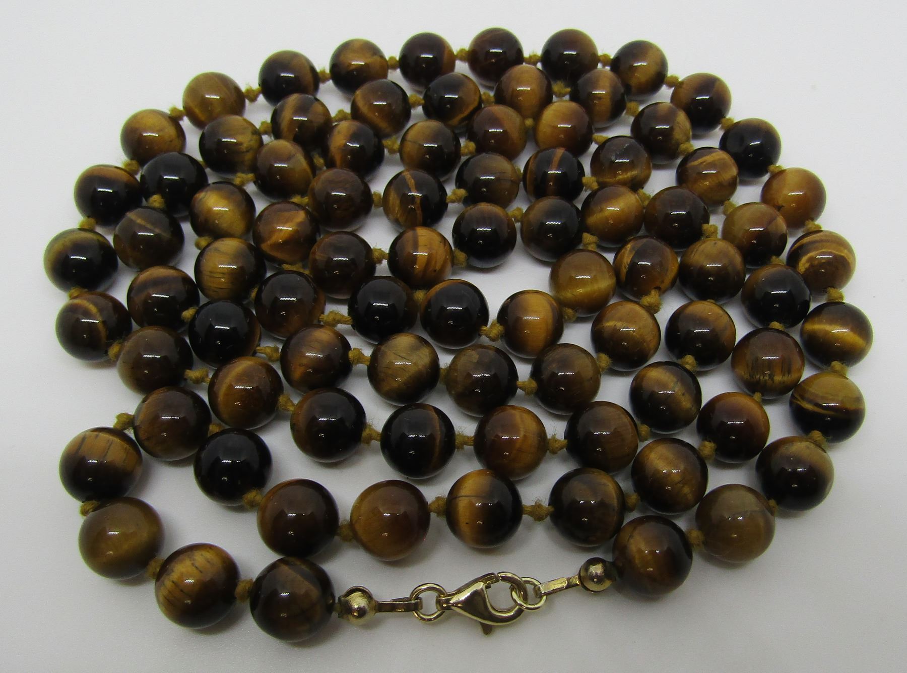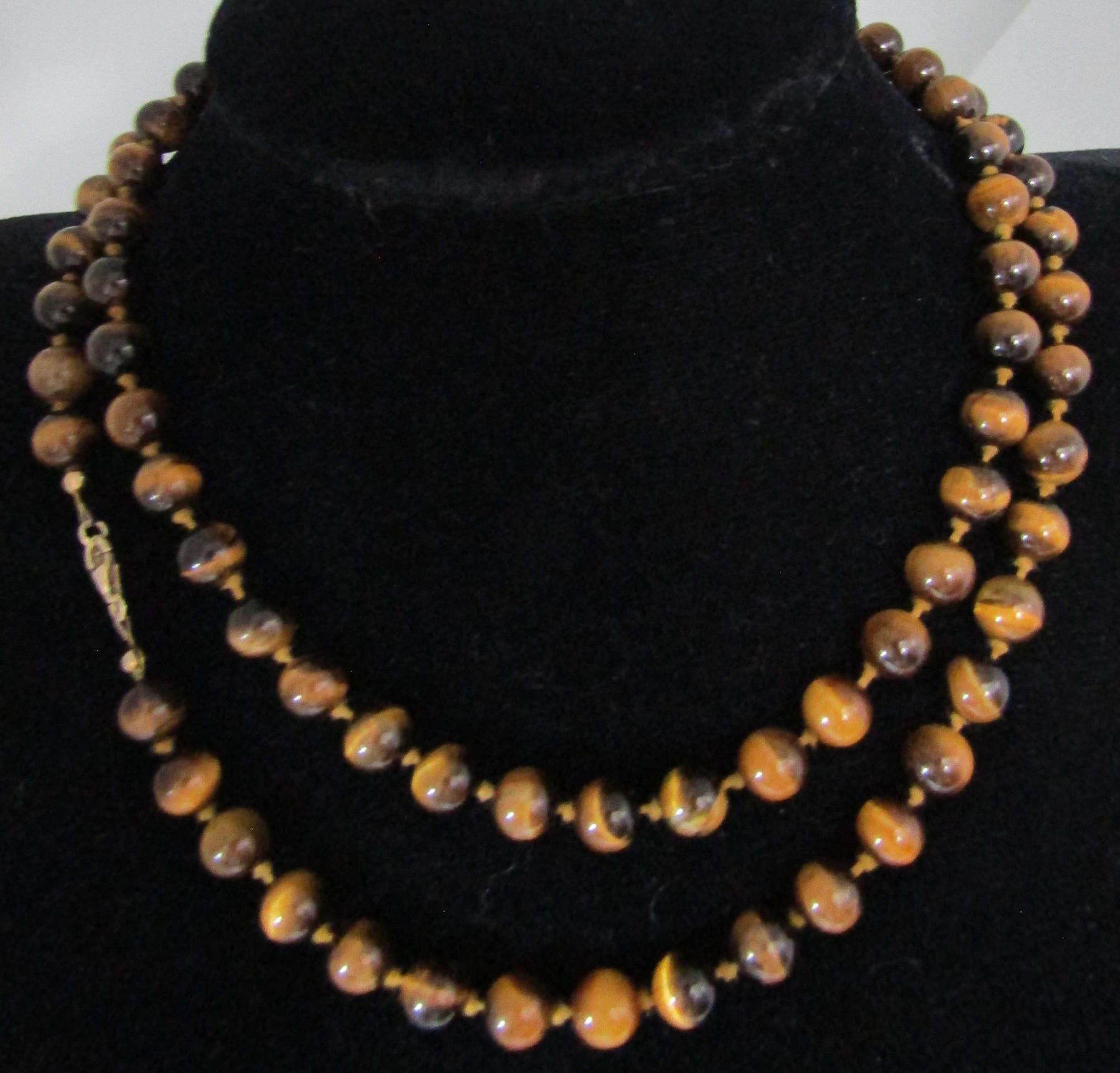 VINTAGE ESTATE 34 INCH LONG STRAND OF GENUINE 8MM TIGER EYE STONES. 14K YELLOW GOLD CATCH. WEIGHT: 59.4 GRAMS. USA SHIPPING $5