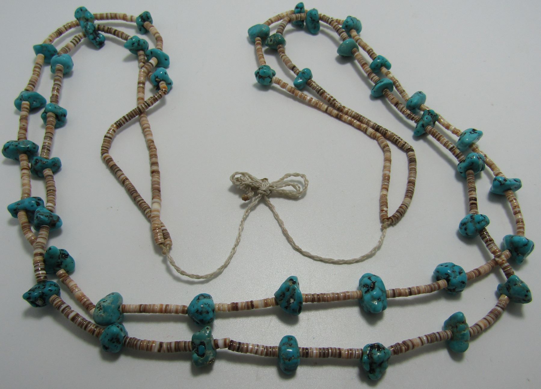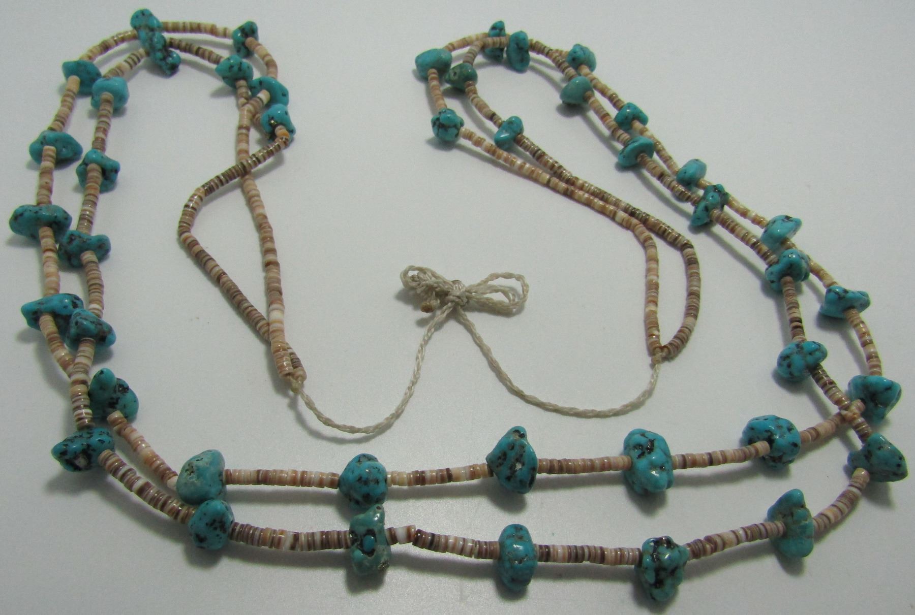 VINTAGE ESTATE NATIVE AMERICAN SOUTHWEST INDIAN JEWELRY. 3MM HEISHI BEADS WITH TURQUOISE NUGGETS 11MM TO 15MM. WEIGHS 56.4GRAMS. 34 INCHES LONG OVERALL. USA SHIPPING $5.