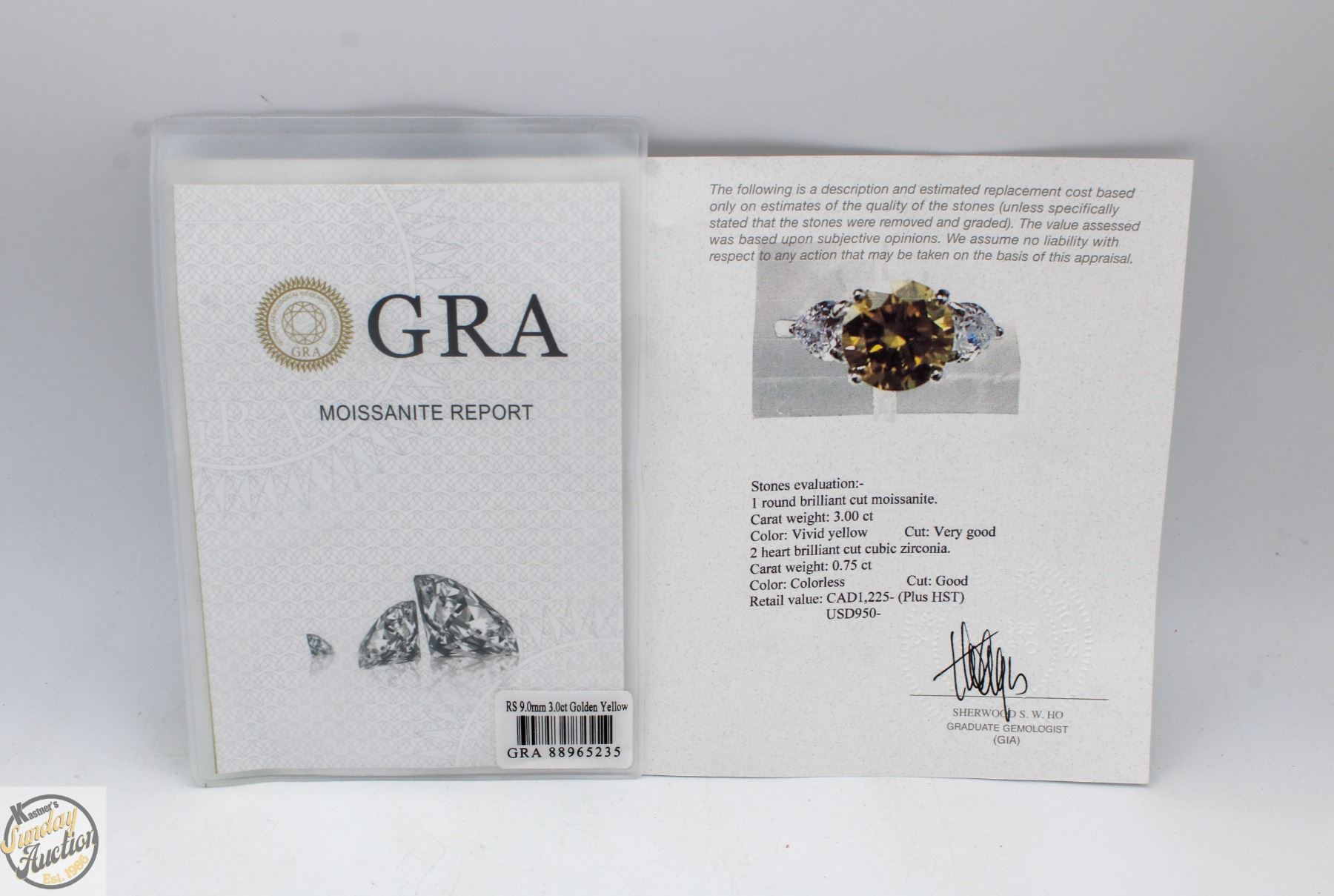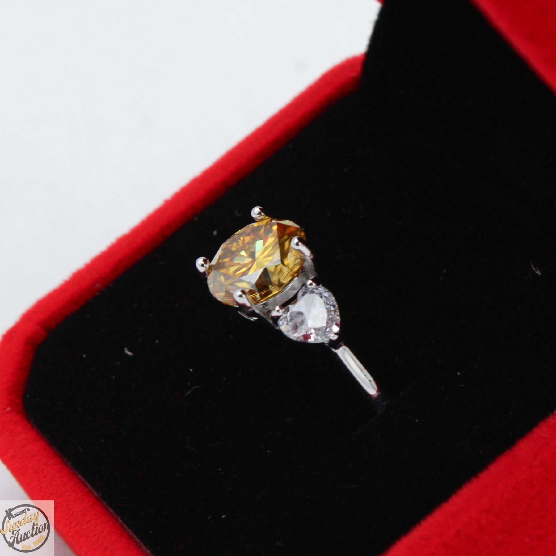 MOISSANITE STONE VVS VIVID YELLOW COLOR WITH 2 HEART SHAPED CUBIC ZIRCONIA SET ON EITHER SIDE SET IN 925 SILVER RING SIZE 7 RETAIL VALUE $1,225.00 **ALL ITEMS MUST BE REMOVED BY 5PM SATURDAY, DECEMBER 20TH 2025. ALL REMAINING ITEMS WILL BE SUBJECT TO A $6.00 PER DAY STORAGE CHARGE. ANY ITEMS REMAINING AFTER MONDAY, JANUARY 5TH 2026 WILL BE CONSIDERED FORFEITED. NO REFUNDS WILL BE ISSUED FOR FORFEITED ITEMS. TO SCHEDULE A PICK UP APPOINTMENT CLICK HERE