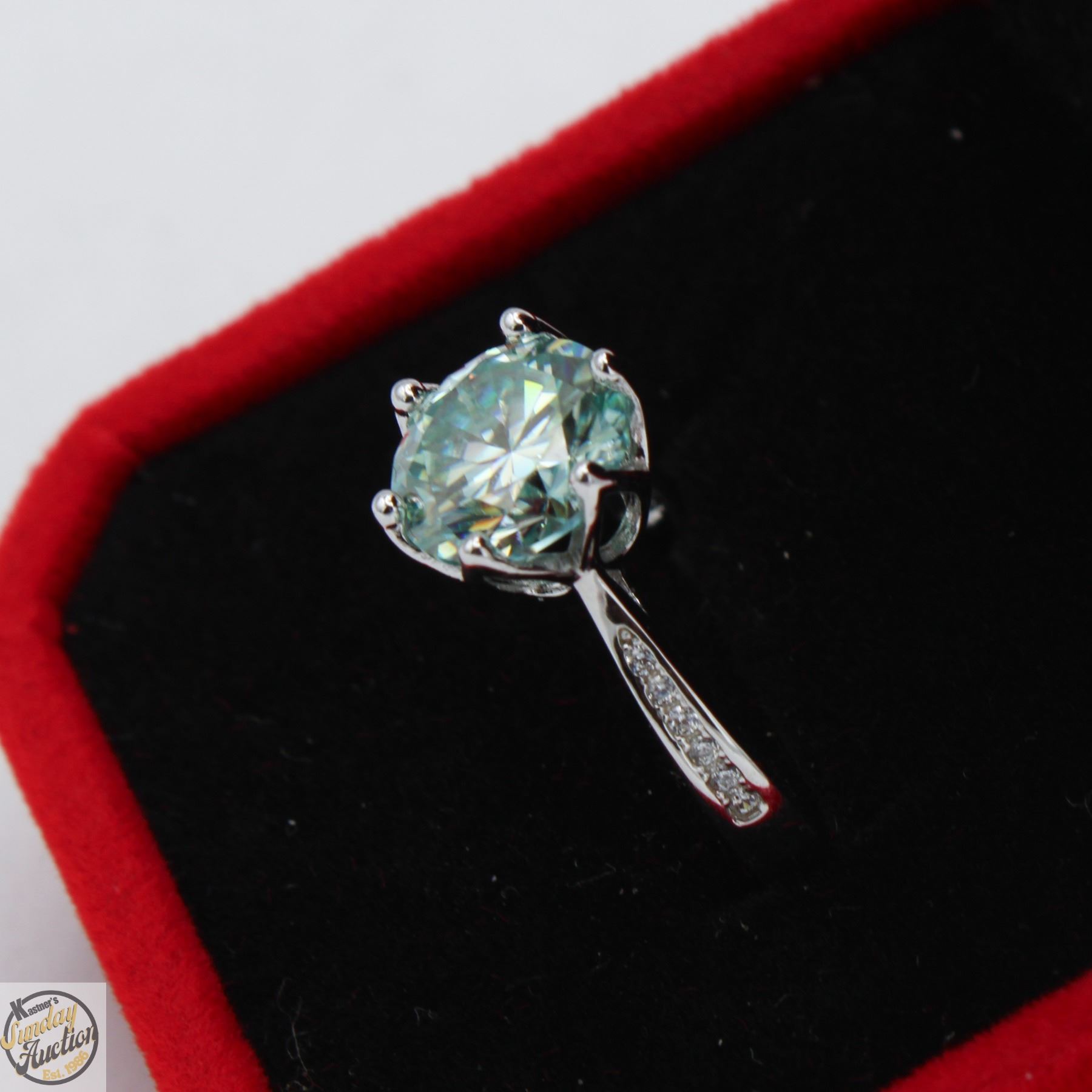 MOISSANITE STONE VVS FANCY LIGHT BLUE COLOR WITH 12 ROUND BRILLIANT CUT CUBIC ZIRCONIA SET IN SHANKS SET IN 925 SILVER RING SIZE 7.25 RETAIL VALUE $1,275.00 **ALL ITEMS MUST BE REMOVED BY 5PM SATURDAY, DECEMBER 20TH 2025. ALL REMAINING ITEMS WILL BE SUBJECT TO A $6.00 PER DAY STORAGE CHARGE. ANY ITEMS REMAINING AFTER MONDAY, JANUARY 5TH 2026 WILL BE CONSIDERED FORFEITED. NO REFUNDS WILL BE ISSUED FOR FORFEITED ITEMS. TO SCHEDULE A PICK UP APPOINTMENT CLICK HERE