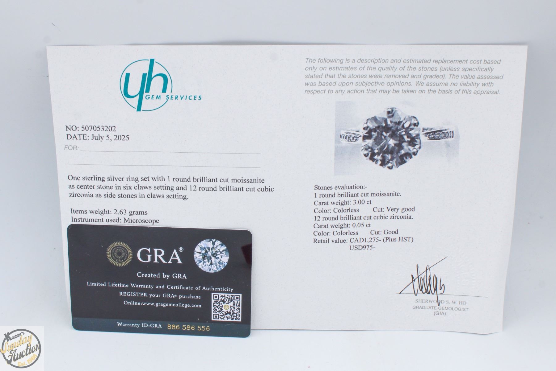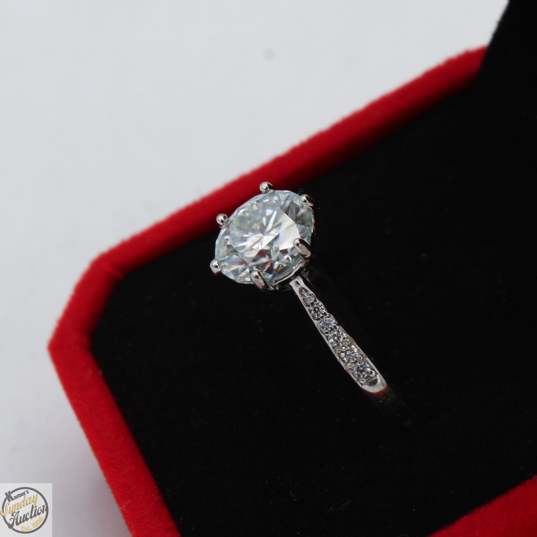 MOISSANITE STONE VVS D COLOR WITH 12 ROUND BRILLIANT CUT CUBIC ZIRCONIA SET IN SHANKS SET IN 925 SILVER RING SIZE ADJUSTABLE RETAIL VALUE $1,275.00 **ALL ITEMS MUST BE REMOVED BY 5PM SATURDAY, DECEMBER 20TH 2025. ALL REMAINING ITEMS WILL BE SUBJECT TO A $6.00 PER DAY STORAGE CHARGE. ANY ITEMS REMAINING AFTER MONDAY, JANUARY 5TH 2026 WILL BE CONSIDERED FORFEITED. NO REFUNDS WILL BE ISSUED FOR FORFEITED ITEMS. TO SCHEDULE A PICK UP APPOINTMENT CLICK HERE