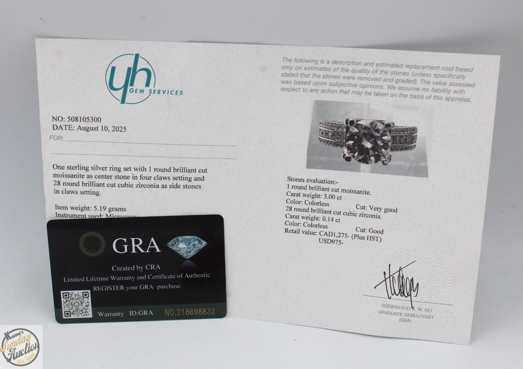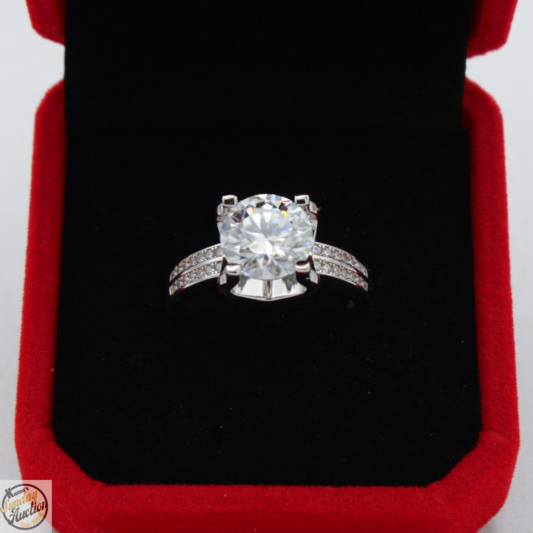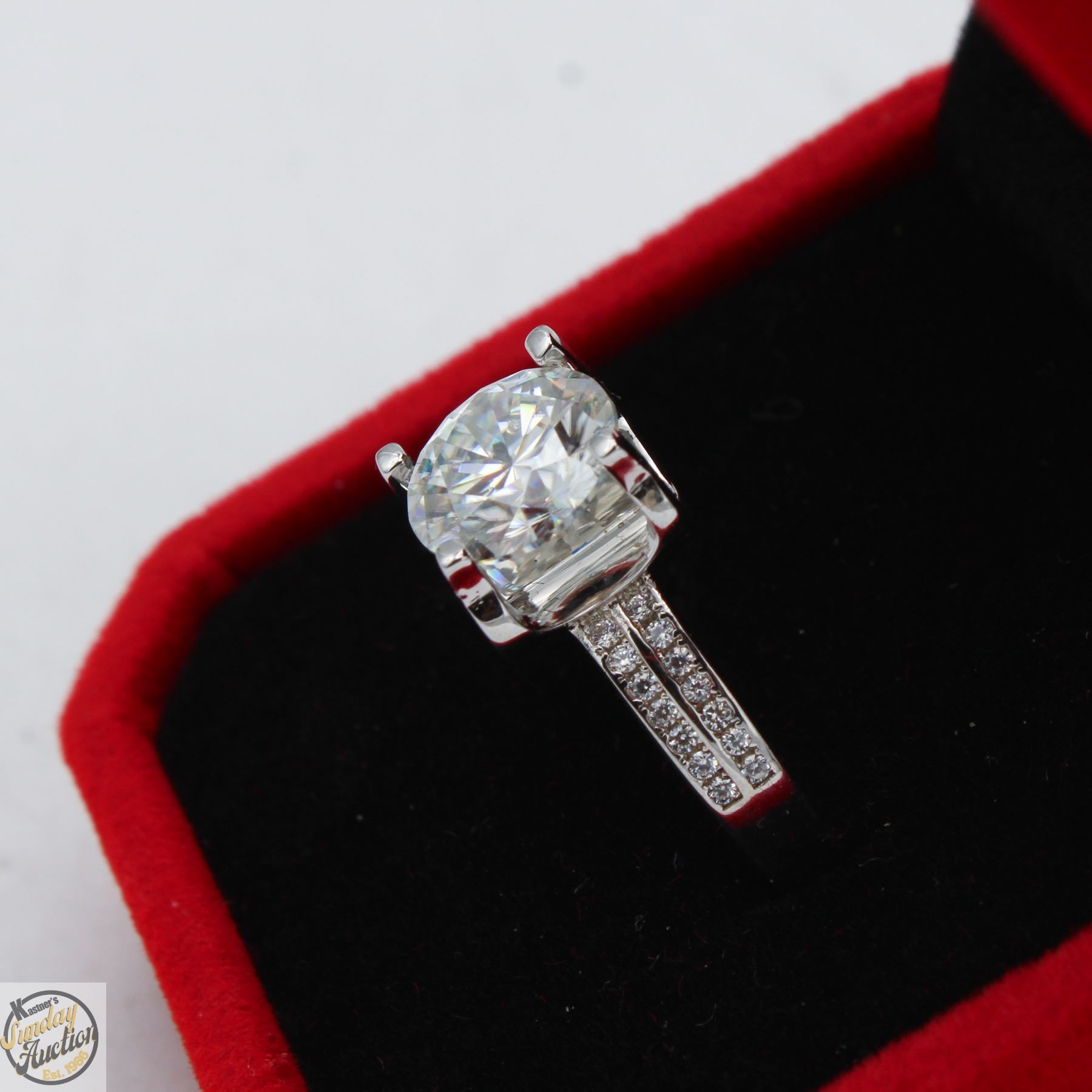 MOISSANITE STONE VVS D COLOR WITH 28 ROUND BRILLIANT CUT CUBIC ZIRCONIA SET IN DUAL ROWS PER SHANK SET ON EITHER SIDE OF LARGER STONES SET IN 925 SILVER RING SIZE 7.5 RETAIL VALUE $1,275.00 **ALL ITEMS MUST BE REMOVED BY 5PM SATURDAY, DECEMBER 20TH 2025. ALL REMAINING ITEMS WILL BE SUBJECT TO A $6.00 PER DAY STORAGE CHARGE. ANY ITEMS REMAINING AFTER MONDAY, JANUARY 5TH 2026 WILL BE CONSIDERED FORFEITED. NO REFUNDS WILL BE ISSUED FOR FORFEITED ITEMS. TO SCHEDULE A PICK UP APPOINTMENT CLICK HERE