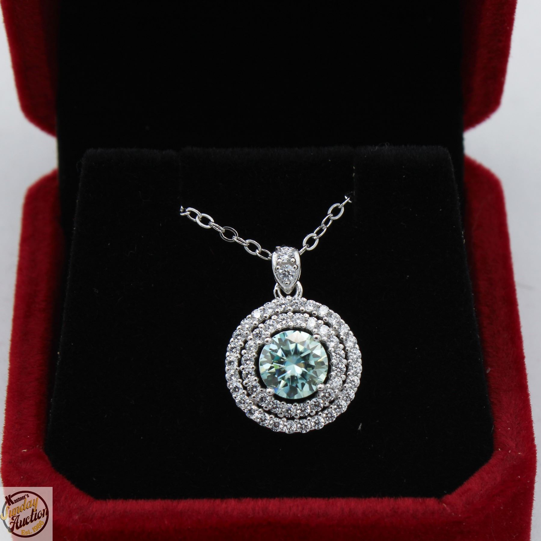MOISSANITE STONE VVS FANCY BLUE COLOR WITH 50 ROUND BRILLIANT CUT CUBIC ZIRCONIA SET IN DUAL HALOS SET IN 925 SILVER PENDANT RETAIL VALUE $875.00 **ALL ITEMS MUST BE REMOVED BY 5PM SATURDAY, DECEMBER 20TH 2025. ALL REMAINING ITEMS WILL BE SUBJECT TO A $6.00 PER DAY STORAGE CHARGE. ANY ITEMS REMAINING AFTER MONDAY, JANUARY 5TH 2026 WILL BE CONSIDERED FORFEITED. NO REFUNDS WILL BE ISSUED FOR FORFEITED ITEMS. TO SCHEDULE A PICK UP APPOINTMENT CLICK HERE