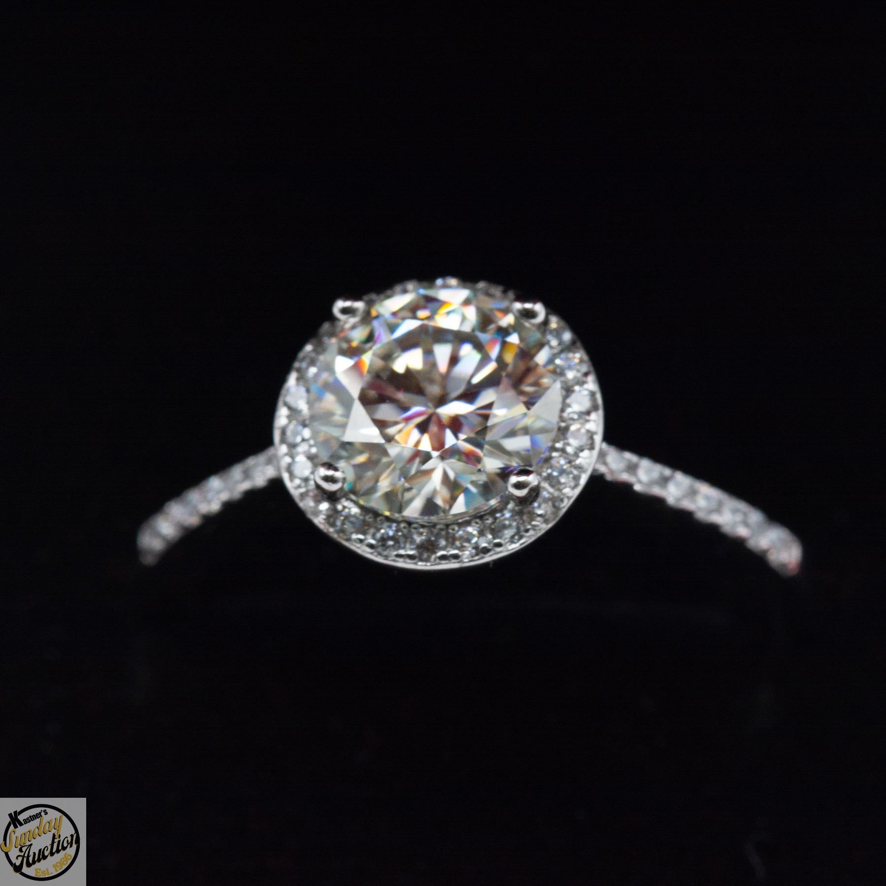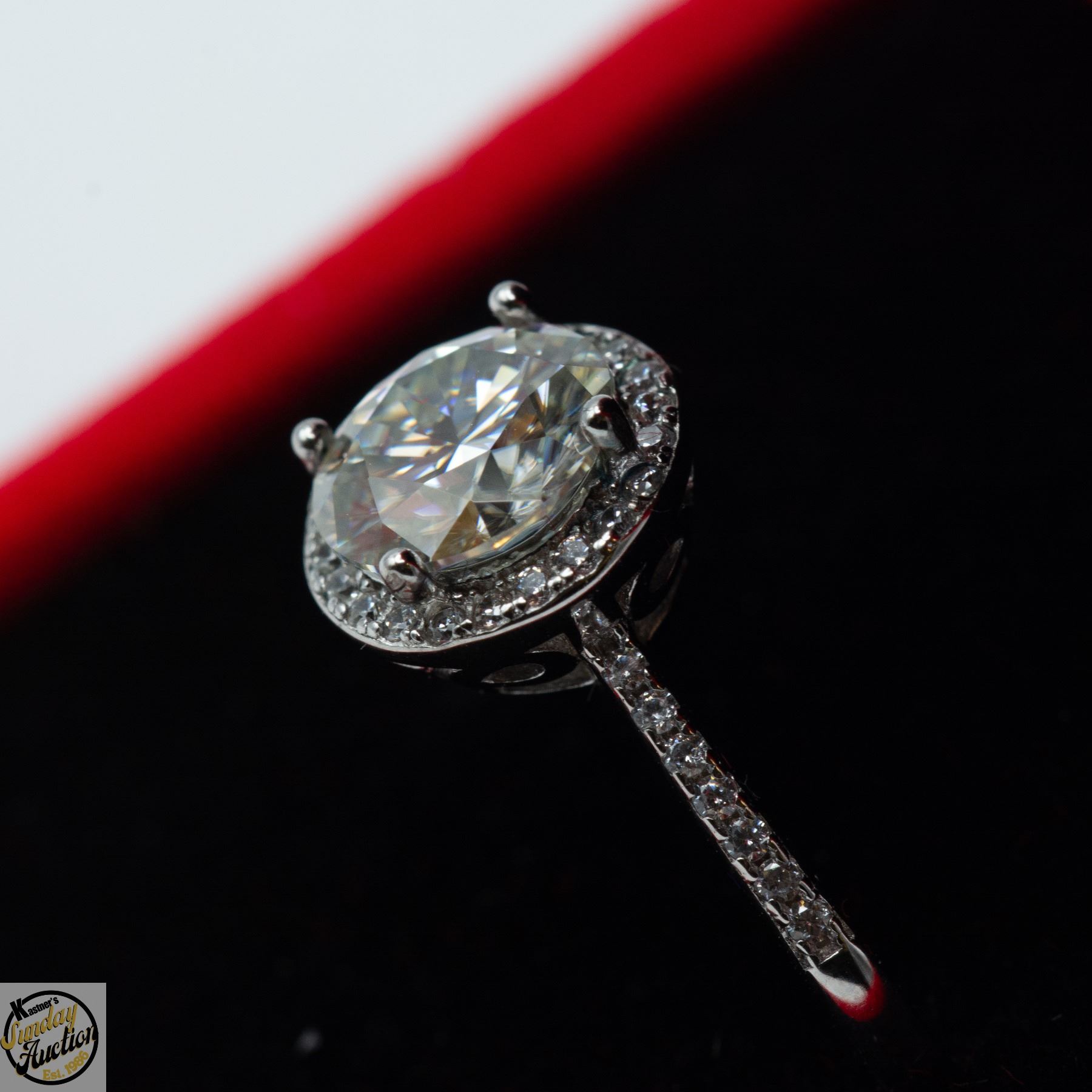 CUT MOISSANITE STONE VVS D COLOR WITH 34 ROUND BRILLIANT CUT CUBIC ZIRCONIA SET IN ROUND HALO AND SET IN SHANKS SET IN 925 SILVER RING SIZE ADJUSTABLE **ALL ITEMS MUST BE REMOVED BY 5PM SATURDAY, FEBRUARY 7TH 2025. ALL REMAINING ITEMS WILL BE SUBJECT TO A $6.00 PER DAY STORAGE CHARGE. ANY ITEMS REMAINING AFTER MONDAY, FEBRUARY 23RD 2025 WILL BE CONSIDERED FORFEITED. NO REFUNDS WILL BE ISSUED FOR FORFEITED ITEMS. TO SCHEDULE A PICK UP APPOINTMENT CLICK HERE
