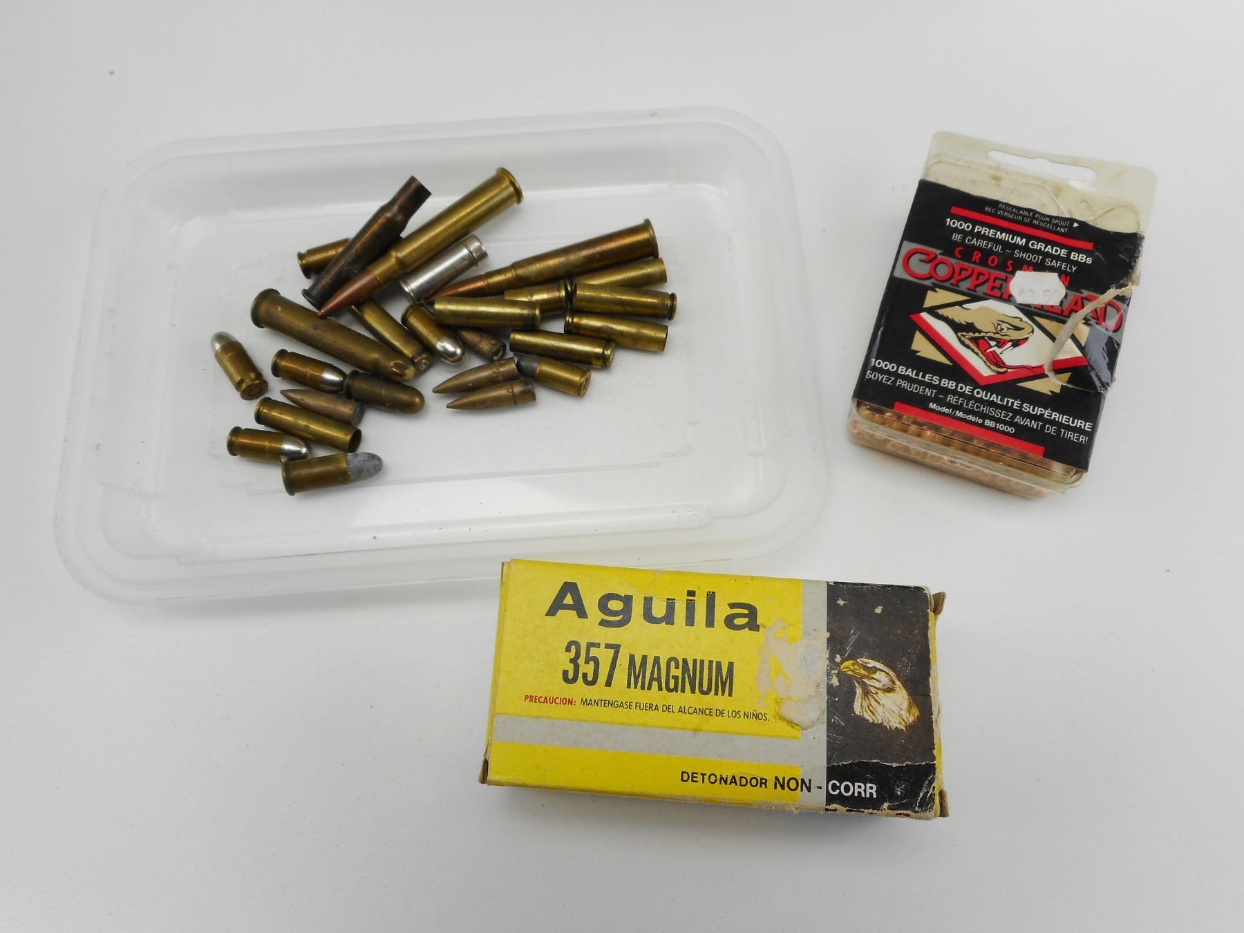 357 MAGNUM AMMO, COPPERHEAD BB'S, ASSORTED AMMO, AND BRASS