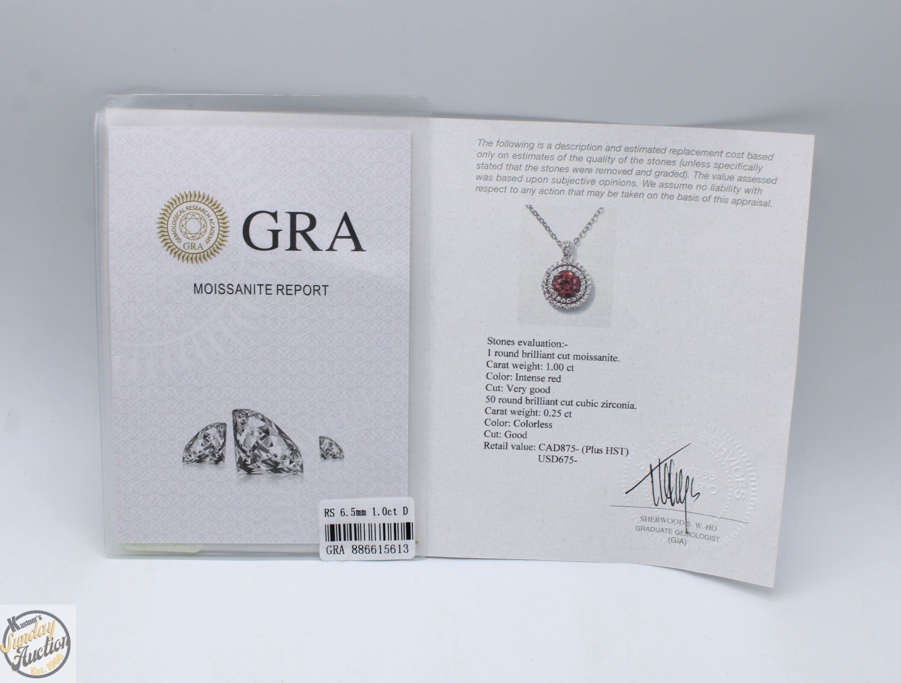 MOISSANITE STONE VVS INTENSE RED COLOR WITH 50 ROUND BRILLIANT CUT CUBIC ZIRCONIA SET IN DUAL ROUND HALO’S SET IN 925 SILVER PENDANT RETAIL VALUE $875.00 **ALL ITEMS MUST BE REMOVED BY 5PM SATURDAY, JANUARY 10TH 2026. ALL REMAINING ITEMS WILL BE SUBJECT TO A $6.00 PER DAY STORAGE CHARGE. ANY ITEMS REMAINING AFTER MONDAY, JANUARY 26TH 2026 WILL BE CONSIDERED FORFEITED. NO REFUNDS WILL BE ISSUED FOR FORFEITED ITEMS. TO SCHEDULE A PICK UP APPOINTMENT CLICK HERE