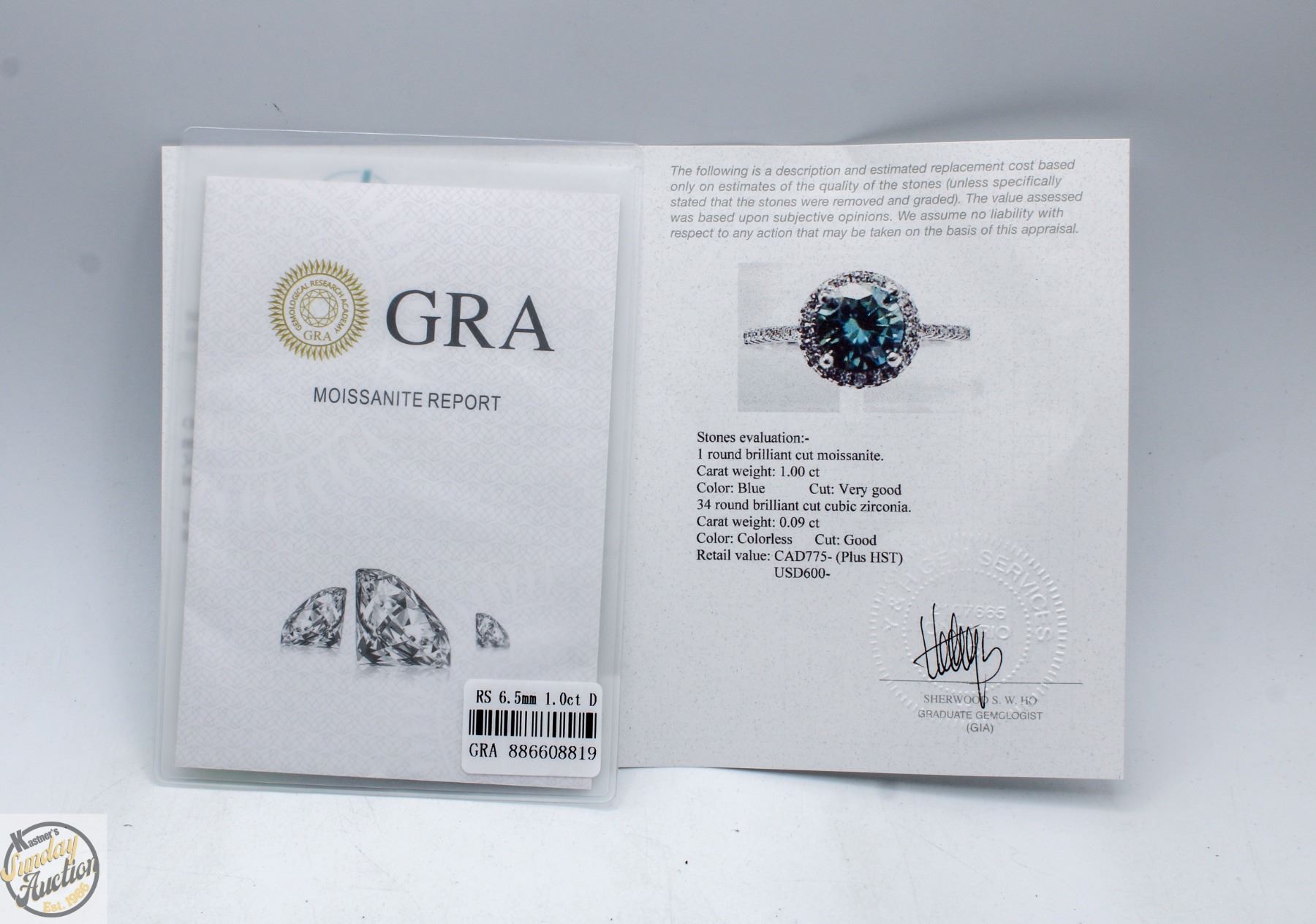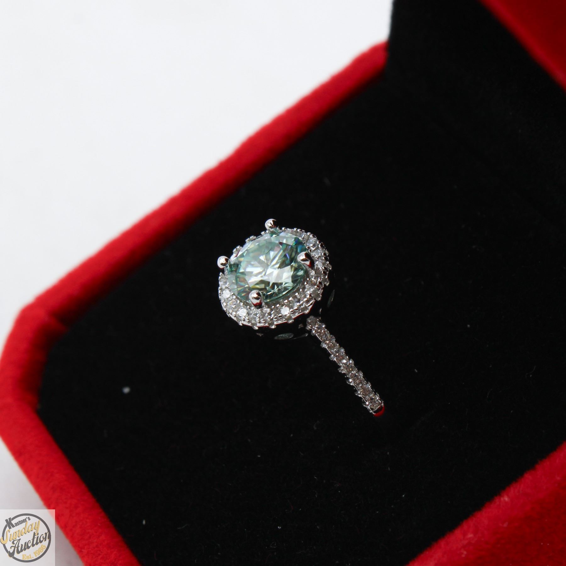 MOISSANITE STONE VVS BLUE COLOR WITH 34 ROUND BRILLIANT CUT CUBIC ZIRCONIA SET IN ROUND SHAPED HALO AND SET IN SHANKS SET IN 925 SILVER RING SIZE 7 RETAIL VALUE $775.00 **ALL ITEMS MUST BE REMOVED BY 5PM SATURDAY, JANUARY 17TH 2026. ALL REMAINING ITEMS WILL BE SUBJECT TO A $6.00 PER DAY STORAGE CHARGE. ANY ITEMS REMAINING AFTER MONDAY, FEBRUARY 2ND 2026 WILL BE CONSIDERED FORFEITED. NO REFUNDS WILL BE ISSUED FOR FORFEITED ITEMS. TO SCHEDULE A PICK UP APPOINTMENT CLICK HERE