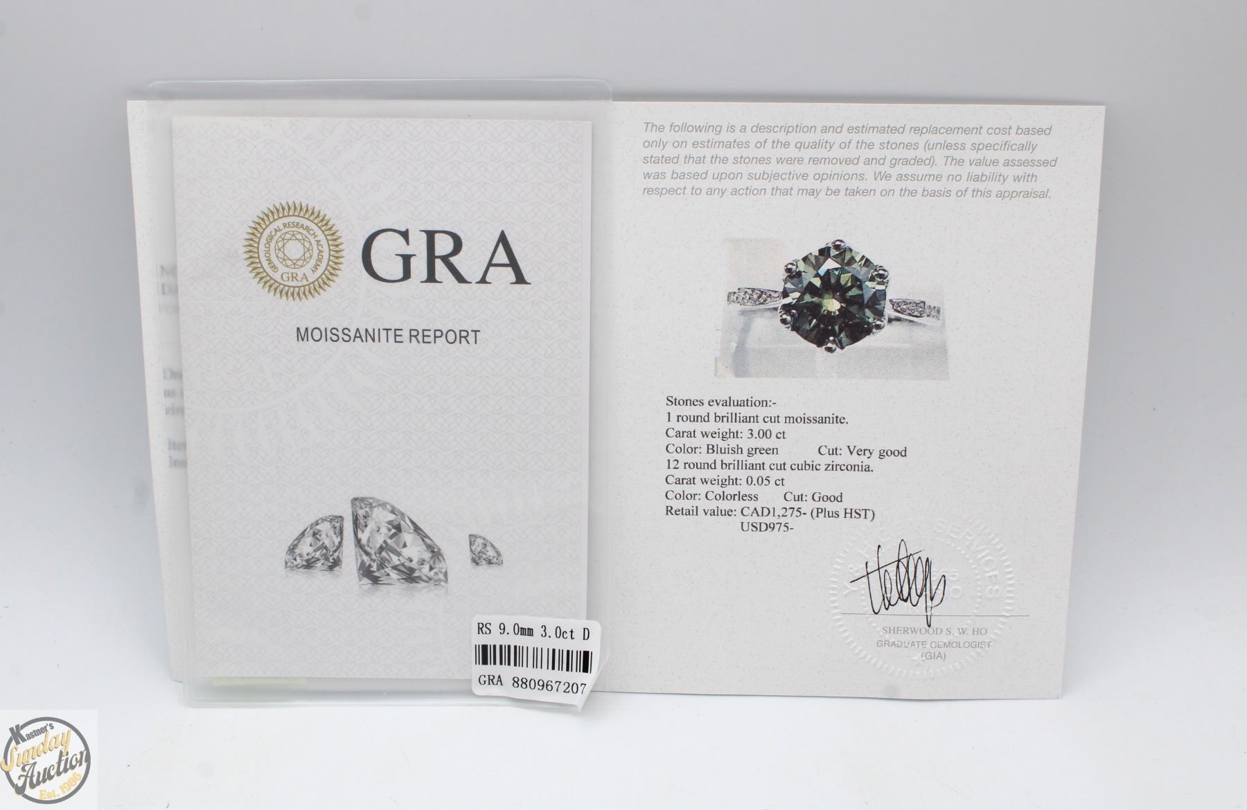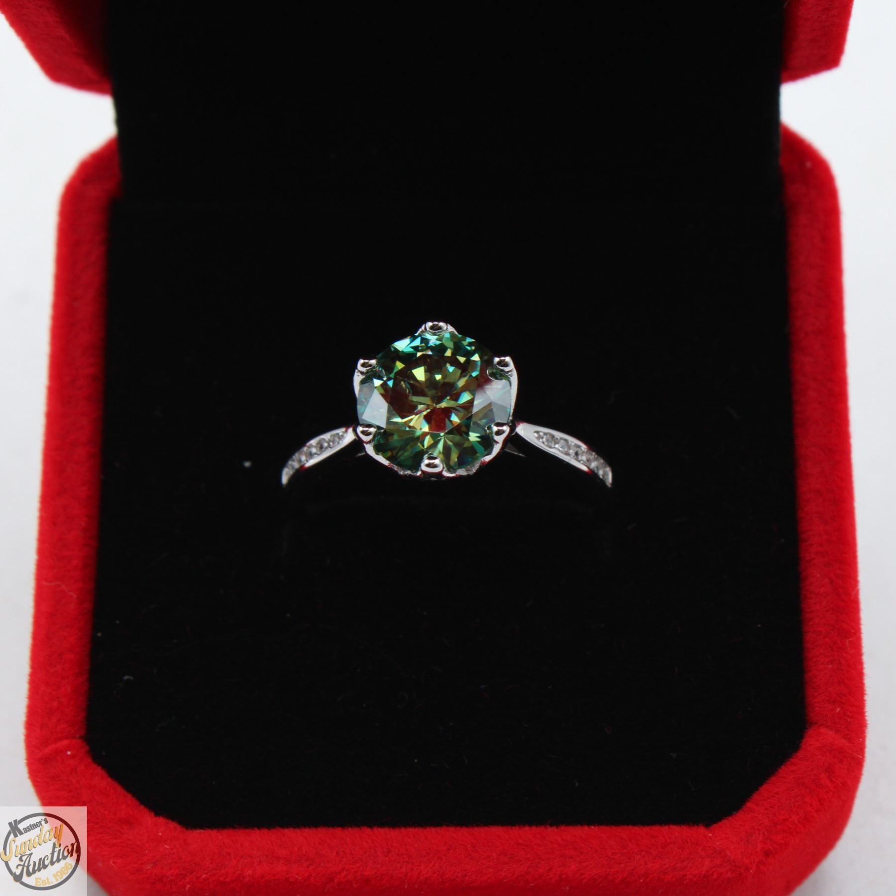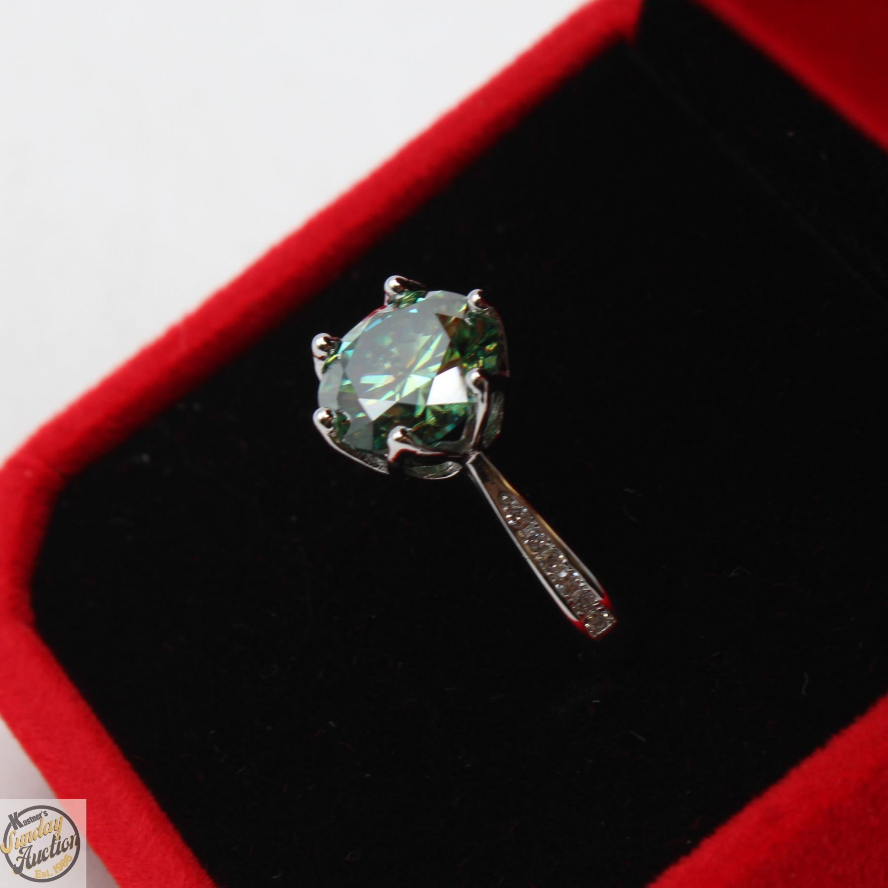 MOISSANITE STONE VVS BLUISH GREEN COLOR WITH 12 ROUND BRILLIANT CUT CUBIC ZIRCONIA SET IN SHANKS SET IN 925 SILVER RING SIZE 7.25 RETAIL VALUE $1,275.00 **ALL ITEMS MUST BE REMOVED BY 5PM SATURDAY, JANUARY 17TH 2026. ALL REMAINING ITEMS WILL BE SUBJECT TO A $6.00 PER DAY STORAGE CHARGE. ANY ITEMS REMAINING AFTER MONDAY, FEBRUARY 2ND 2026 WILL BE CONSIDERED FORFEITED. NO REFUNDS WILL BE ISSUED FOR FORFEITED ITEMS. TO SCHEDULE A PICK UP APPOINTMENT CLICK HERE