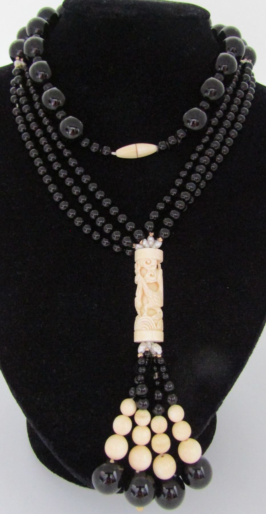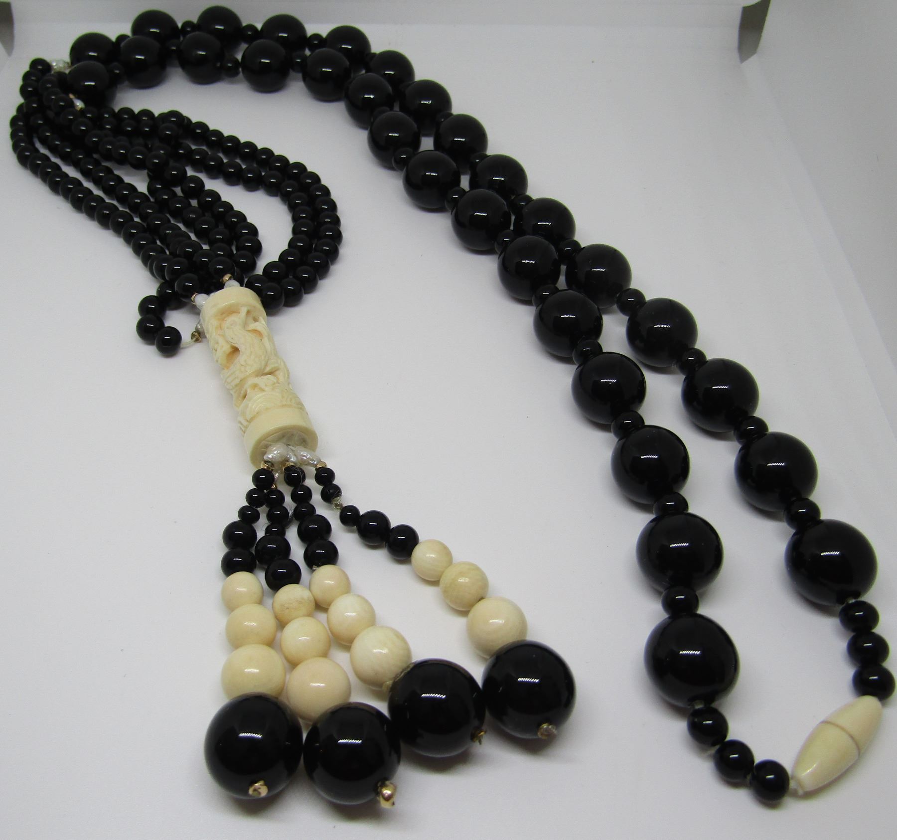 AMAZING VINTAGE ESTATE 36 INCH LONG STRAND PLUS A 4 INCH DROP OF CARVED 41MM LONG 2 BIRDS IN WATER 4 GRADUATED 4MM TO 14MM ONYX. MAIN CHAIN OF 14MM & 6MM ONYX BEADS, 14K YELLOW GOLD & 5MM PEARLS. WEIGHS 192 GRAMS. EXCELLENT CONDITION. USA SHIPPING $10.