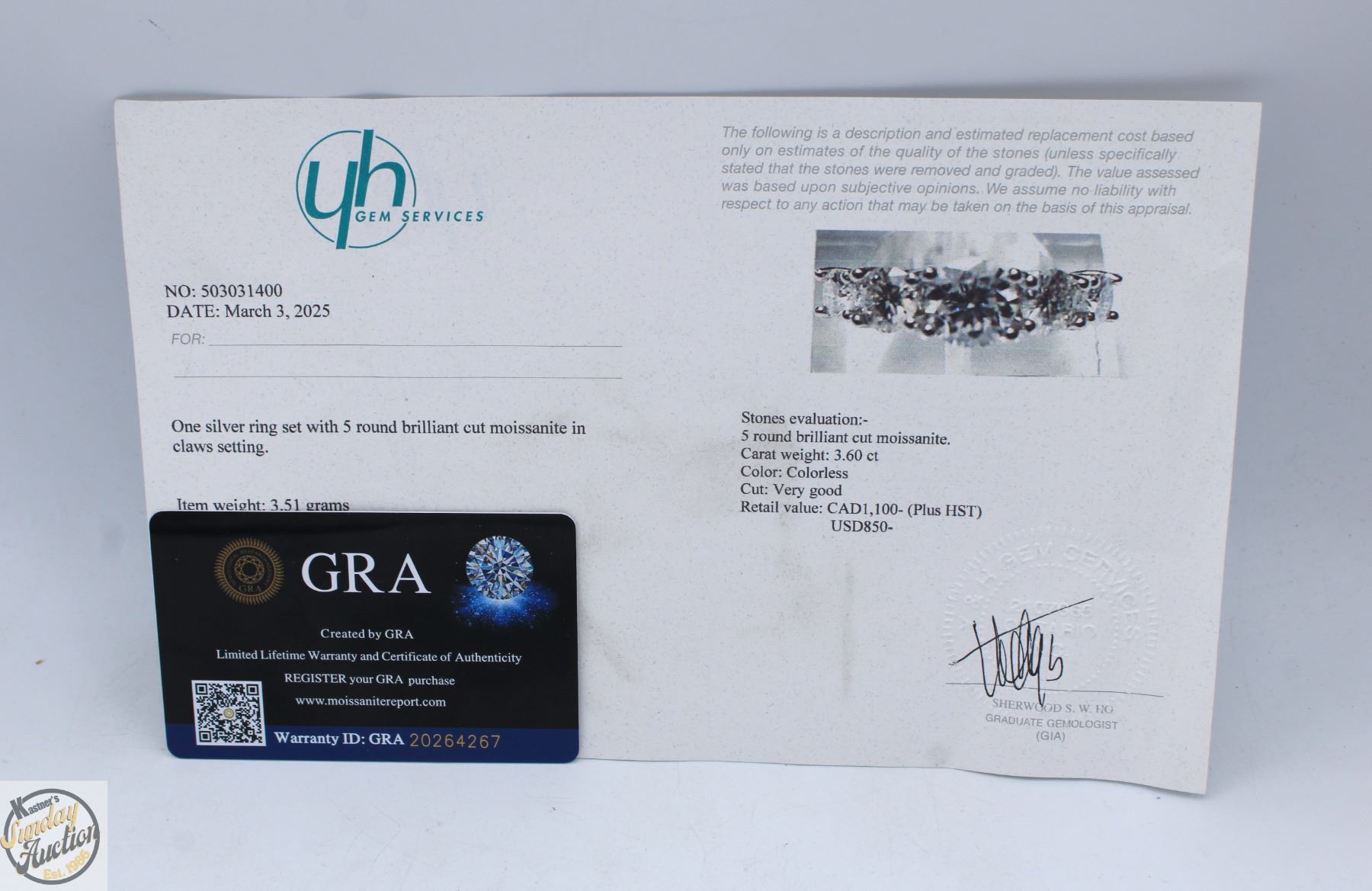 CUT MOISSANITE STONES VVS D COLOR WITH 5 STONES SET ON TOP GRADUATING DOWN IN SIZE FROM CENTER AND SET IN 925 SILVER RING SIZE 7 RETAIL VALUE $1,100.00 **ALL ITEMS MUST BE REMOVED BY 5PM SATURDAY, JANUARY 24TH 2026. ALL REMAINING ITEMS WILL BE SUBJECT TO A $6.00 PER DAY STORAGE CHARGE. ANY ITEMS REMAINING AFTER MONDAY, FEBRUARY 9TH 2026, WILL BE CONSIDERED FORFEITED. NO REFUNDS WILL BE ISSUED FOR FORFEITED ITEMS. TO SCHEDULE A PICK UP APPOINTMENT CLICK HERE