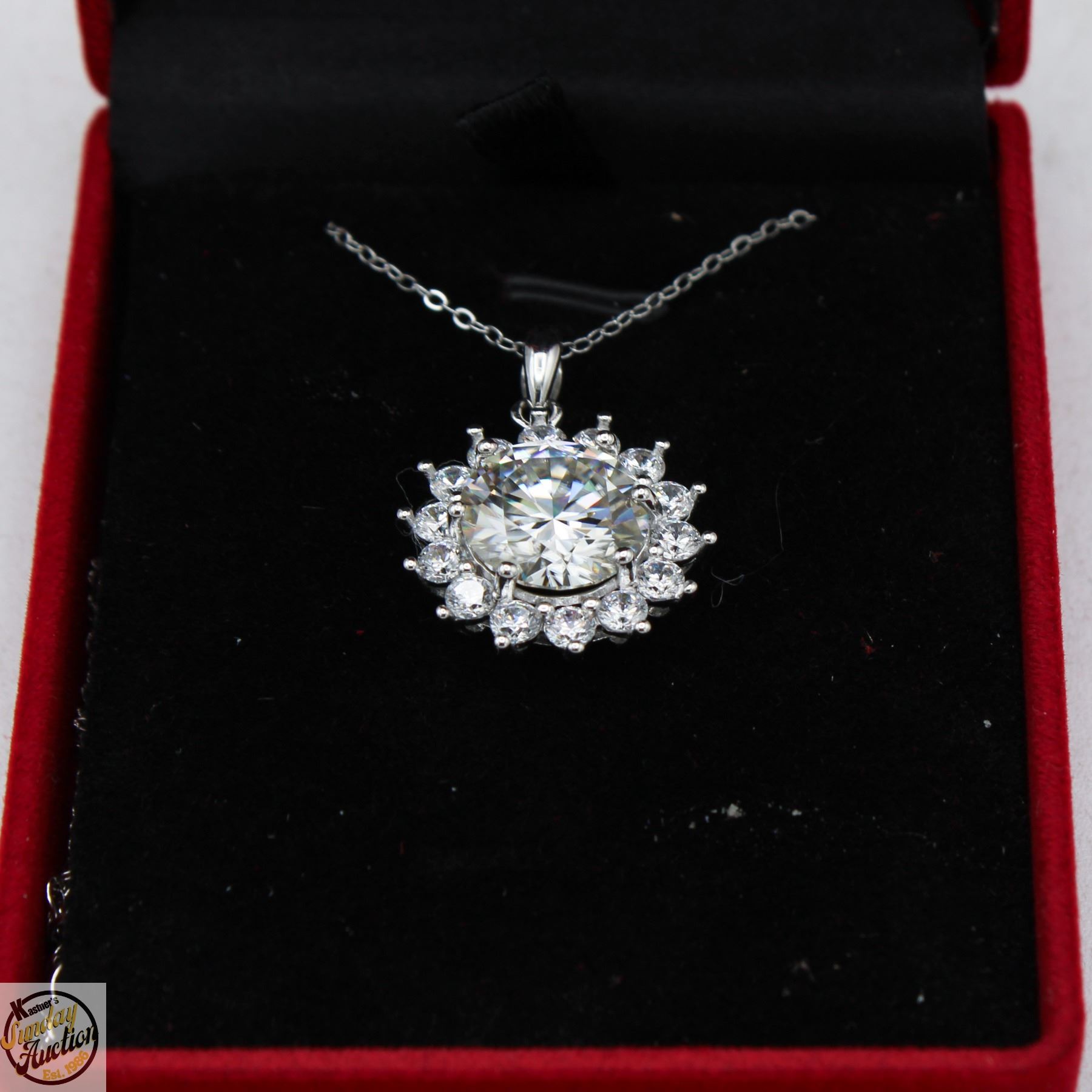 CUT MOISSANITE STONE VVS D COLOR WITH 14 ROUND BRILLIANT CUT CUBIC ZIRCONIA SET IN STAR SHAPED HALO AND SET IN 925 SILVER PENDANT RETAIL VALUE $1,375.00 **ALL ITEMS MUST BE REMOVED BY 5PM SATURDAY, JANUARY 24TH 2026. ALL REMAINING ITEMS WILL BE SUBJECT TO A $6.00 PER DAY STORAGE CHARGE. ANY ITEMS REMAINING AFTER MONDAY, FEBRUARY 9TH 2026, WILL BE CONSIDERED FORFEITED. NO REFUNDS WILL BE ISSUED FOR FORFEITED ITEMS. TO SCHEDULE A PICK UP APPOINTMENT CLICK HERE