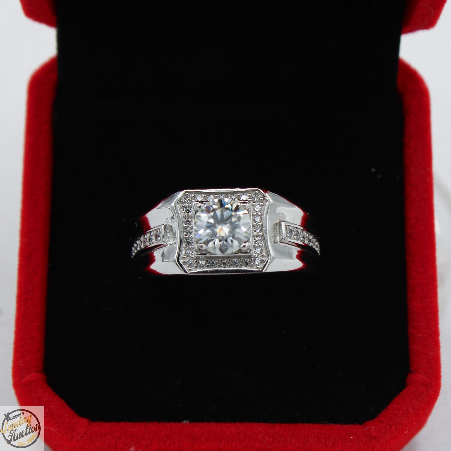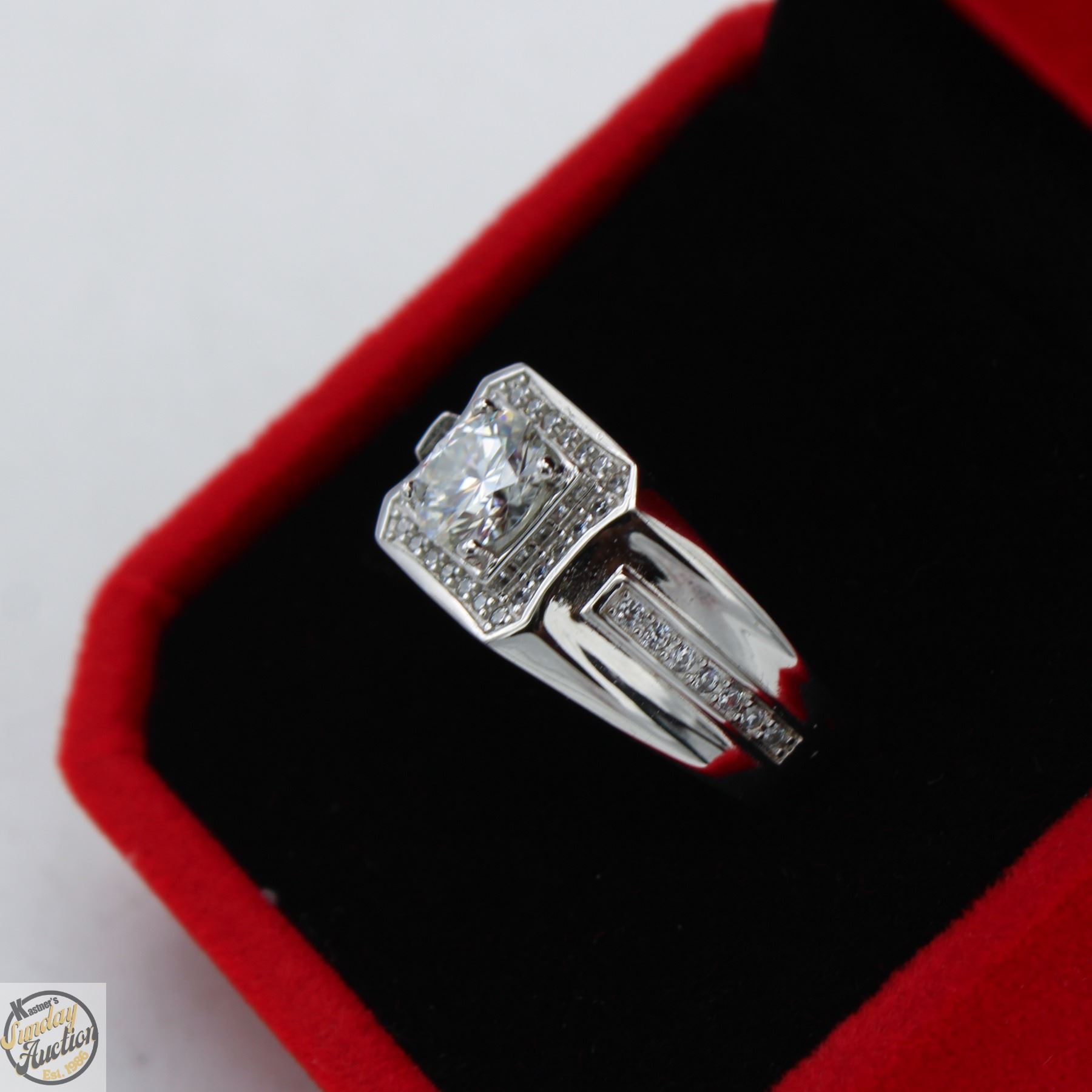 CUT MOISSANITE STONE VVS D COLOR SET IN CENTER WITH 38 ROUND BRILLIANT CUT CUBIC ZIRCONIA SET IN SQUARE HALO WITH SOME IN SHANKS SET IN 925 SILVER RING SIZE ADJUSTABLE **ALL ITEMS MUST BE REMOVED BY 5PM SATURDAY, FEBRUARY 14TH 2025. ALL REMAINING ITEMS WILL BE SUBJECT TO A $6.00 PER DAY STORAGE CHARGE. ANY ITEMS REMAINING AFTER MONDAY, MARCH 2ND 2025 WILL BE CONSIDERED FORFEITED. NO REFUNDS WILL BE ISSUED FOR FORFEITED ITEMS. TO SCHEDULE A PICK UP APPOINTMENT CLICK HERE