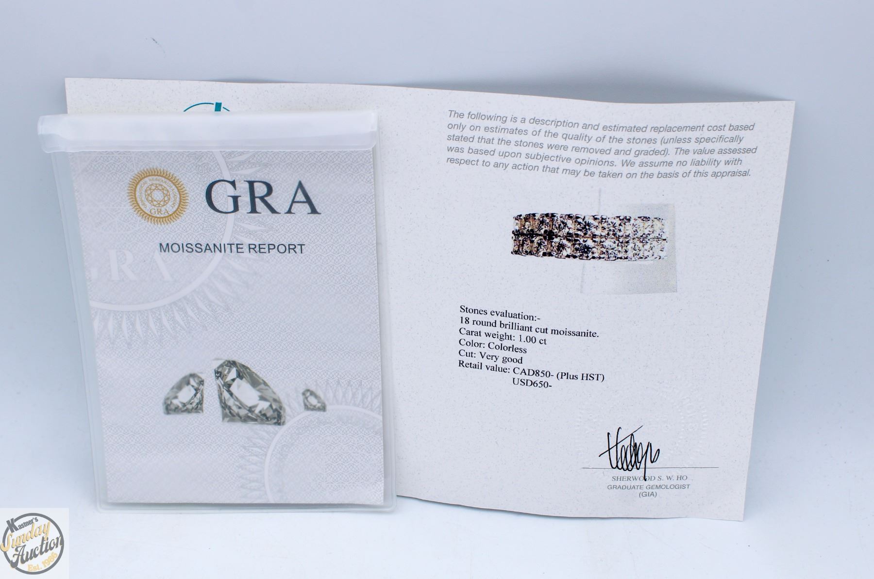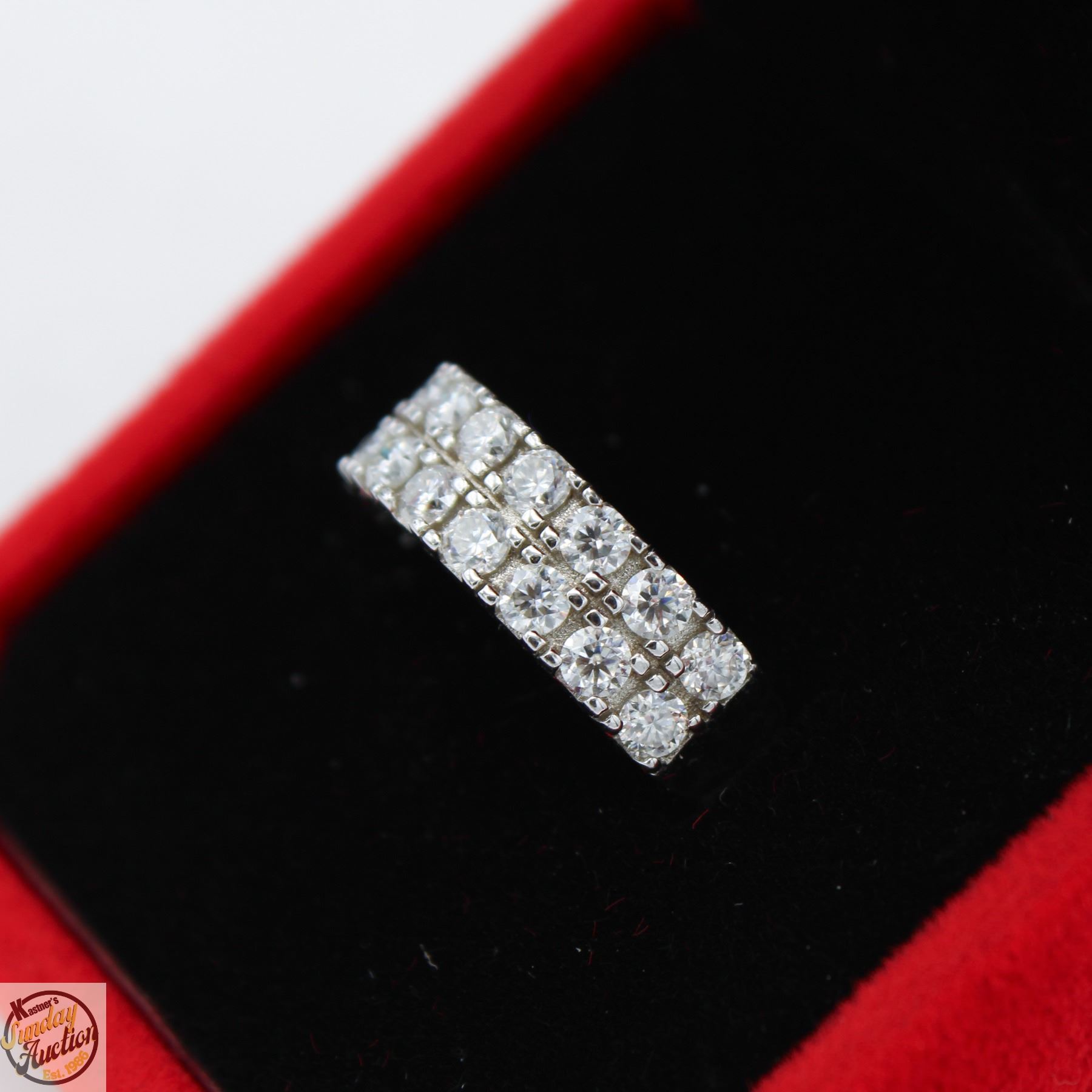 BRILLIANT CUT MOISSANITE STONES VVS D COLOR WITH THE 18 MOISSANITE STONES SET IN 2 ROWS ACROSS THE TOP SET IN 925 SILVER RING SIZE 6 RETAIL VALUE $750.00 **ALL ITEMS MUST BE REMOVED BY 5PM SATURDAY, FEBRUARY 14TH 2025. ALL REMAINING ITEMS WILL BE SUBJECT TO A $6.00 PER DAY STORAGE CHARGE. ANY ITEMS REMAINING AFTER MONDAY, MARCH 2ND 2025 WILL BE CONSIDERED FORFEITED. NO REFUNDS WILL BE ISSUED FOR FORFEITED ITEMS. TO SCHEDULE A PICK UP APPOINTMENT CLICK HERE